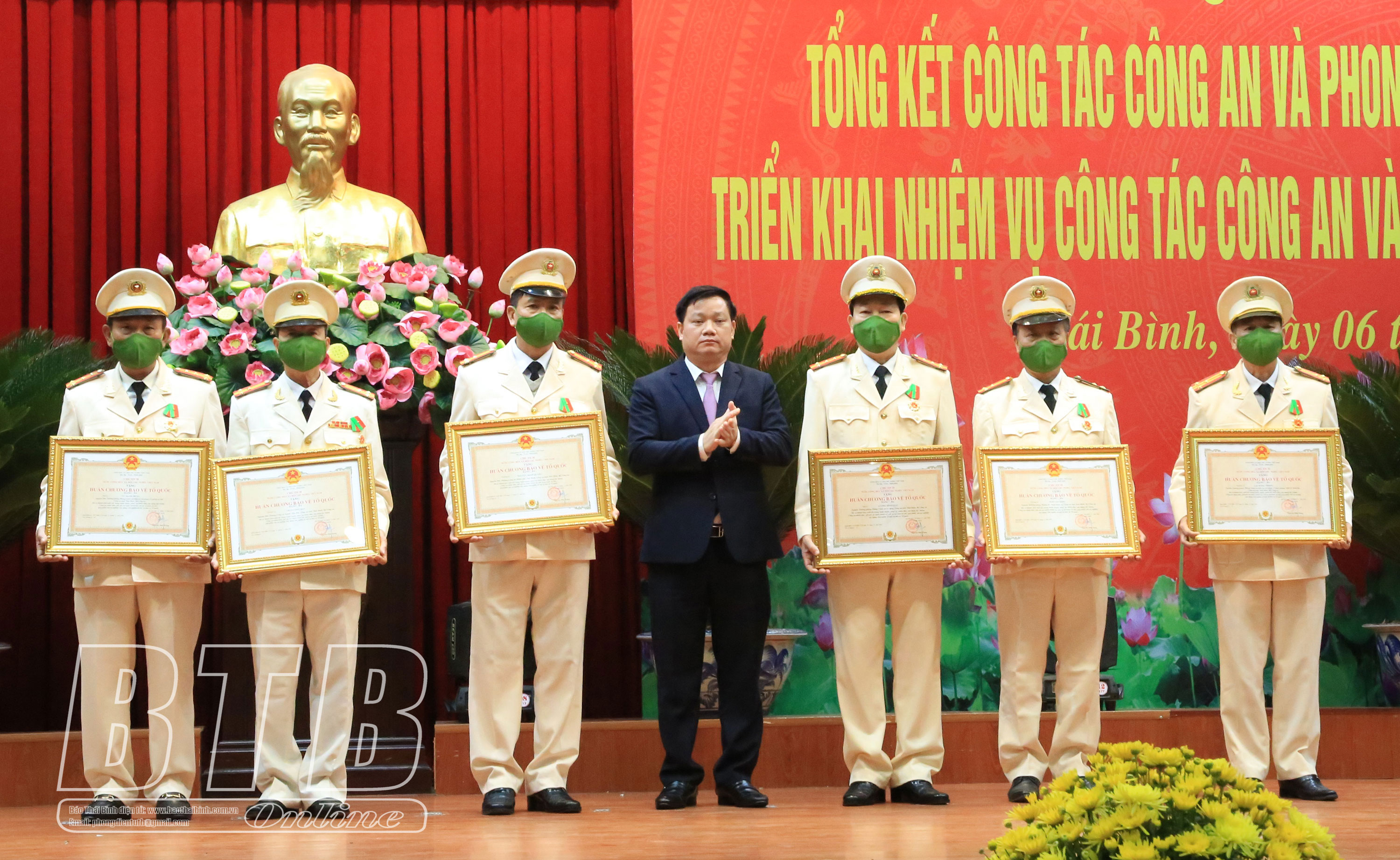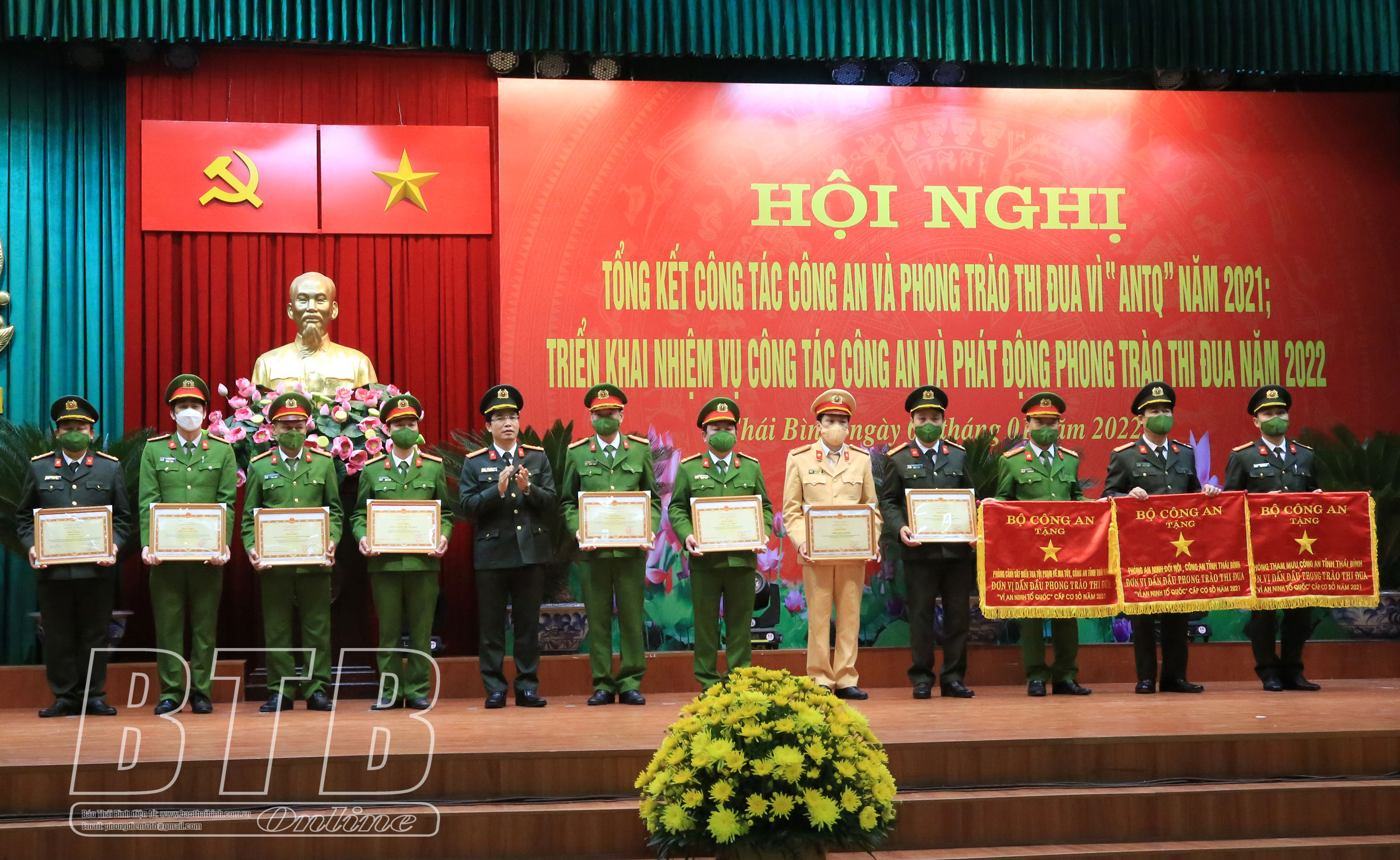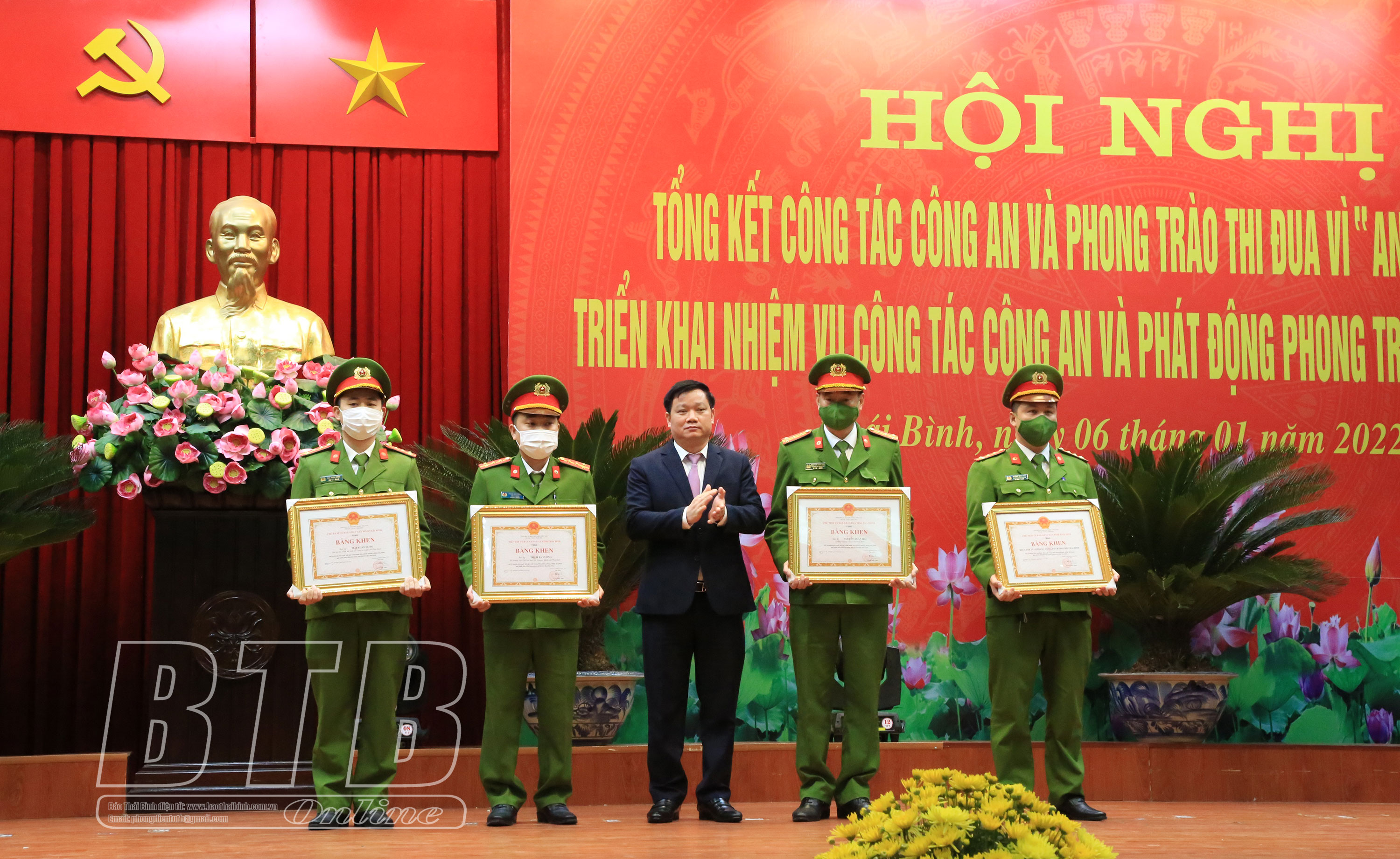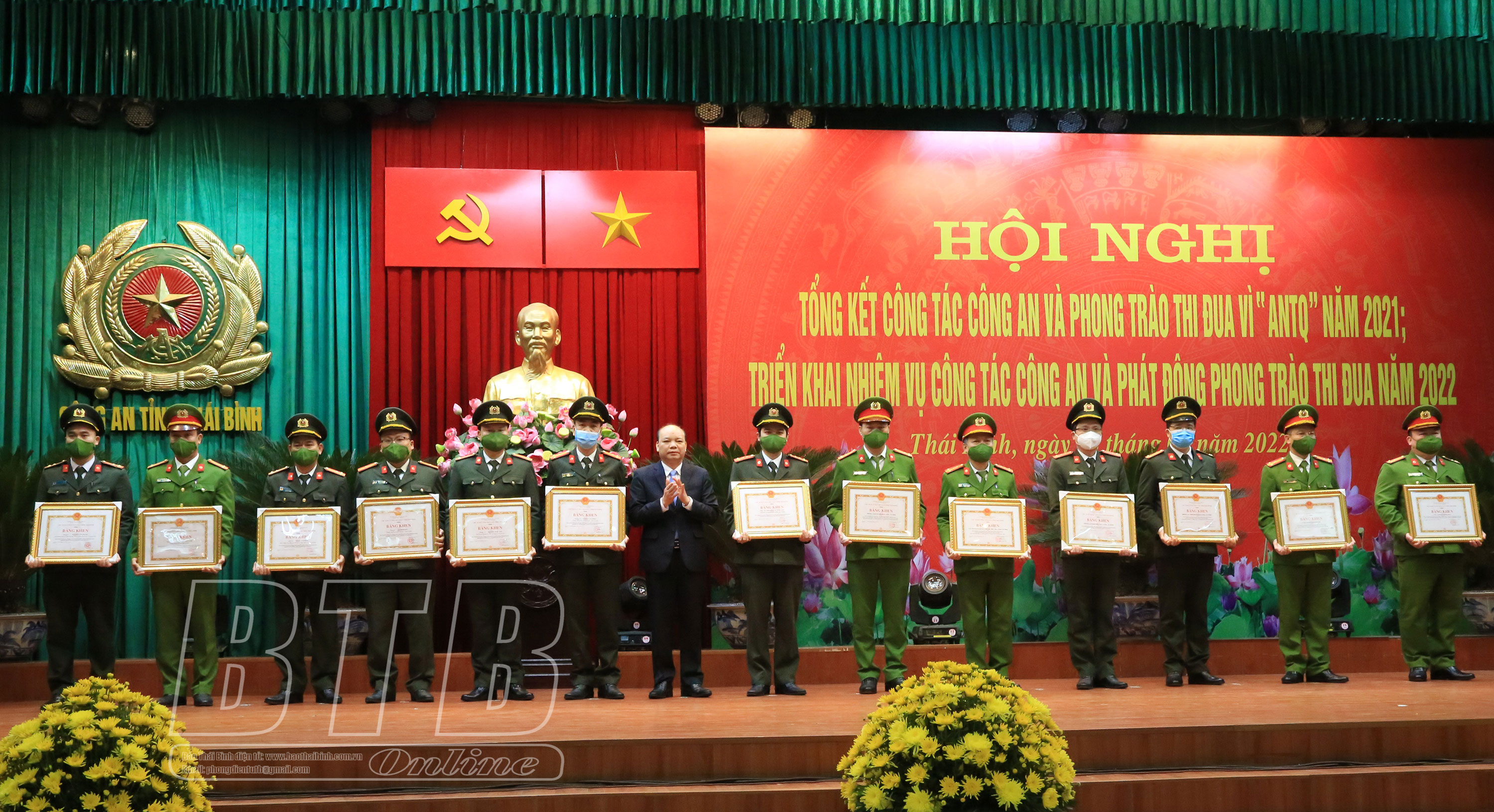 Nhân dịp này, đồng chí Phó Bí thư Tỉnh ủy, Chủ tịch UBND tỉnh trao bằng khen đột xuất cho 1 tập thể, 3 cá nhân có thành tích xuất sắc trong công tác điều tra, triệt phá thành công vụ đánh bạc qua mạng dưới hình thức cá độ bóng đá liên tỉnh với quy mô hơn 8.400 tỷ đồng vừa qua. Ngoài ra, nhiều tập thể, cá nhân trong lực lượng Công an Thái Bình được nhận bằng khen, cờ thi đua của Bộ Công an, UBND tỉnh và các danh hiệu thi đua năm 2021.