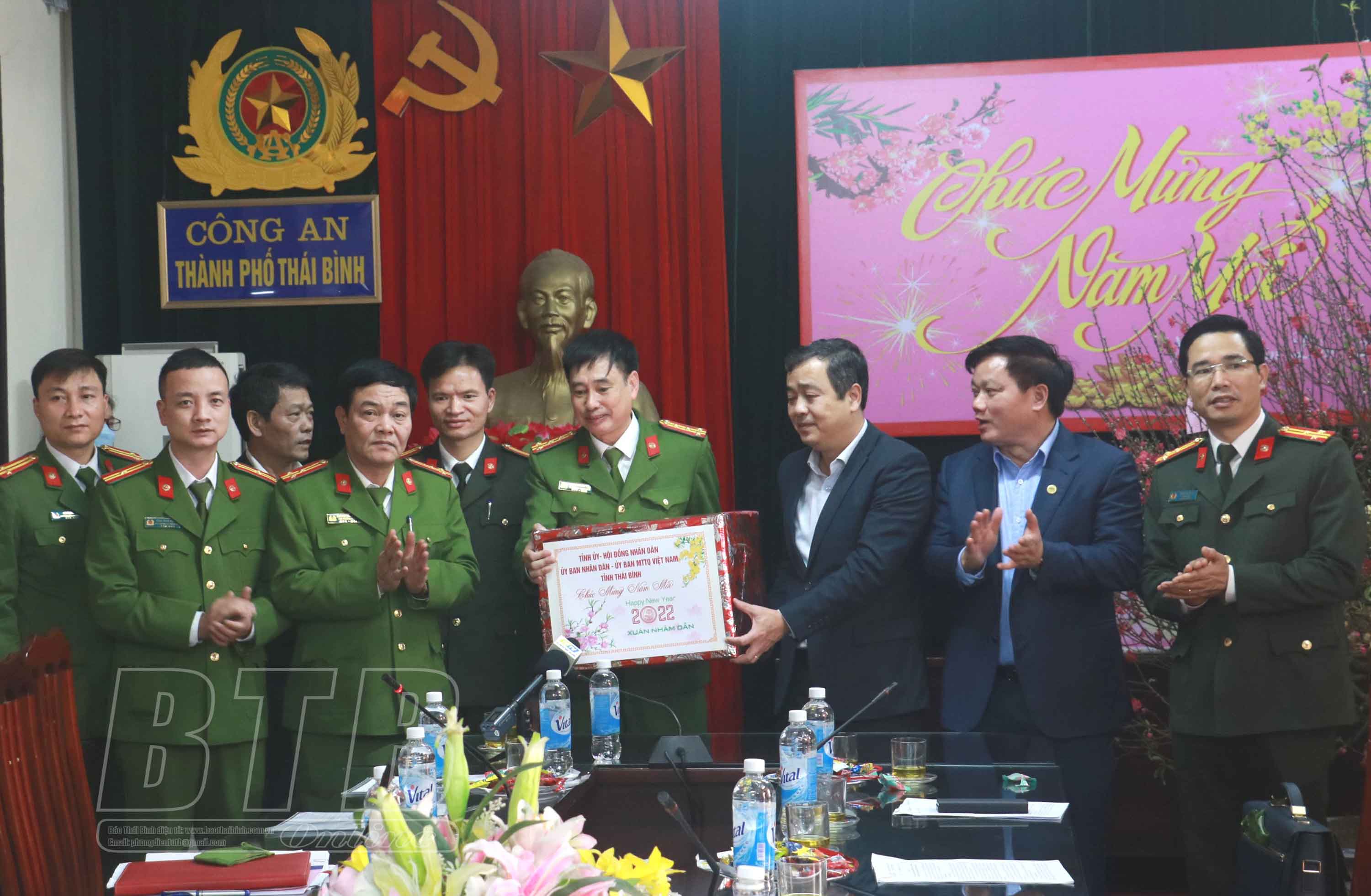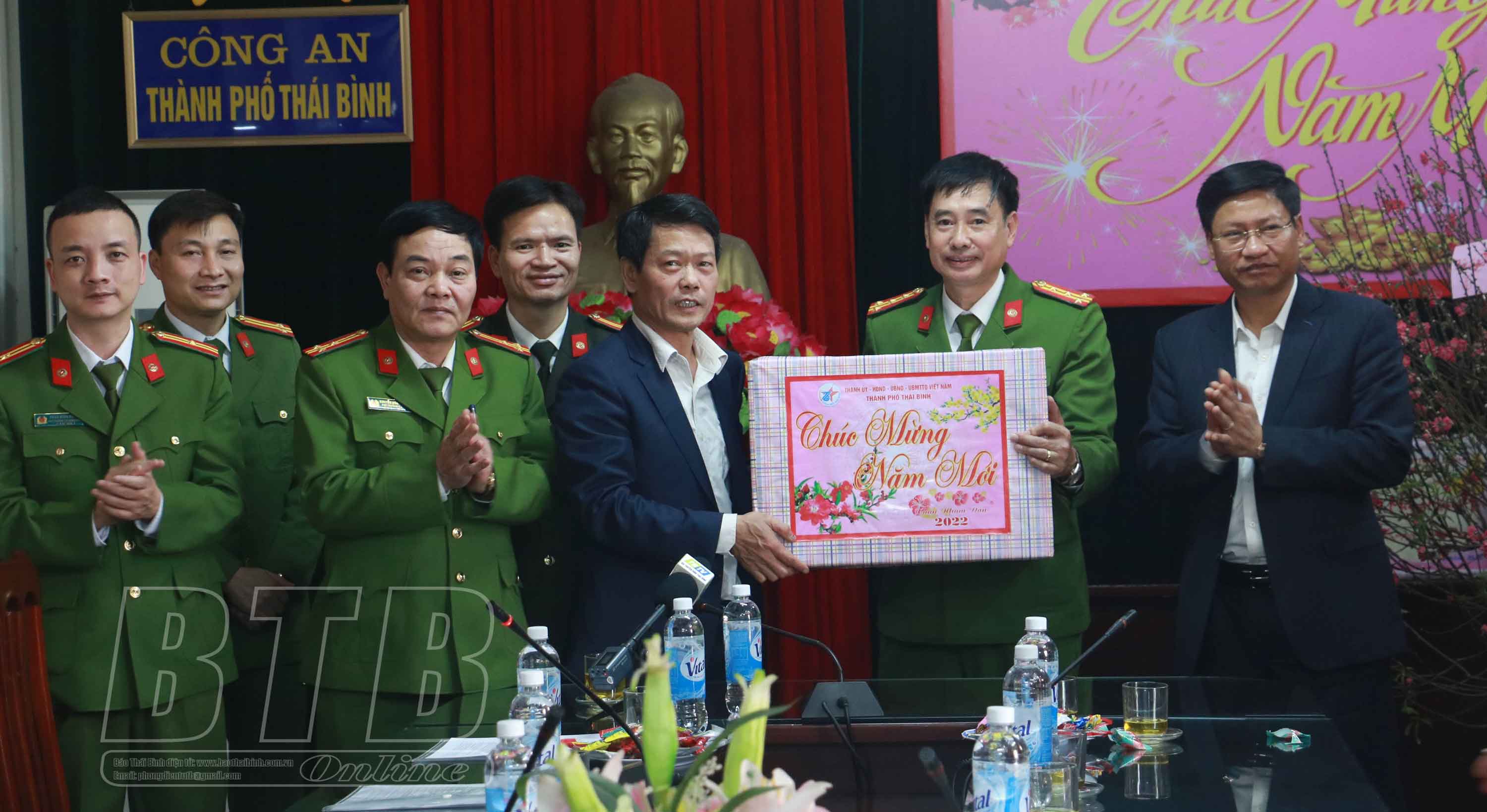 Nhân dịp này, đồng chí Bí thư Tỉnh ủy và đồng chí Phó Bí thư Tỉnh ủy, Chủ tịch UBND tỉnh cùng các đồng chí lãnh đạo tỉnh đã tặng quà, chúc tết cán bộ, chiến sĩ Công an thành phố Thái Bình.