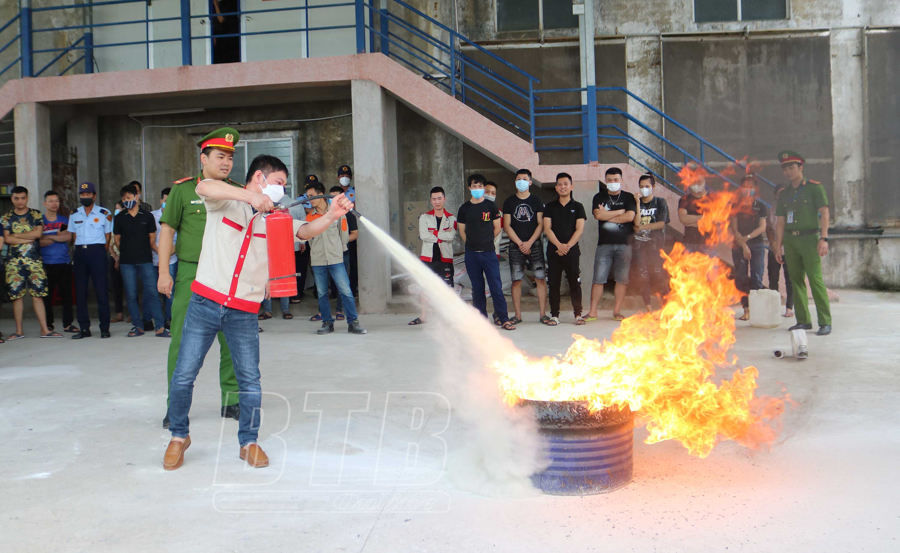 Công nhân Công ty TNHH Araviet, khu công nghiệp huyện Tiền Hải (Tiền Hải) thực hành kỹ năng sử dụng bình chữa cháy dập tắt đám cháy.