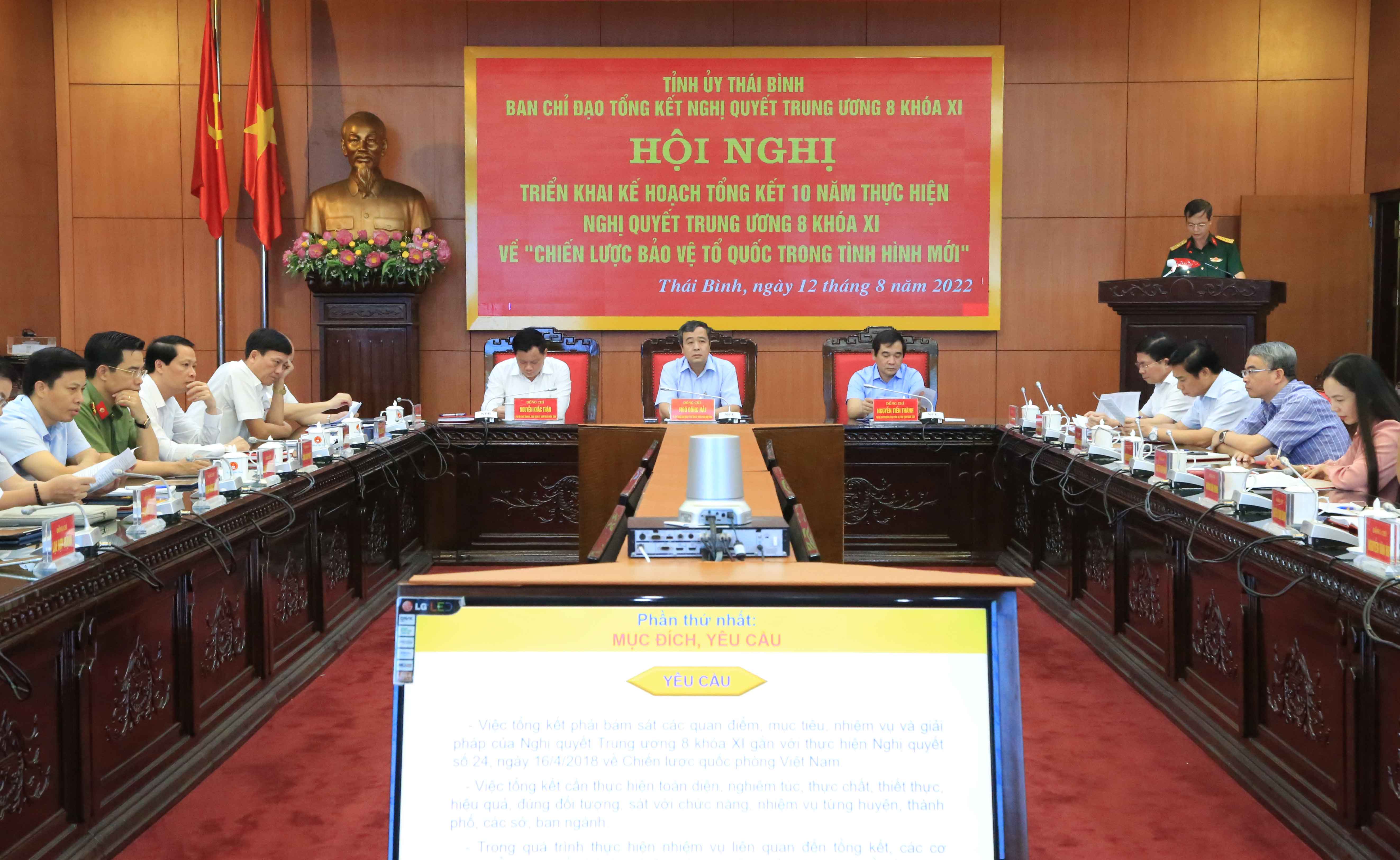 Hội nghị đã thông qua quyết định và kế hoạch của Ban Thường vụ Tỉnh ủy về thành lập Ban Chỉ đạo tỉnh, tổng kết 10 năm thực hiện Nghị quyết Trung ương 8 (khóa XI) về “Chiến lược bảo vệ Tổ quốc trong tình hình mới”, hướng dẫn việc tổng kết. Thông qua đó, nhằm đánh giá toàn diện tình hình và kết quả thực hiện Nghị quyết Trung ương 8 (khóa XI) trong 10 năm năm (2013 – 2023); chỉ rõ những ưu điểm, kết quả nổi bật; những hạn chế, khuyết điểm, nguyên nhân và những bài học kinh nghiệm rút ra trong quá trình thực hiện Nghị quyết; xác định phương hướng, mục tiêu, quan điểm, phương châm chỉ đạo, nhiệm vụ và giải pháp bảo vệ Tổ quốc trong những năm tiếp theo. Qua tổng kết góp phần nâng cao nhận thức, trách nhiệm của các cấp ủy, tổ chức đảng, hệ thống chính trị, cán bộ, đảng viên, lực lượng vũ trang và các tầng lớp nhân dân đối với nhiệm vụ bảo vệ Tổ quốc trong tình hình mới. Việc tổng kết phải bám sát các quan điểm, mục tiêu, nhiệm vụ, giải pháp của Nghị quyết gắn với thực hiện Nghị quyết số 24-NQ/TW ngày 16/4/2018 của Bộ Chính trị về “Chiến lược Quốc phòng Việt Nam”. Tổng kết Nghị quyết cần thực hiện toàn diện, nghiêm túc, thực chất, thiết thực, hiệu quả, đúng đối tượng, sát với chức năng, nhiệm vụ của từng ngành, địa phương, đơn vị; trong quá trình thực hiện nhiệm vụ chấp hành nghiêm các quy định của pháp luật về bảo vệ bí mật Nhà nước. Việc tổng kết thực hiện Nghị quyết được tiến hành ở các cấp, mốc thời gian đánh giá kết quả từ tháng 10/2013 (thời gian ban hành Nghị quyết) đến hết năm 2022 (thời gian tổ chức tổng kết). Đối với cấp huyện và tương đương tổ chức tổng kết và hoàn thành trước ngày 15/11/2022; đối với cấp tỉnh, tổ chức tổng kết và hoàn thành trước ngày 15/3/2023.