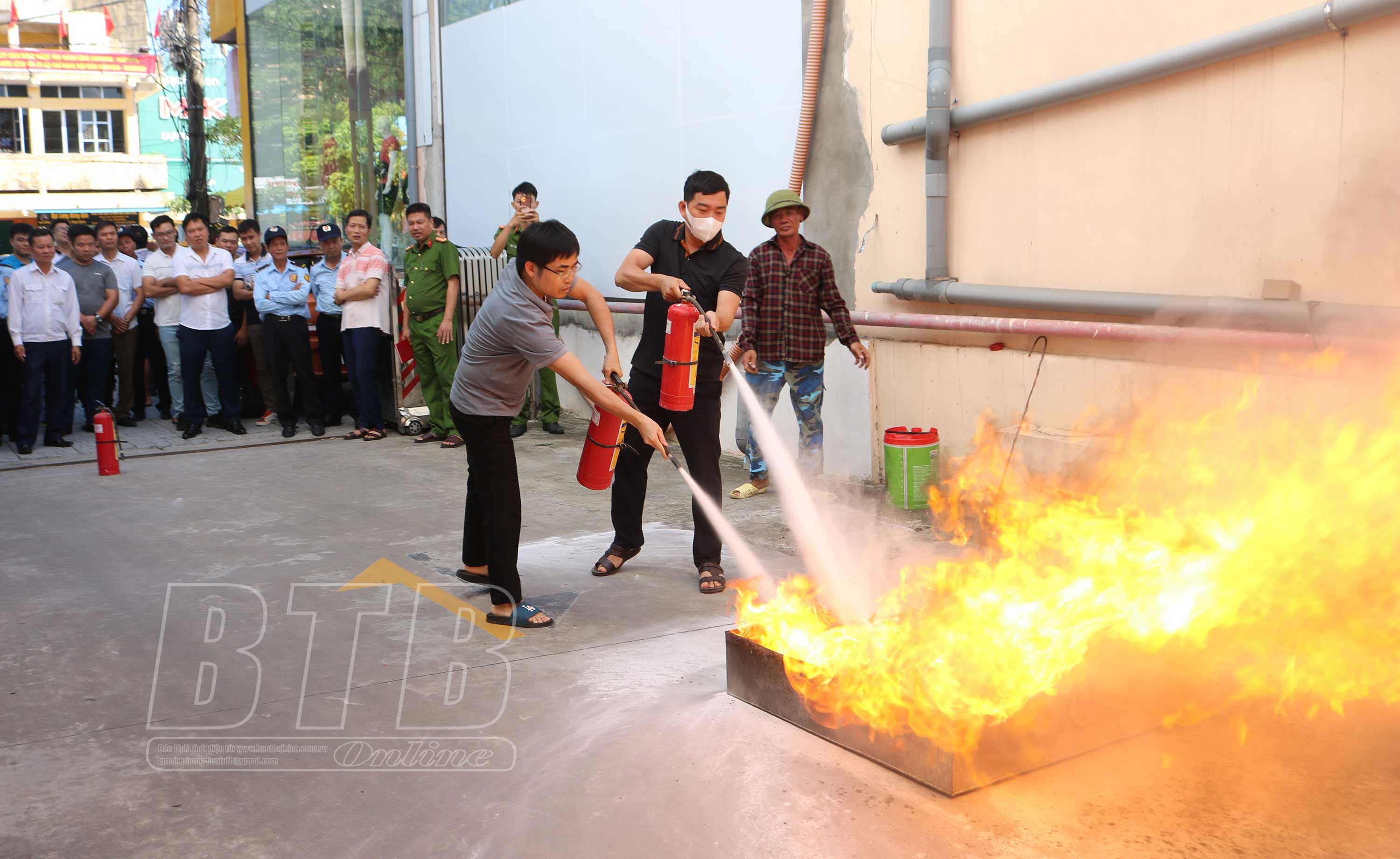 Nhân viên Ngân hàng Thương mại cổ phần Công thương Việt Nam Chi nhánh Thái Bình thực hành dập tắt đám cháy với thiết bị chữa cháy mô hình.