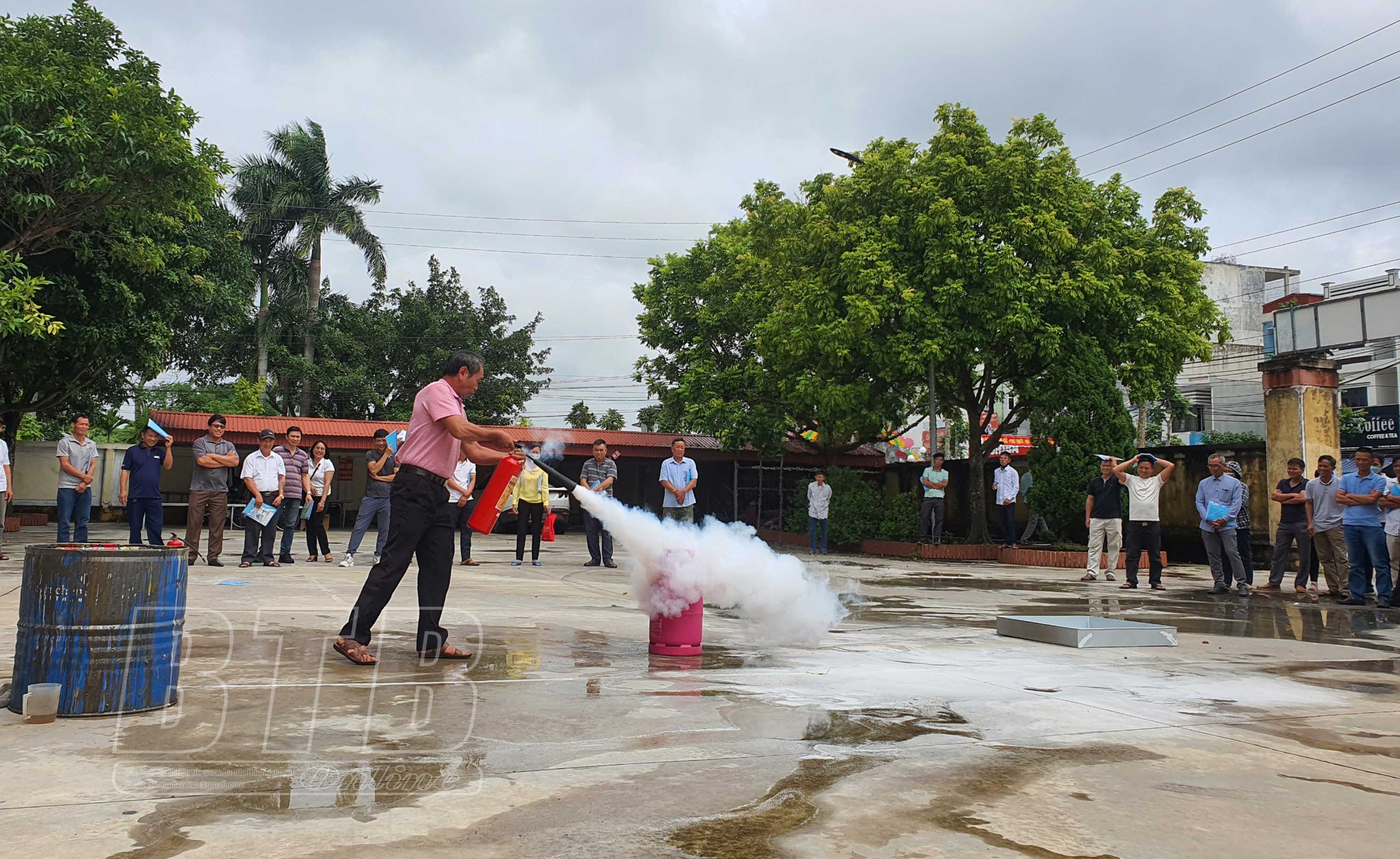 Công an huyện Kiến Xương hướng dẫn người dân sử dụng các thiết bị chữa cháy tại chỗ.