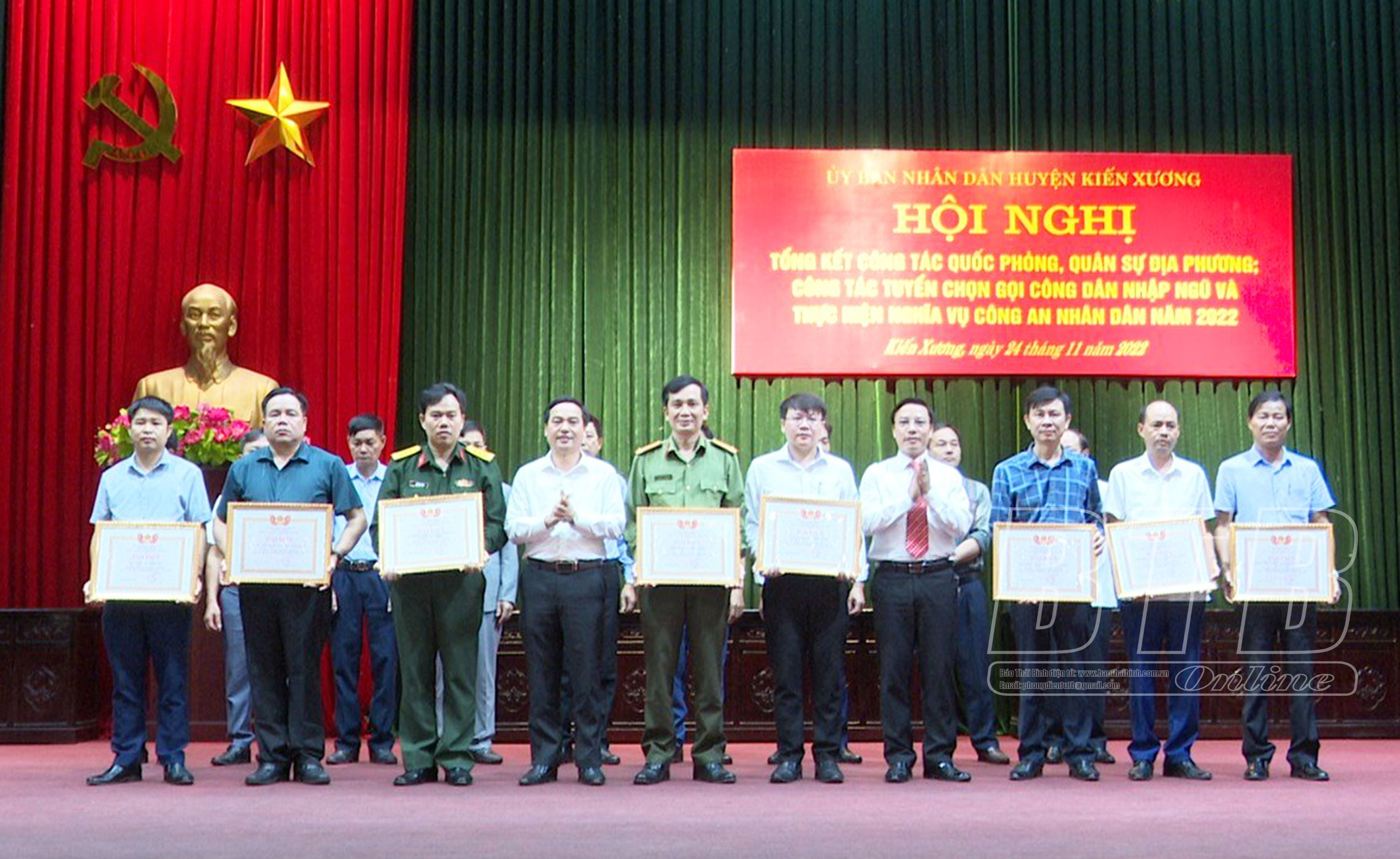Nhân dịp này, UBND huyện Kiến Xương đã khen thưởng các tập thể, cá nhân có thành tích xuất sắc trong công tác quốc phòng, quân sự địa phương; công tác chuyển chọn gọi công dân nhập ngũ và thực hiện nghĩa vụ Công an nhân dân năm 2022.