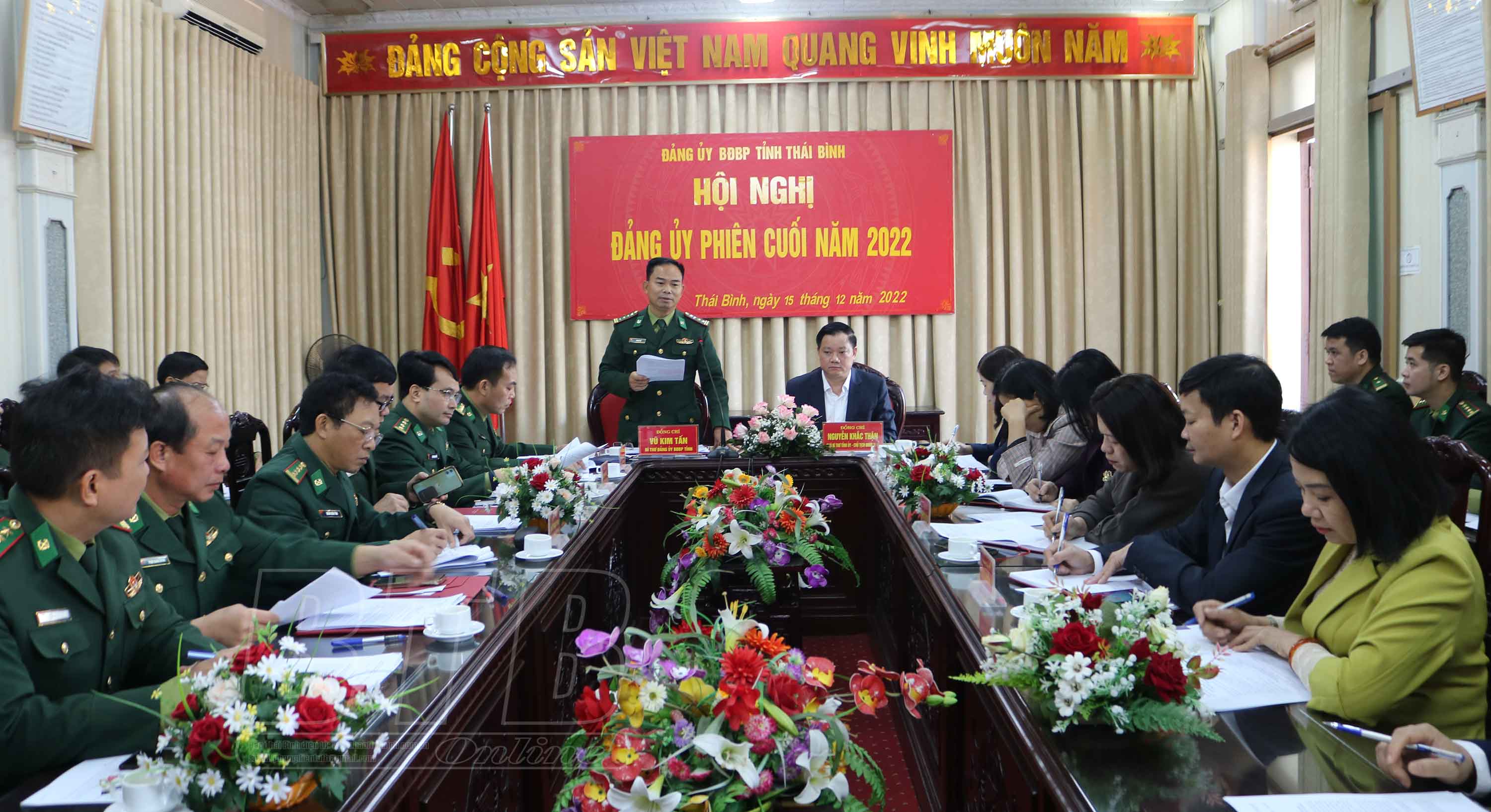 Phát biểu tại hội nghị, đồng chí Nguyễn Khắc Thận, Phó Bí thư Tỉnh ủy, Chủ tịch UBND tỉnh ghi nhận những kết quả BĐBP tỉnh đạt được trong năm 2022. Đồng chí nhấn mạnh, năm 2023 tỉnh xác định là năm bản lề, có ý nghĩa rất quan trọng trong phát triển kinh tế - xã hội để thực hiện thắng lợi mục tiêu Nghị quyết Đại hội Đảng bộ tỉnh lần thứ XX đã đề ra. Lực lượng BĐBP đóng vai trò rất quan trọng trong việc hiện thực hóa các mục tiêu khai thác tiềm năng, phát triển kinh tế biển tạo động lực cho tăng trưởng kinh tế của tỉnh. Đảng ủy, Bộ Chỉ huy BĐBP tỉnh tiếp tục phát huy tinh thần đoàn kết, thống nhất, kỷ cương, trách nhiệm; giữ vững nguyên tắc tập trung dân chủ, phát huy tinh thần nêu gương của người đứng đầu để lãnh đạo, xây dựng lực lượng hoàn thành xuất sắc các nhiệm vụ, công tác biên phòng. Tiếp tục khẳng định và phát huy tốt vai trò của cán bộ, đảng viên trong củng cố hệ thống chính trị cơ sở, phối hợp cùng cấp ủy, chính quyền các cấp rà soát, quản lý chặt chẽ, đúng quy định của pháp luật các nguồn tài nguyên, khoáng sản trong khu vực biển của tỉnh. Tập trung thực hiện tốt các nhiệm vụ phòng, chống khai thác hải sản bất hợp pháp, không báo cáo và không theo quy định; phòng chống tội phạm, gian lận thương mại; phòng chống thiên tai, tìm kiếm cứu nạn, bảo đảm an ninh trật tự, trật tự an toàn xã hội trên khu vực biên giới biển.