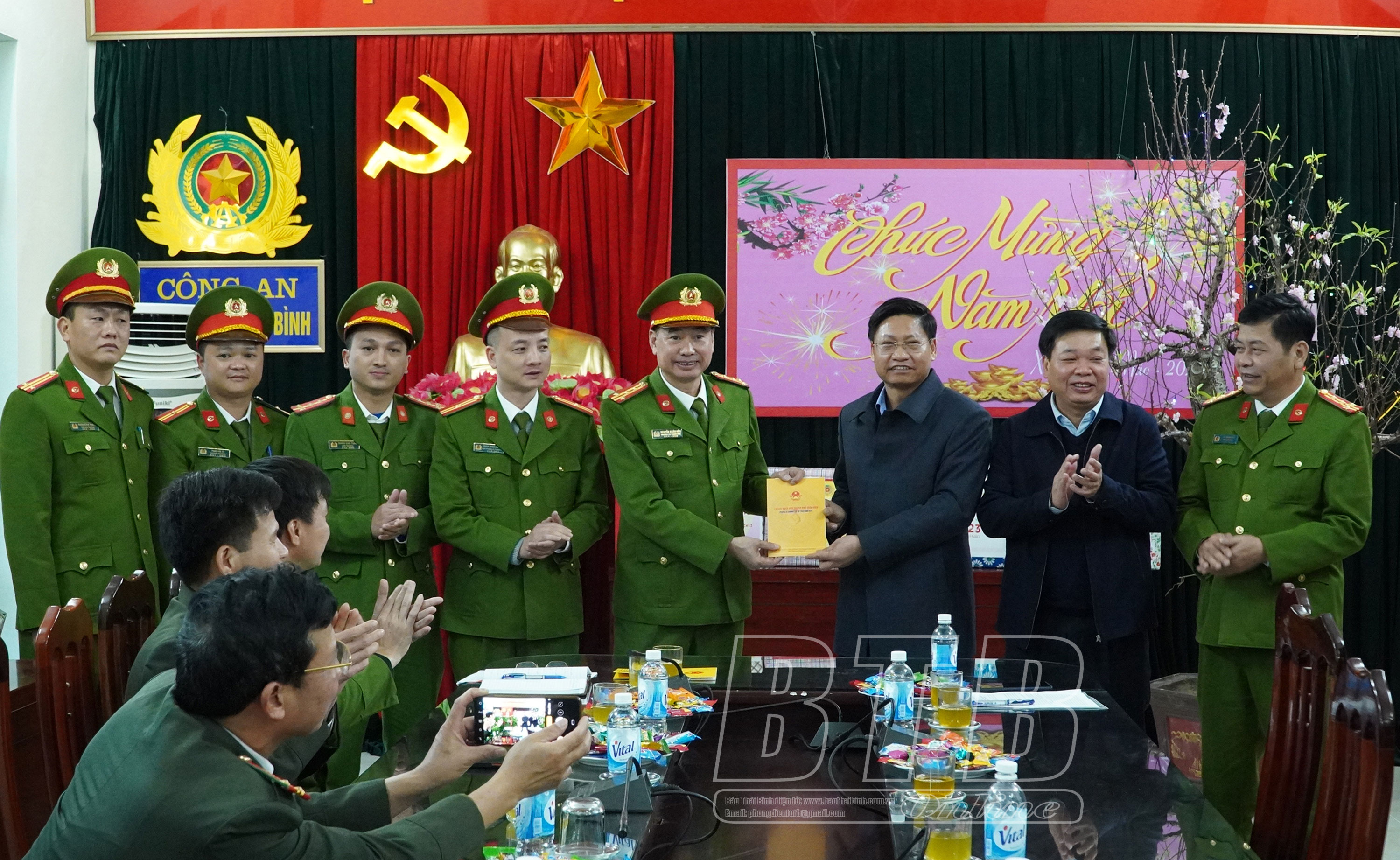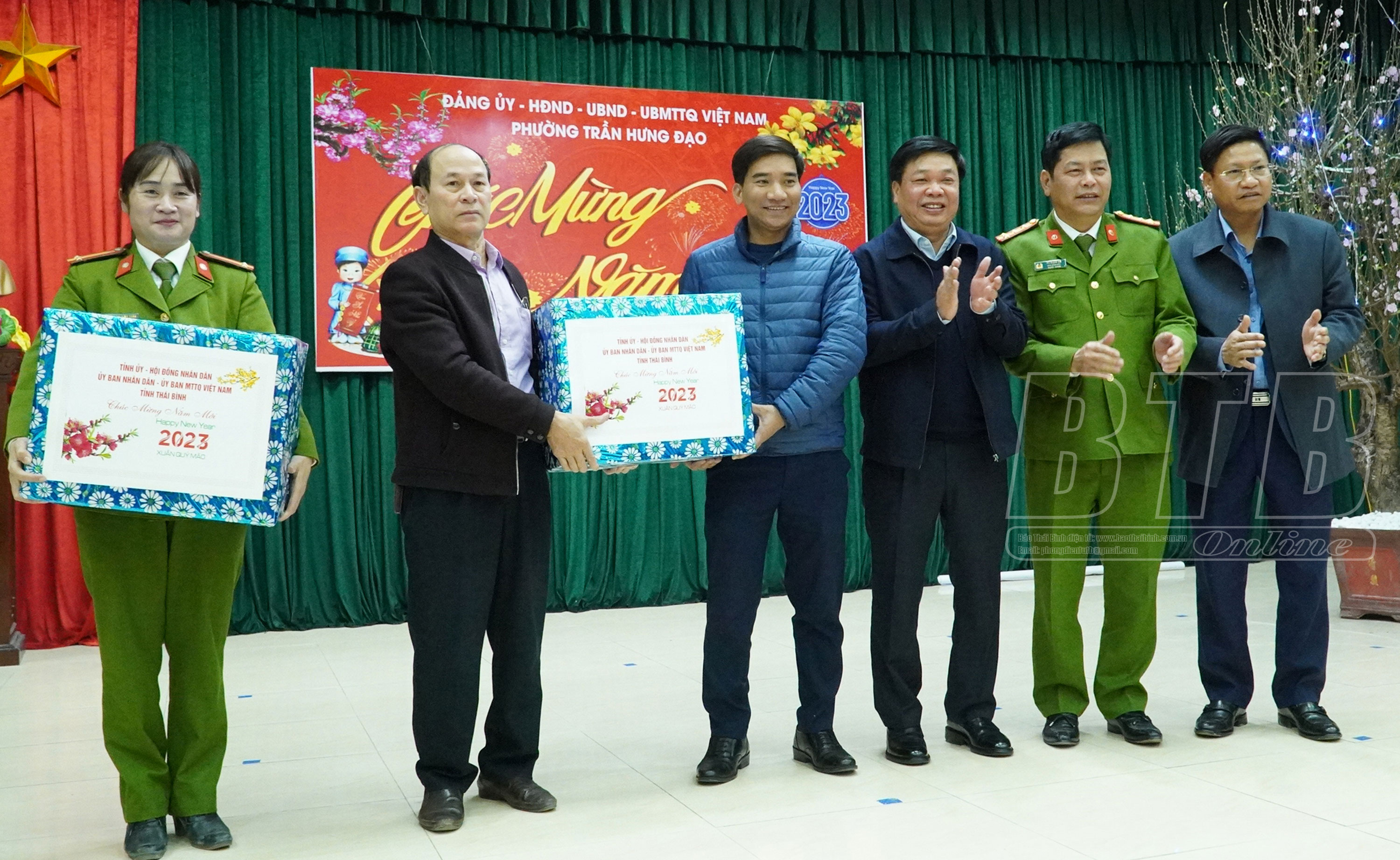Thay mặt Tỉnh ủy, HĐND, UBND, Ủy ban MTTQ Việt Nam tỉnh, đồng chí Phó Chủ tịch thường trực UBND tỉnh đã tặng quà và chúc tết cán bộ, chiến sỹ làm nhiệm vụ bảo đảm an ninh chính trị, trật tự an toàn xã hội dịp tết Nguyên đán Quý Mão 2023 của phường Trần Hưng Đạo và Công an thành phố Thái Bình.