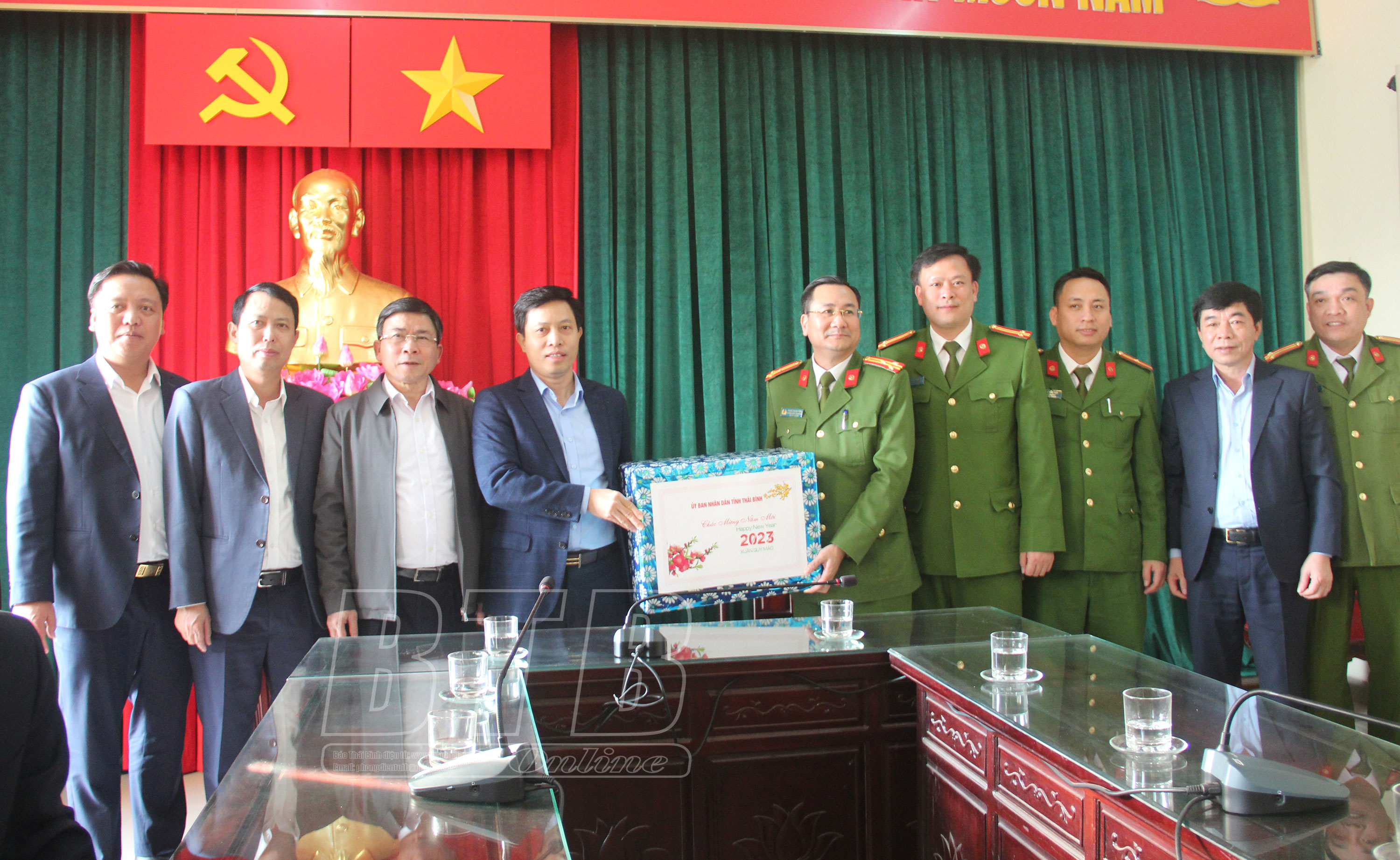 Các đồng chí lãnh đạo tỉnh tặng quà chúc tết cán bộ, chiến sĩ Công an huyện Tiền Hải.