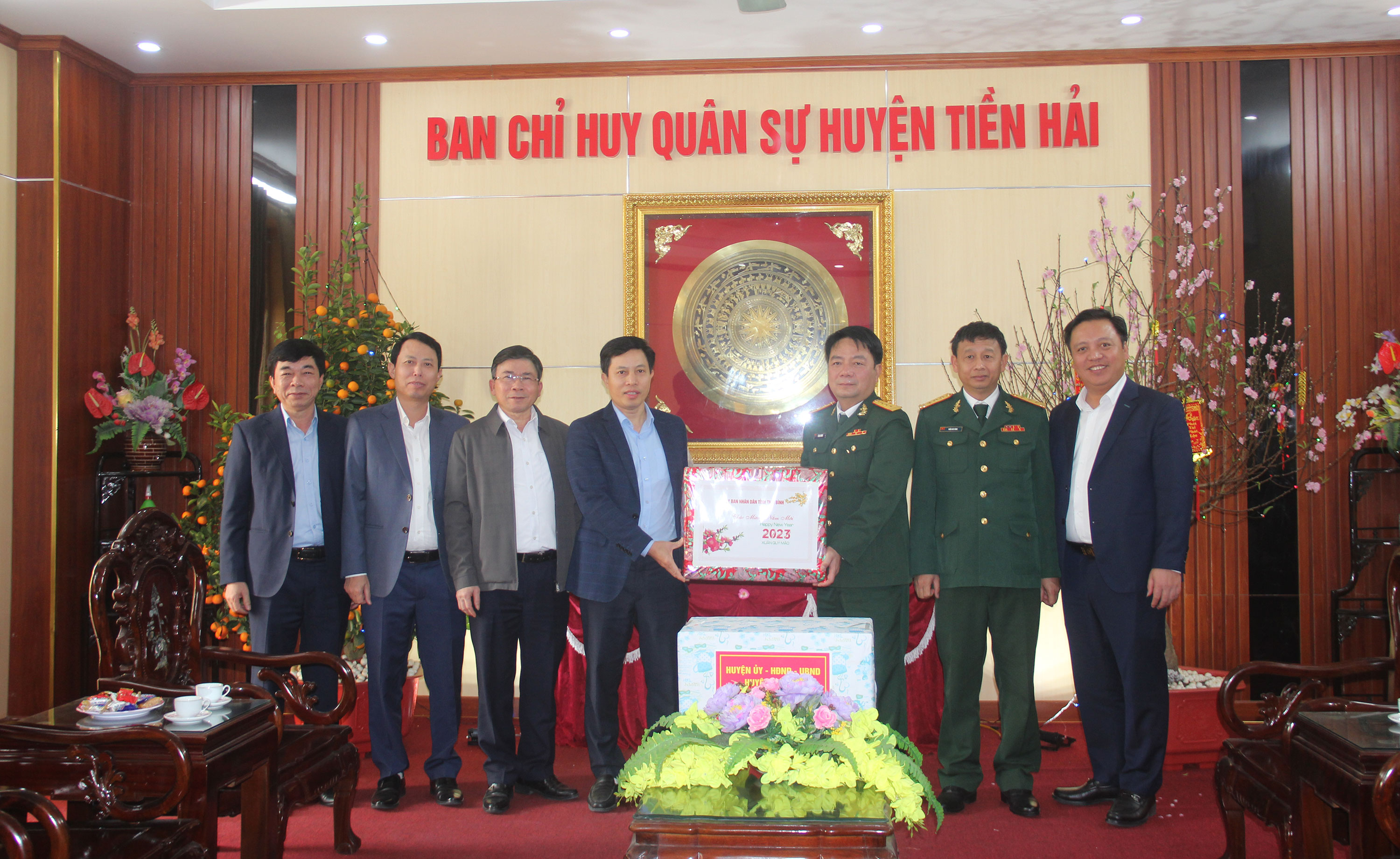 Các đồng chí lãnh đạo tỉnh tặng quà chúc tết cán bộ, chiến sĩ Ban Chỉ huy Quân sự huyện Tiền Hải.