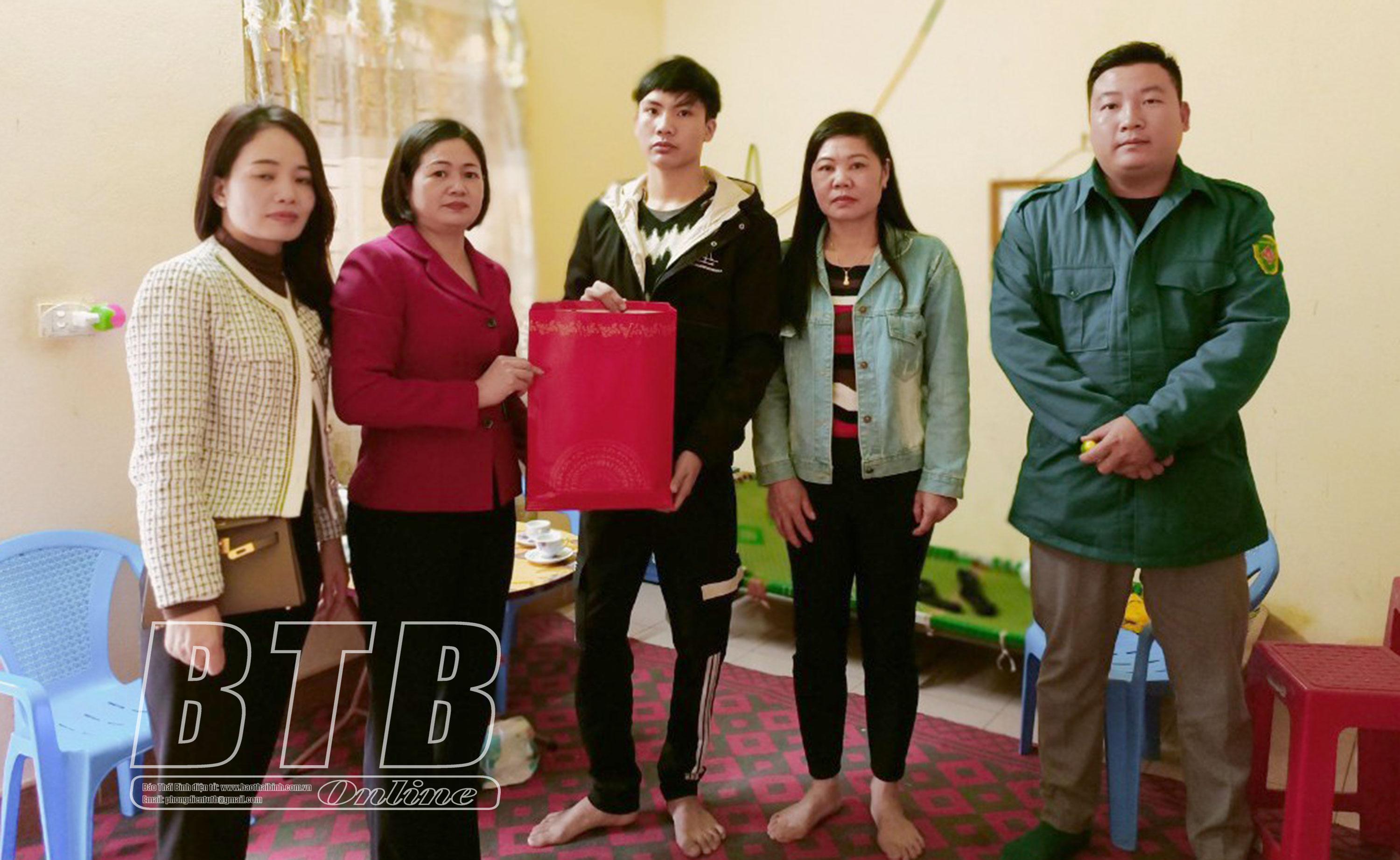 Lãnh đạo Bộ CHQS tỉnh và Ban CHQS huyện Hưng Hà tặng quà động viên tân binh có hoàn cảnh khó khăn trước khi nhập ngũ.