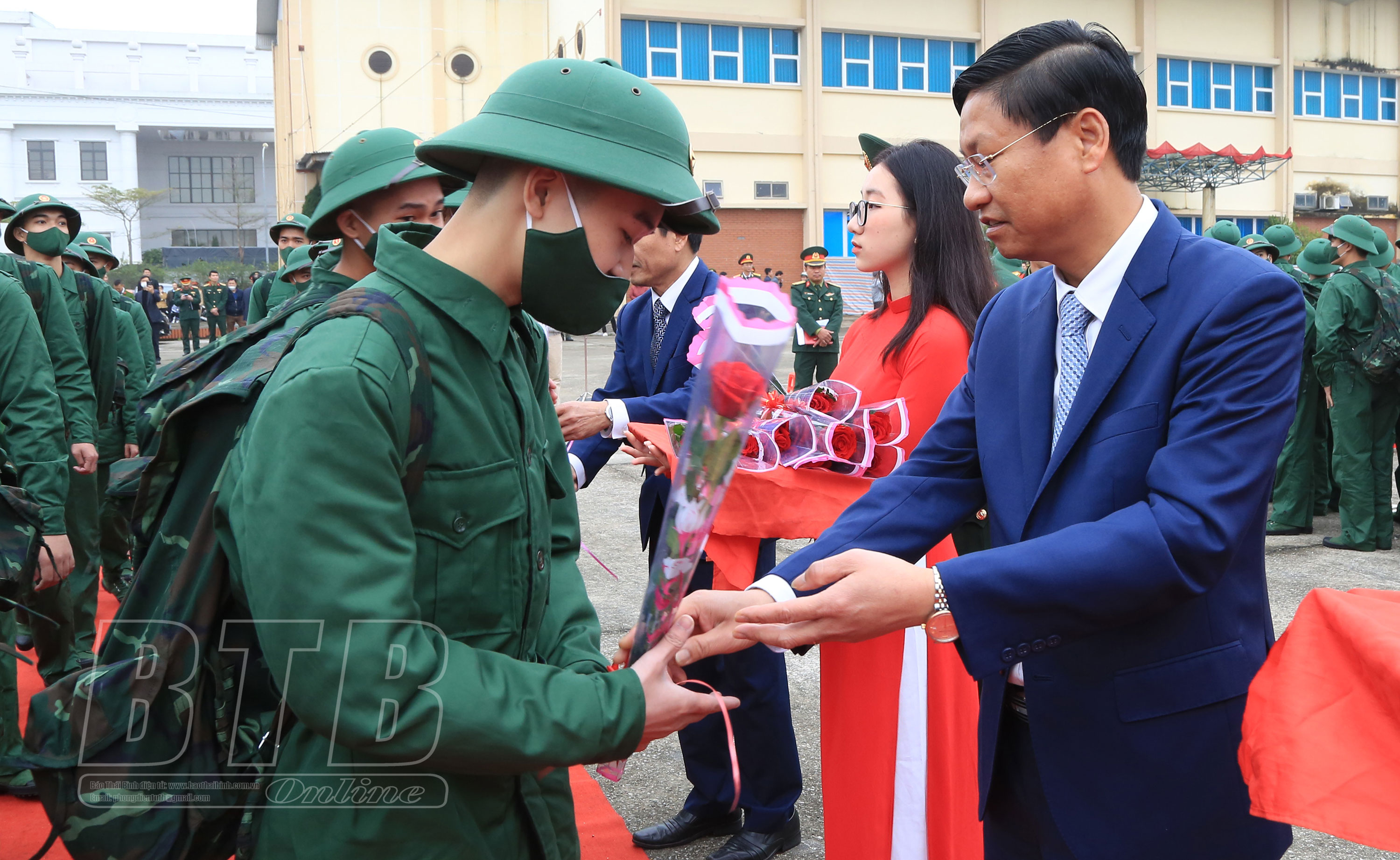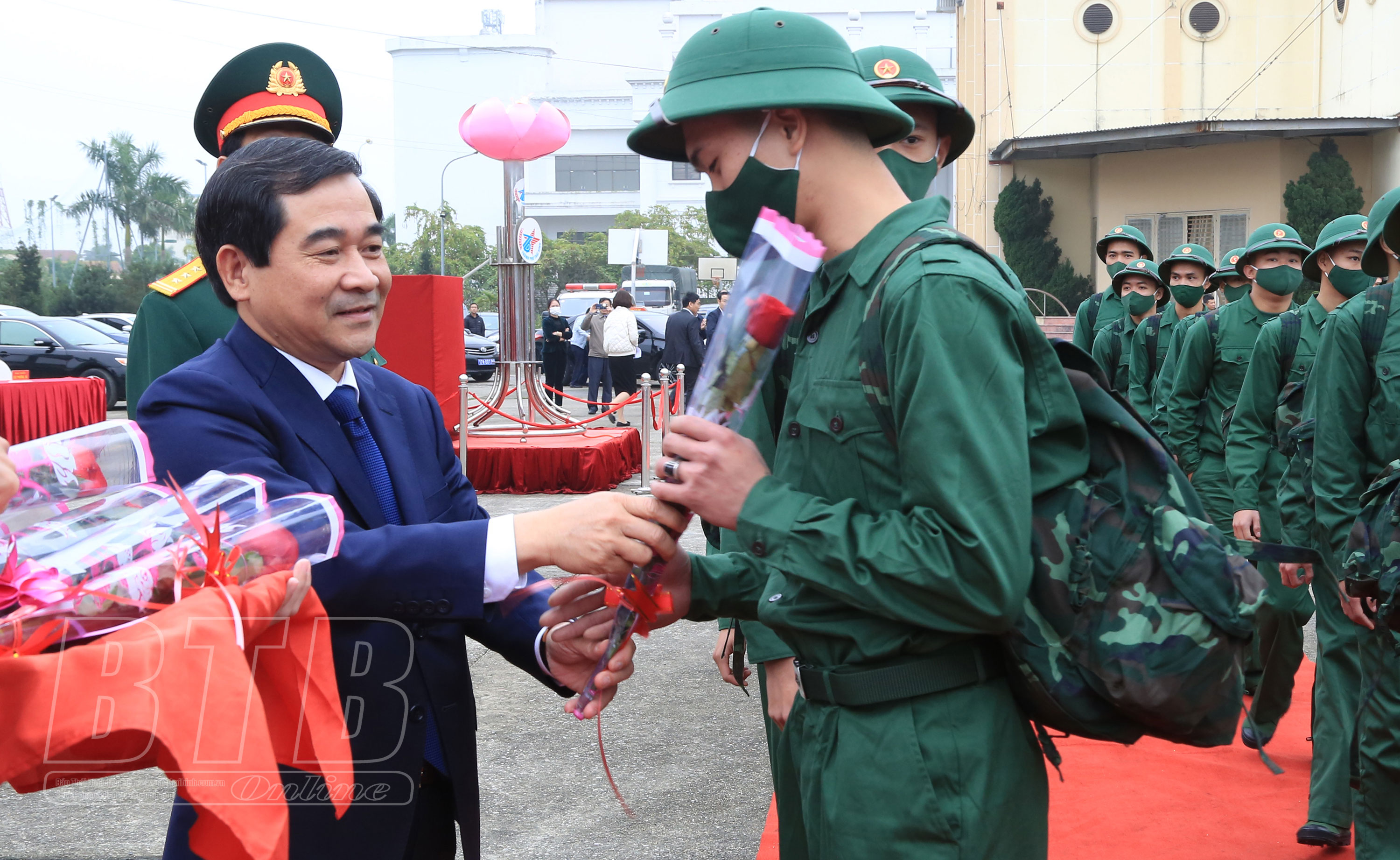 Đồng chí Nguyễn Tiến Thành, Phó Bí thư thường trực Tỉnh ủy, Chủ tịch HĐND tỉnh tặng hoa, động viên tân binh thành phố Thái Bình lên đường làm nhiệm vụ xây dựng và bảo vệ tổ quốc.