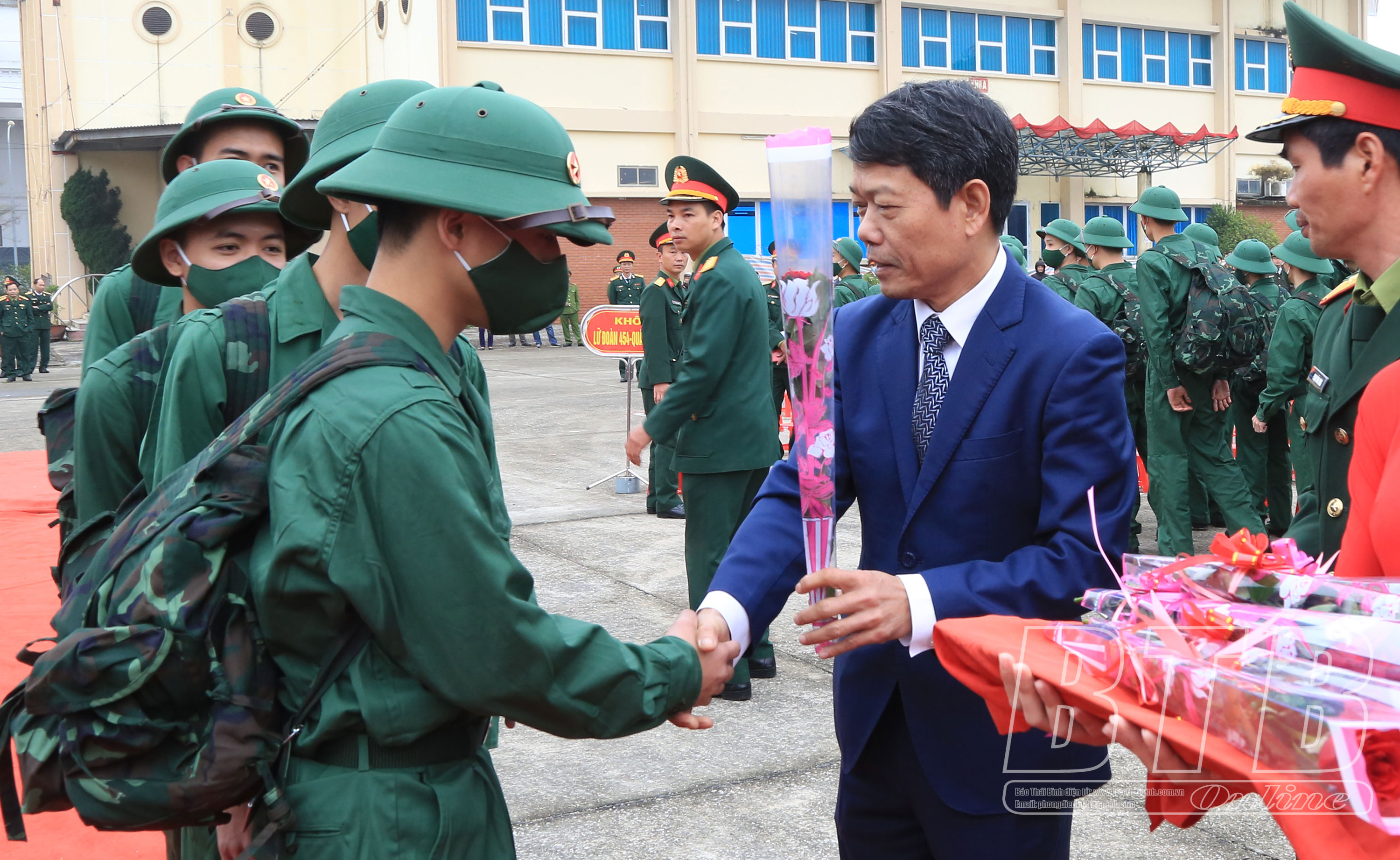 Đồng chí Lại Hợp Mạnh, Tỉnh ủy viên, Viện trưởng Viện Kiểm sát nhân dân tỉnh tặng hoa, động viên tân binh thành phố Thái Bình.