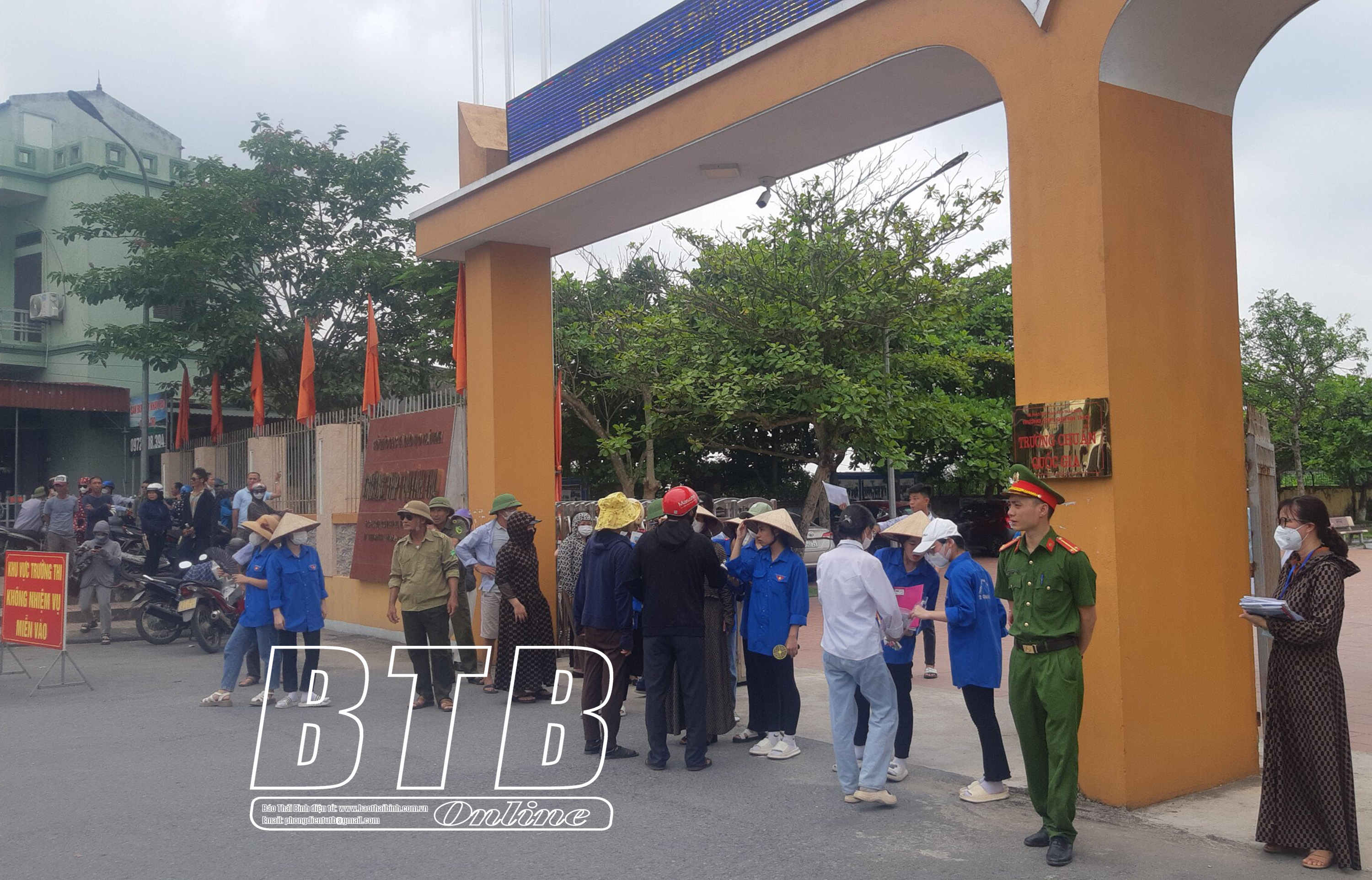 Cảnh sát giao thông nhắc nhở người nhà thí sinh bảo đảm an toàn giao thông tại điểm thi Trường THPT Nguyễn Đức Cảnh (thành phố Thái Bình).