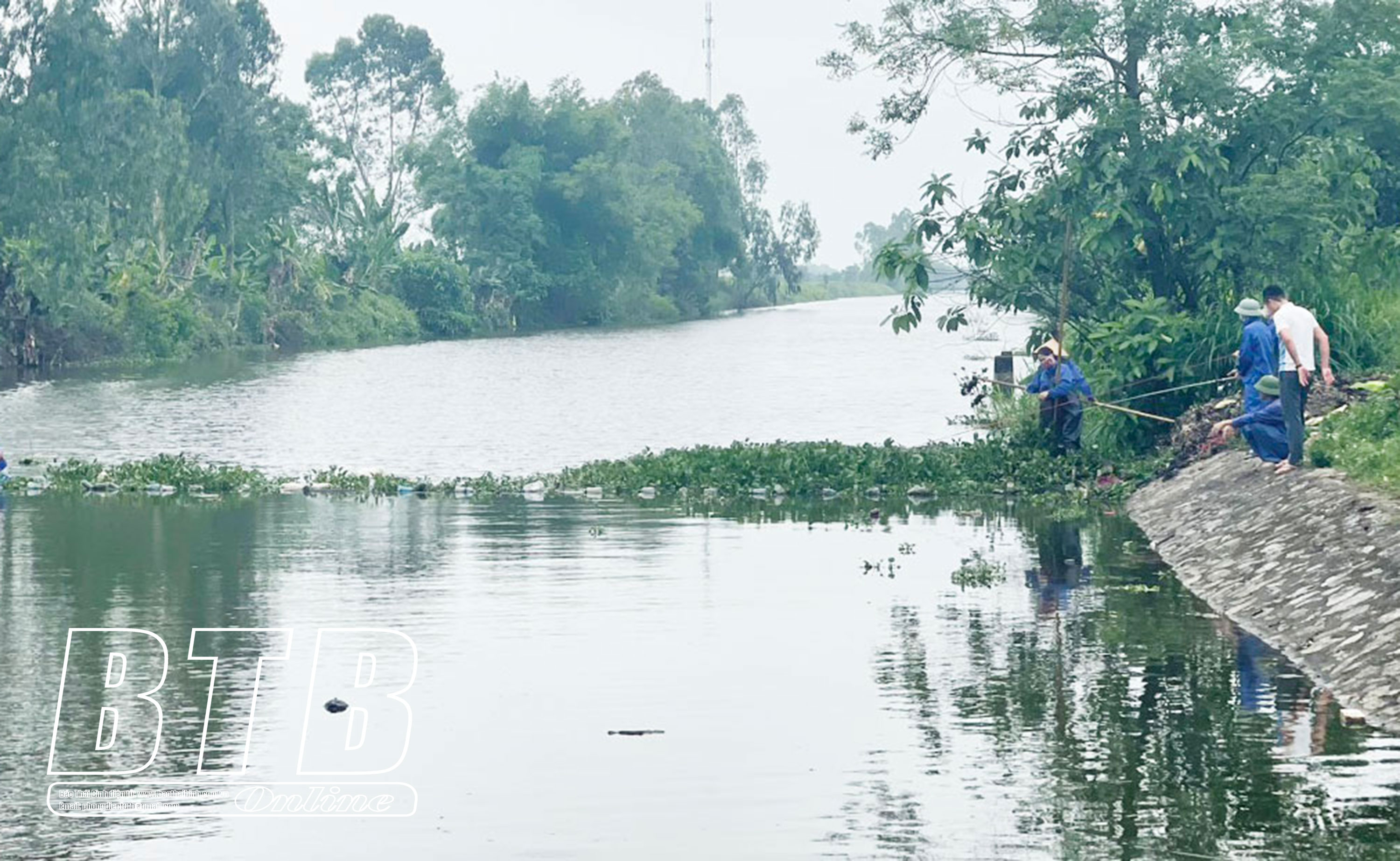 Xí nghiệp Khai thác công trình thủy lợi huyện Hưng Hà thu vớt bèo bồng gây cản trở dòng chảy.