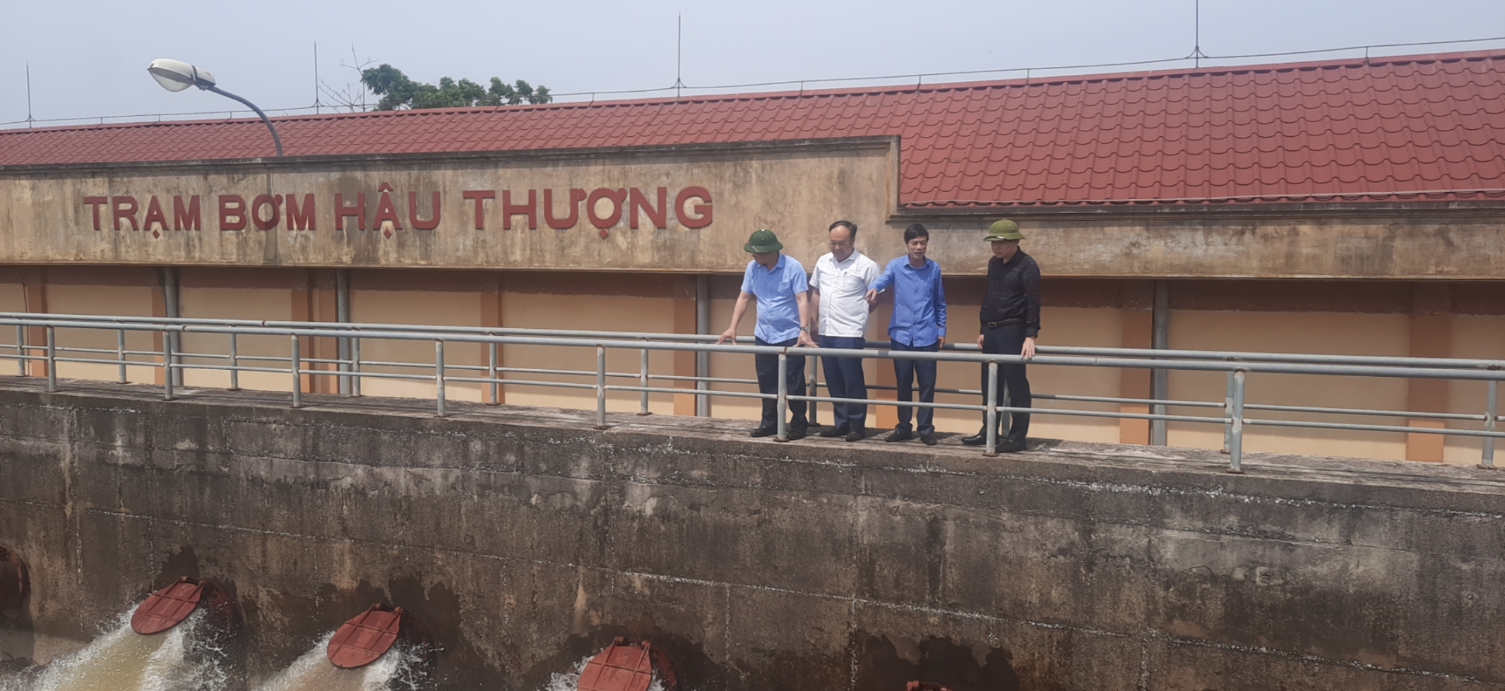 Các đồng chí lãnh đạo huyện Đông Hưng kiểm tra, chỉ đạo công tác phòng, chống bão số 1 tại Trạm bơm Hậu Thượng, xã Bạch Đằng.
