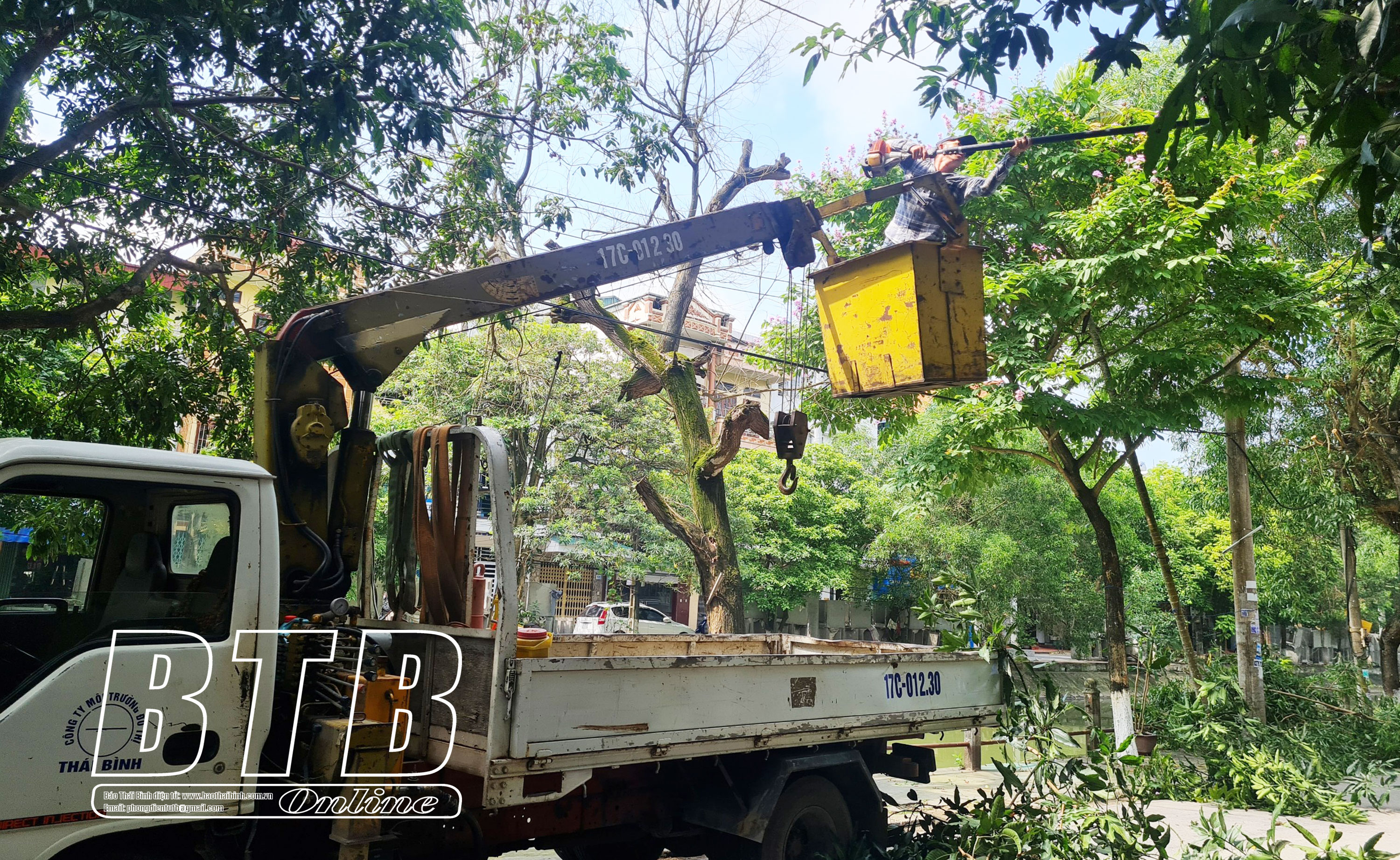 Công nhân Công ty Cổ phần Môi trường và Công trình đô thị Thái Bình chặt, tỉa cành cây phòng, chống bão.
