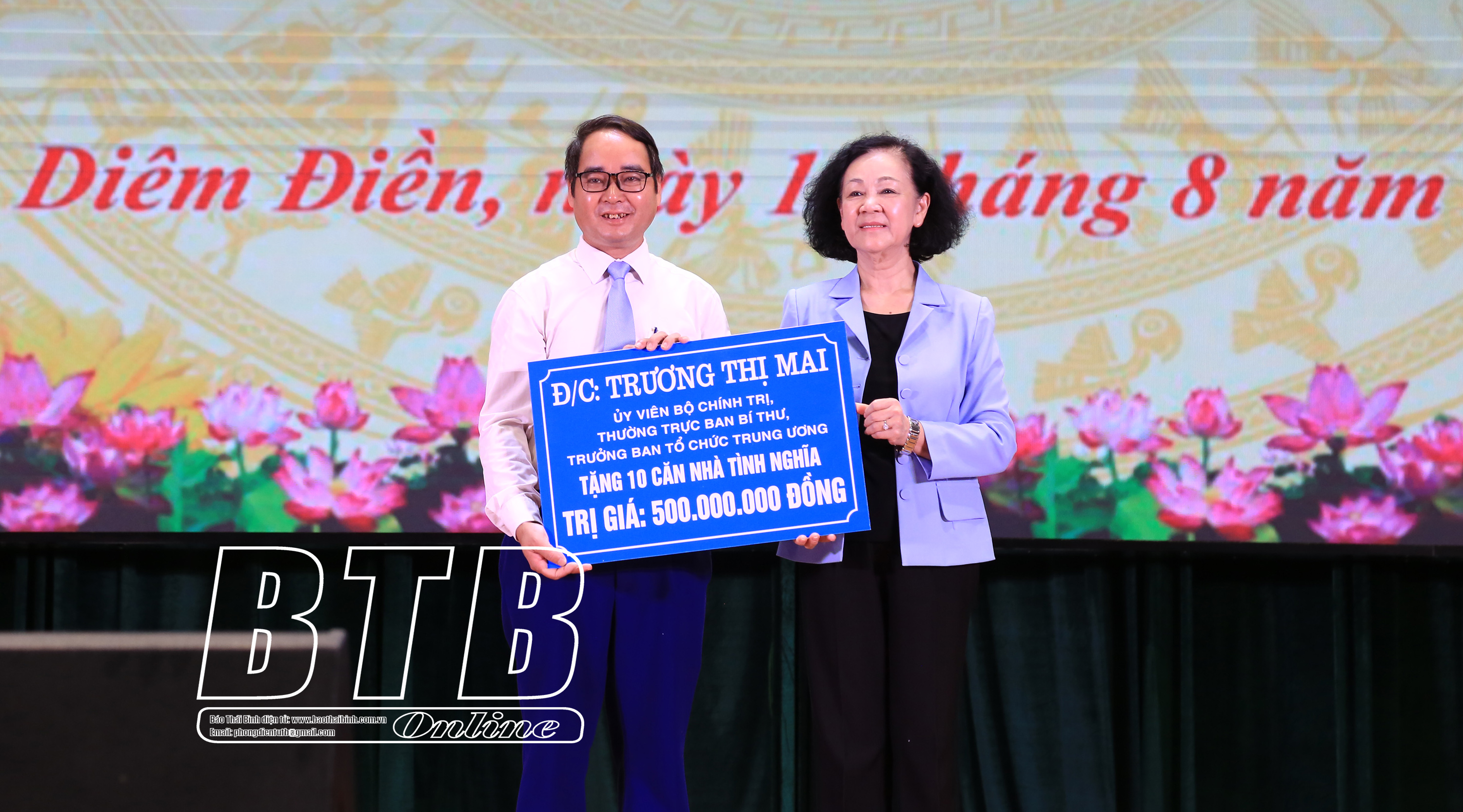 Đồng chí Trương Thị Mai, Ủy viên Bộ Chính trị, Thường trực Ban Bí thư, Trưởng ban Tổ chức Trung ương tặng nhà tình nghĩa cho các hộ gia đình có hoàn cảnh khó khăn huyện Thái Thụy.