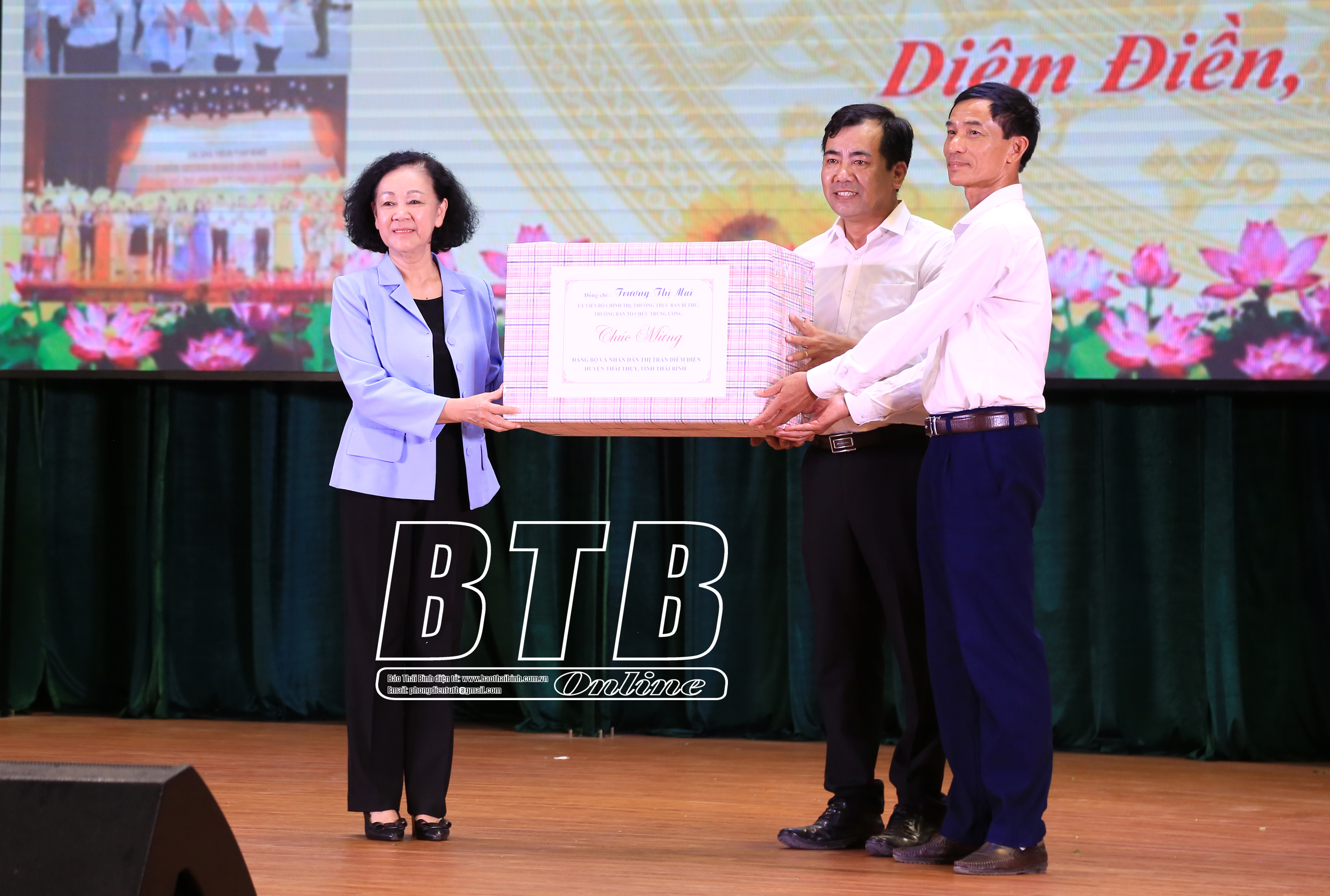 Đồng chí Trương Thị Mai, Ủy viên Bộ Chính trị, Thường trực Ban Bí thư, Trưởng ban Tổ chức Trung ương tặng quà Đảng bộ, nhân dân thị trấn Diêm Điền (Thái Thụy).