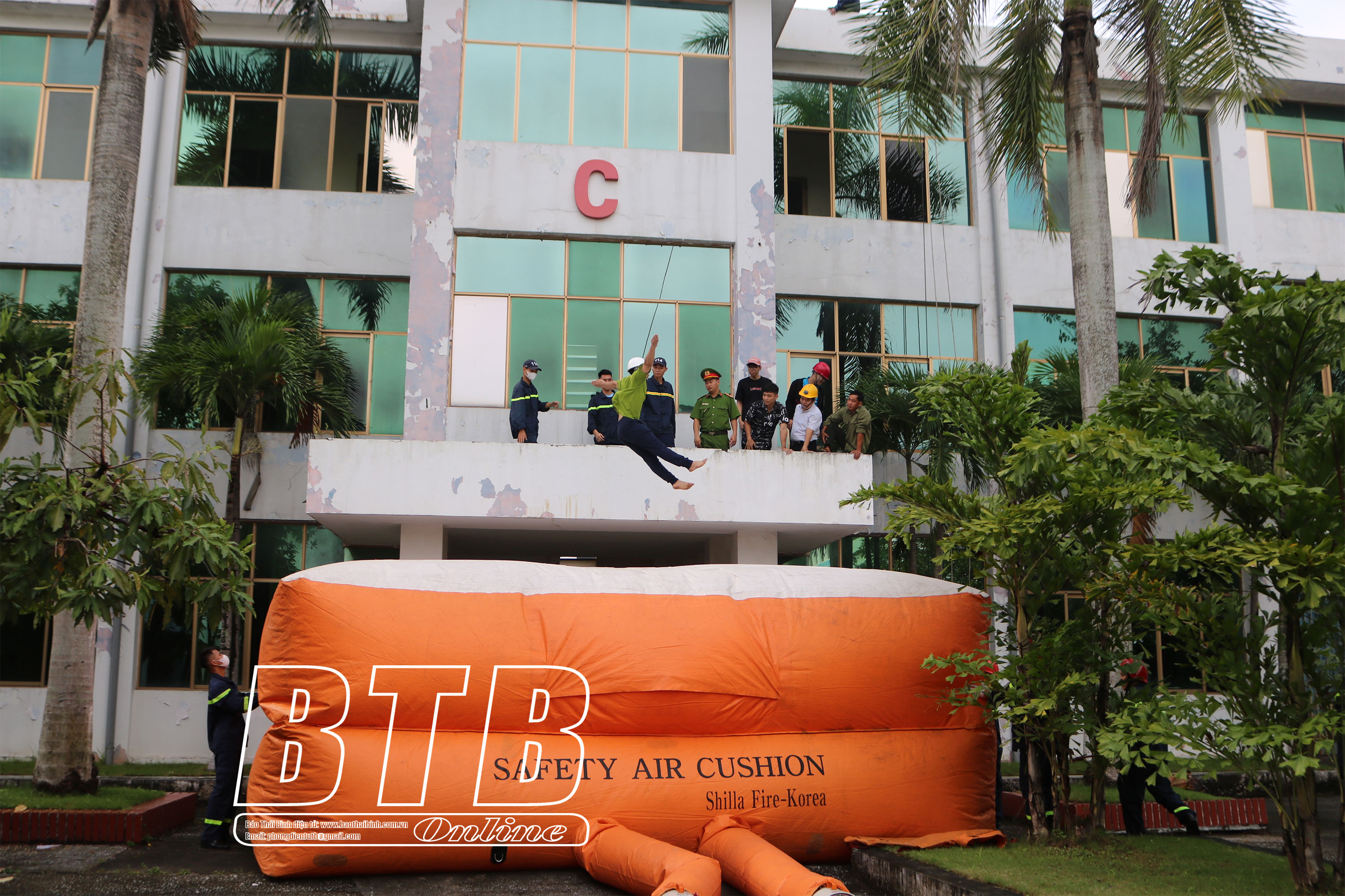Người dân trải nghiệm biện pháp thoát nạn khỏi nhà cao tầng bằng đệm hơi.