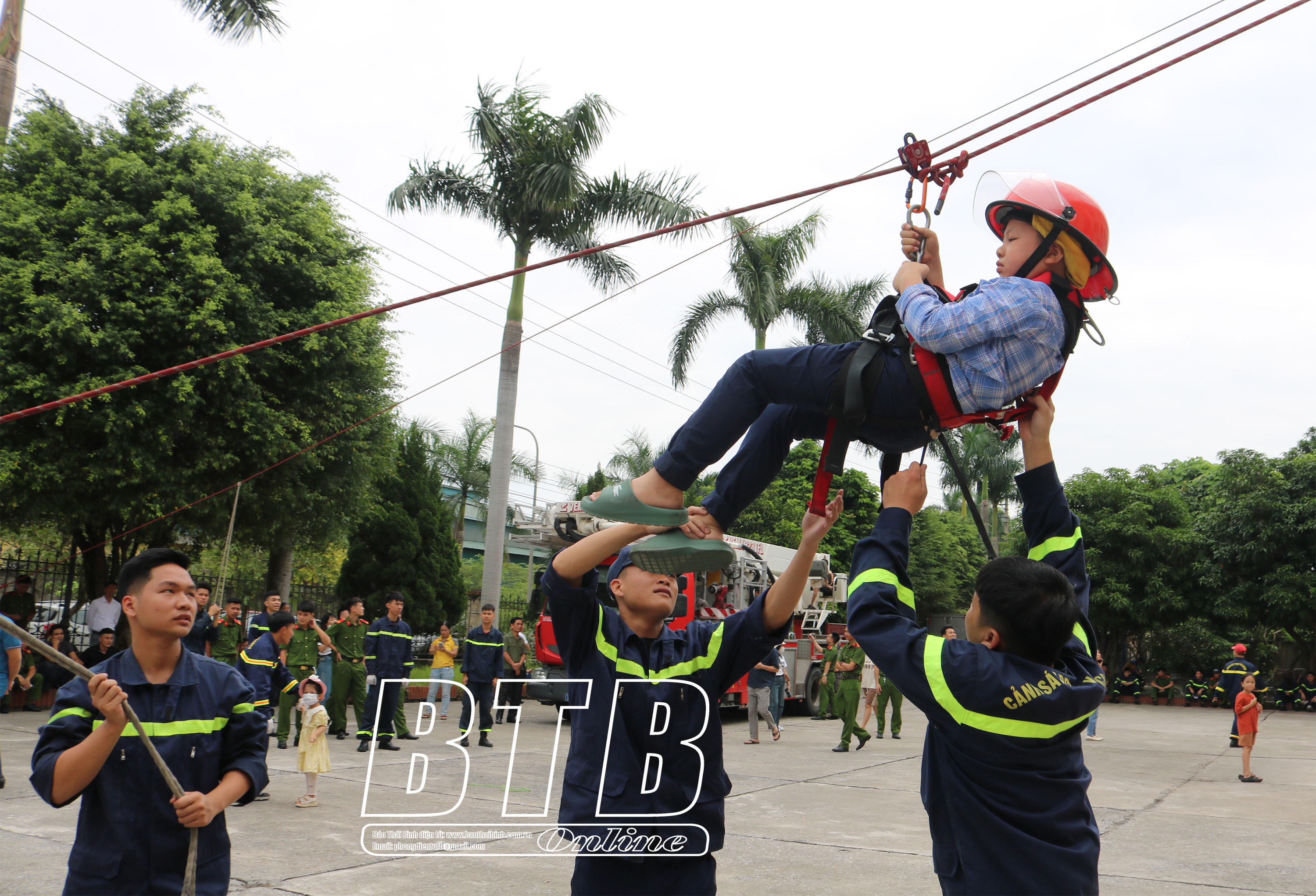 Học sinh Trường THCS Kỳ Bá (thành phố Thái Bình) trải nghiệm biện pháp thoát nạn khỏi nhà cao tầng bằng bộ dây hạ chậm.