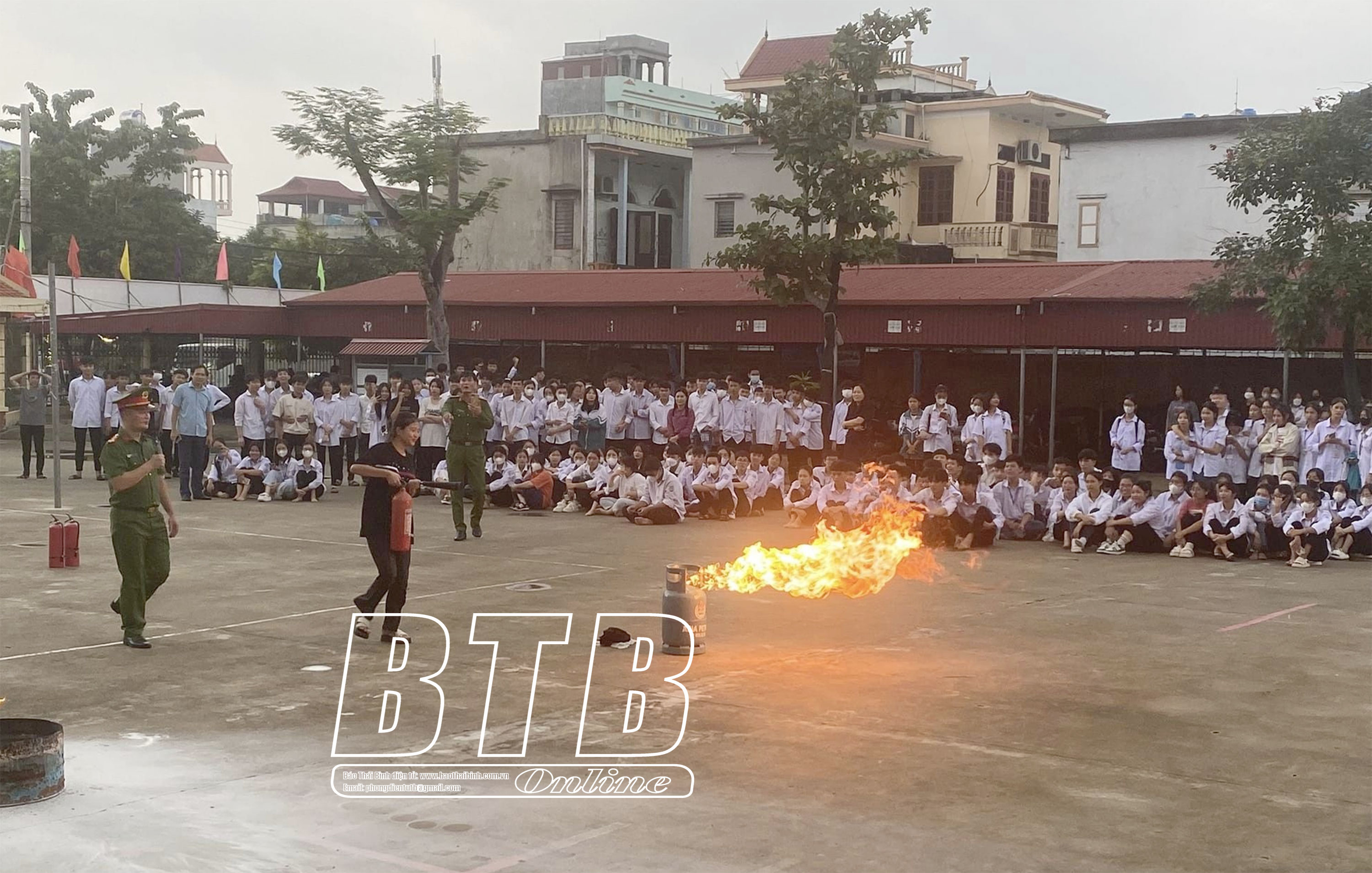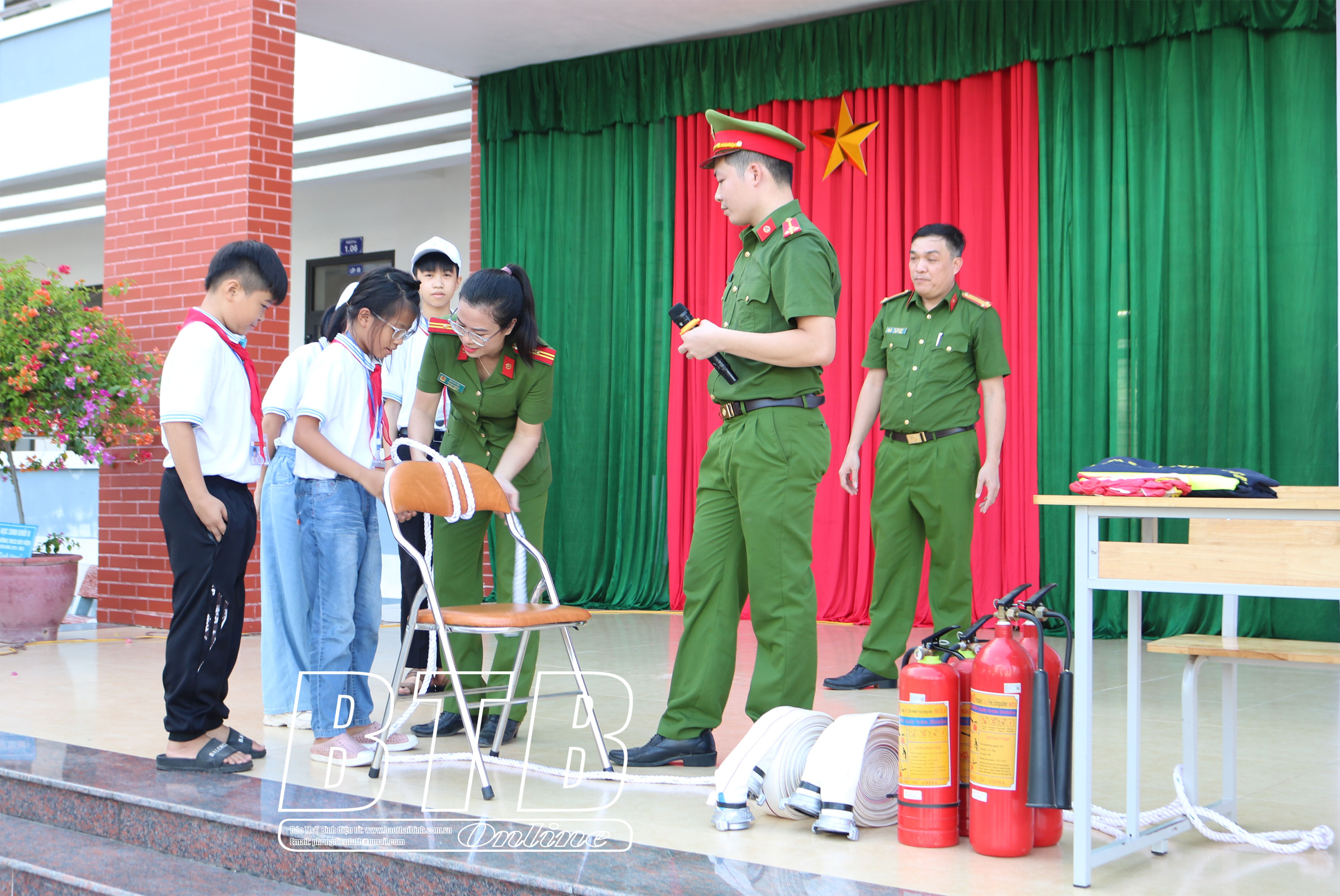 Lực lượng công an cấp phát cẩm nang PCCC và CNCH cho giáo viên và học sinh Trường THCS Hoàng Diệu (thành phố Thái Bình).