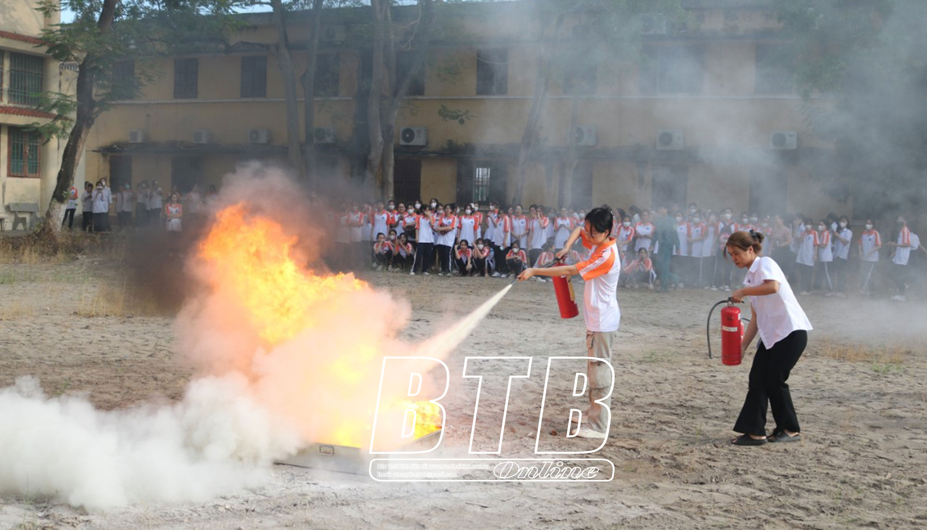 Các em học sinh, sinh viên thực hành sử dụng bình chữa cháy.