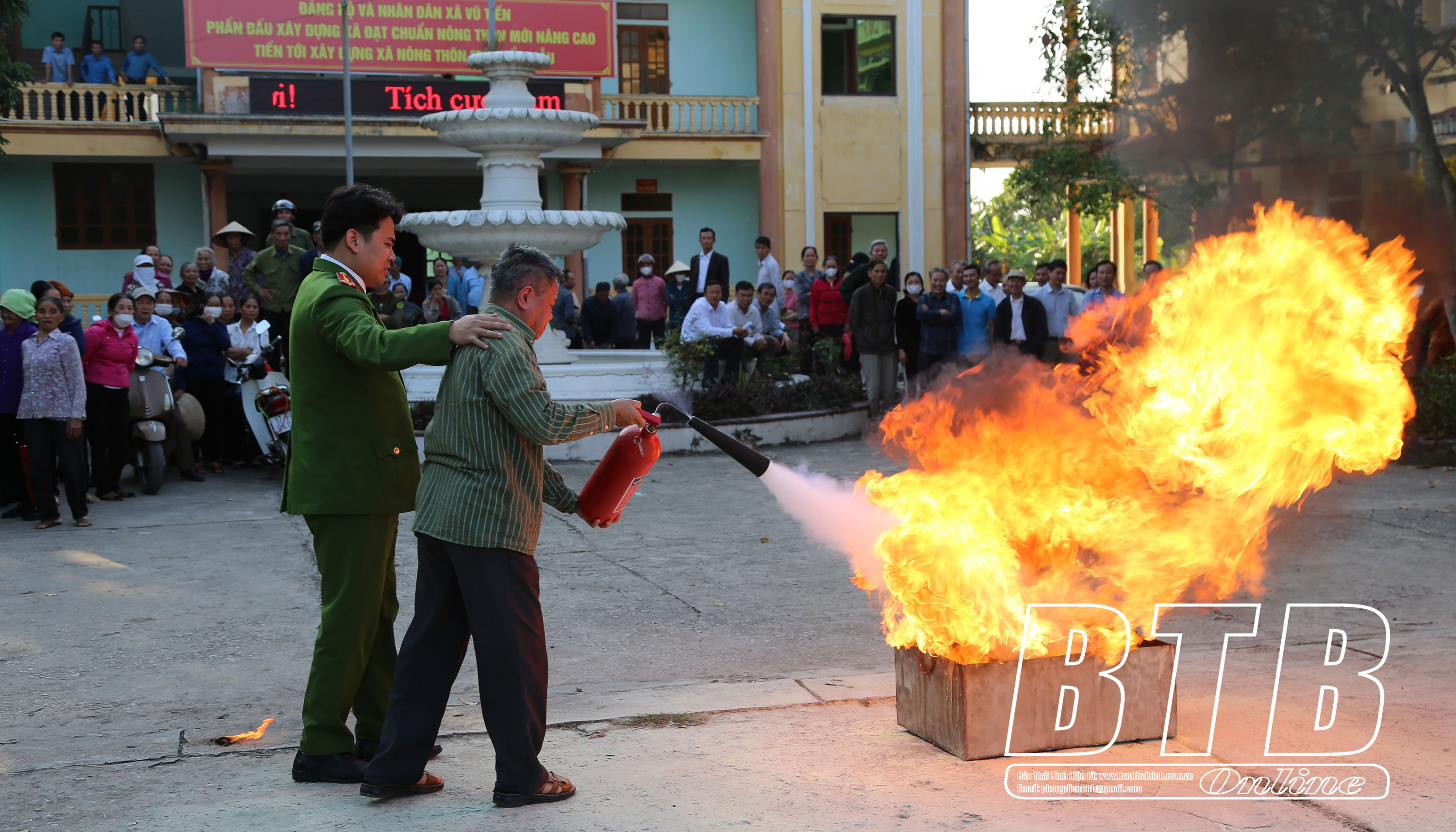 Người dân xã Vũ Tiến (Vũ Thư) thực hành dập tắt đám cháy bằng bình cứu hỏa.