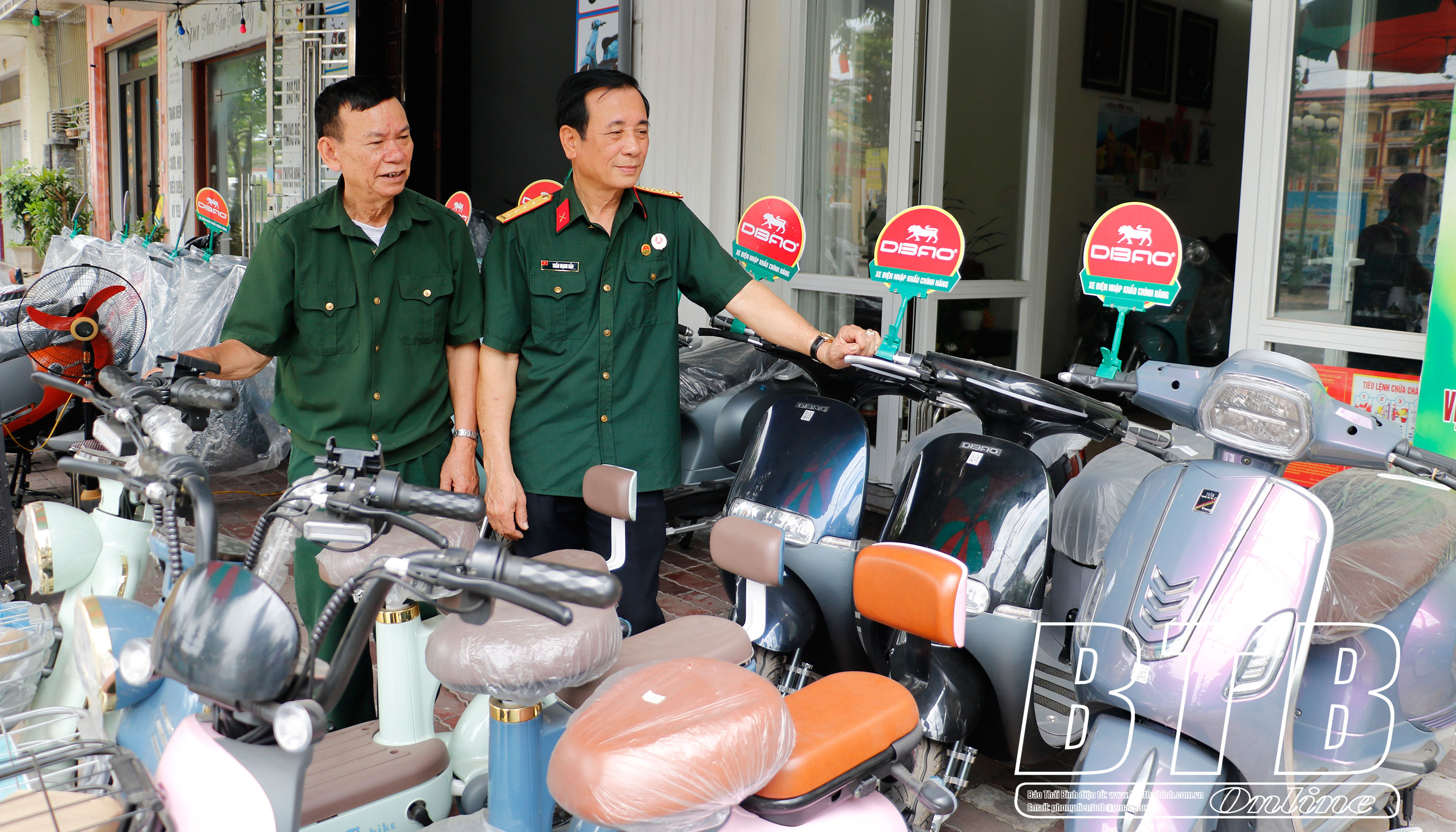 Cựu chiến binh Trần Mạnh Bảo (bên phải) mở cửa hàng kinh doanh xe đạp điện.