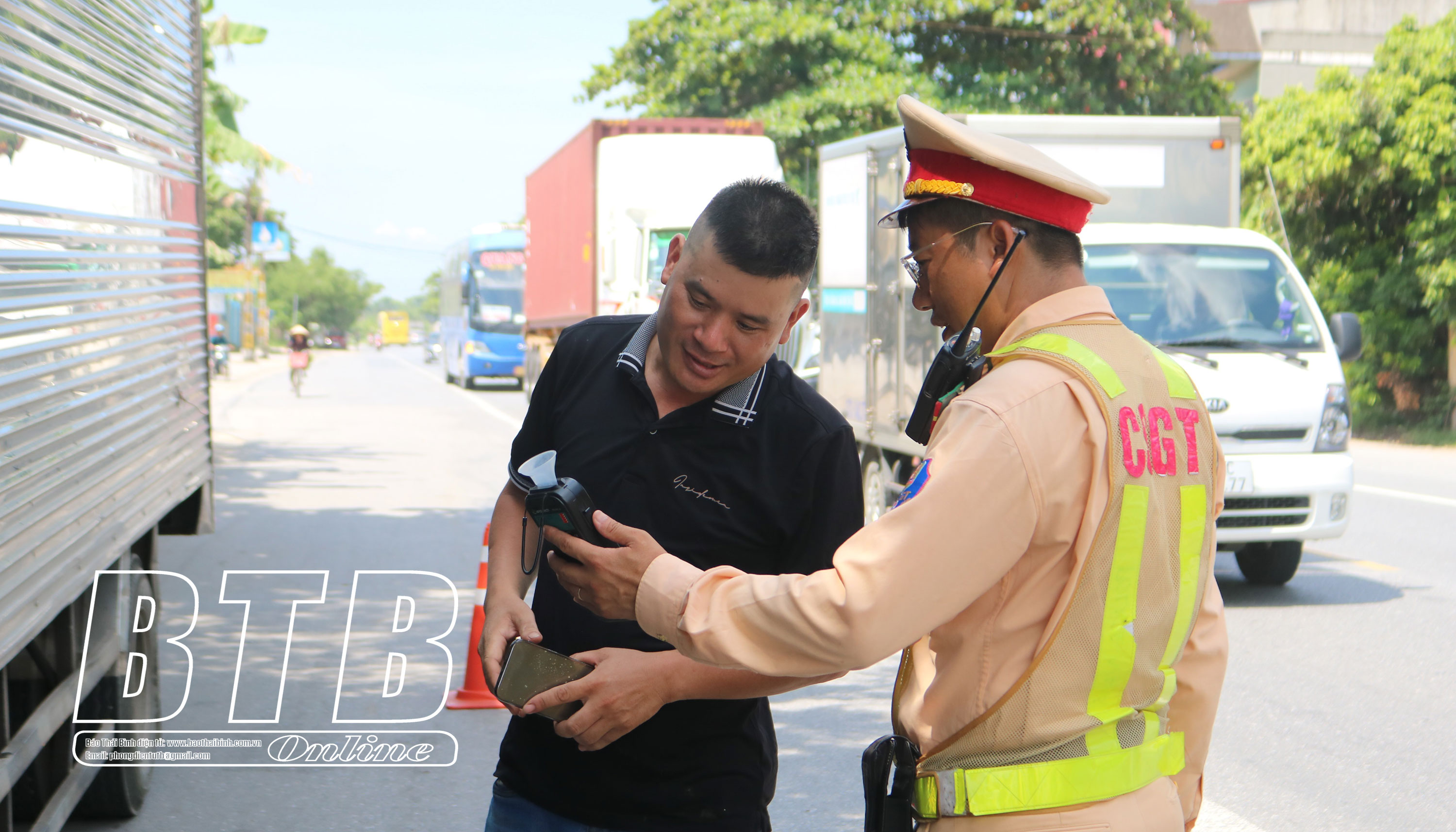 Lực lượng Cảnh sát giao thông kiểm soát nồng độ cồn của người điều khiển phương tiện tham gia giao thông trên quốc lộ 10.