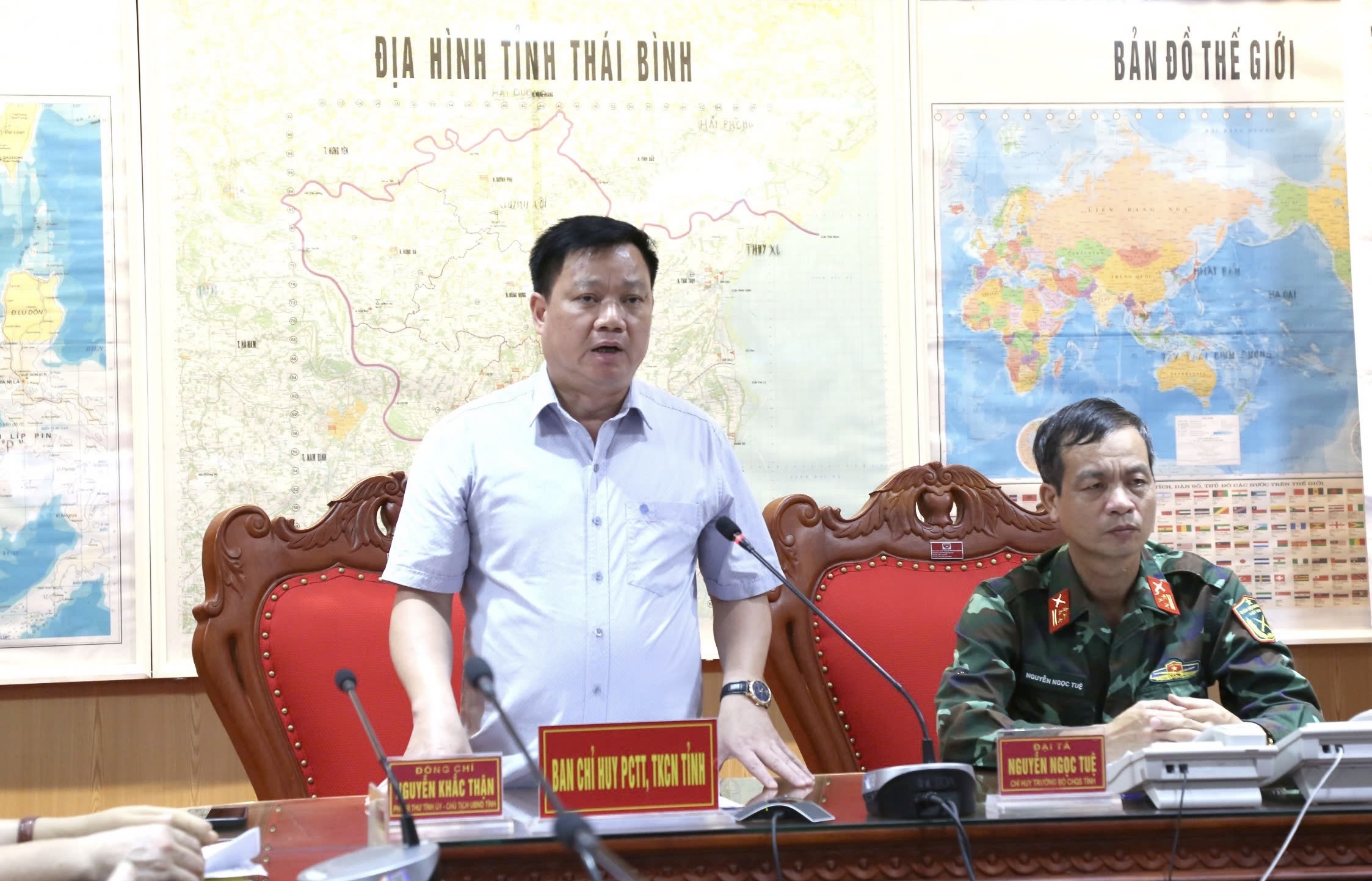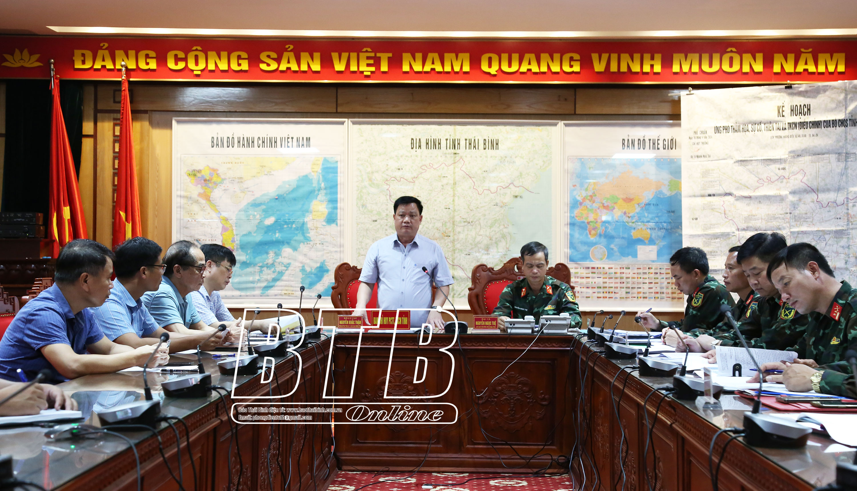 Dự họp tại điểm cầu Thái Bình có các đồng chí: Nguyễn Khắc Thận, Phó Bí thư Tỉnh ủy, Chủ tịch UBND tỉnh, Trưởng ban Chỉ huy Phòng, chống thiên tai (PCTT) và Tìm kiếm cứu nạn (TKCN) tỉnh; Đại tá Nguyễn Ngọc Tuệ, Ủy viên Ban Thường vụ Tỉnh ủy, Chỉ huy trưởng Bộ CHQS tỉnh; Phạm Văn Nghiêm, Tỉnh ủy viên, Phó Chủ tịch UBND tỉnh.