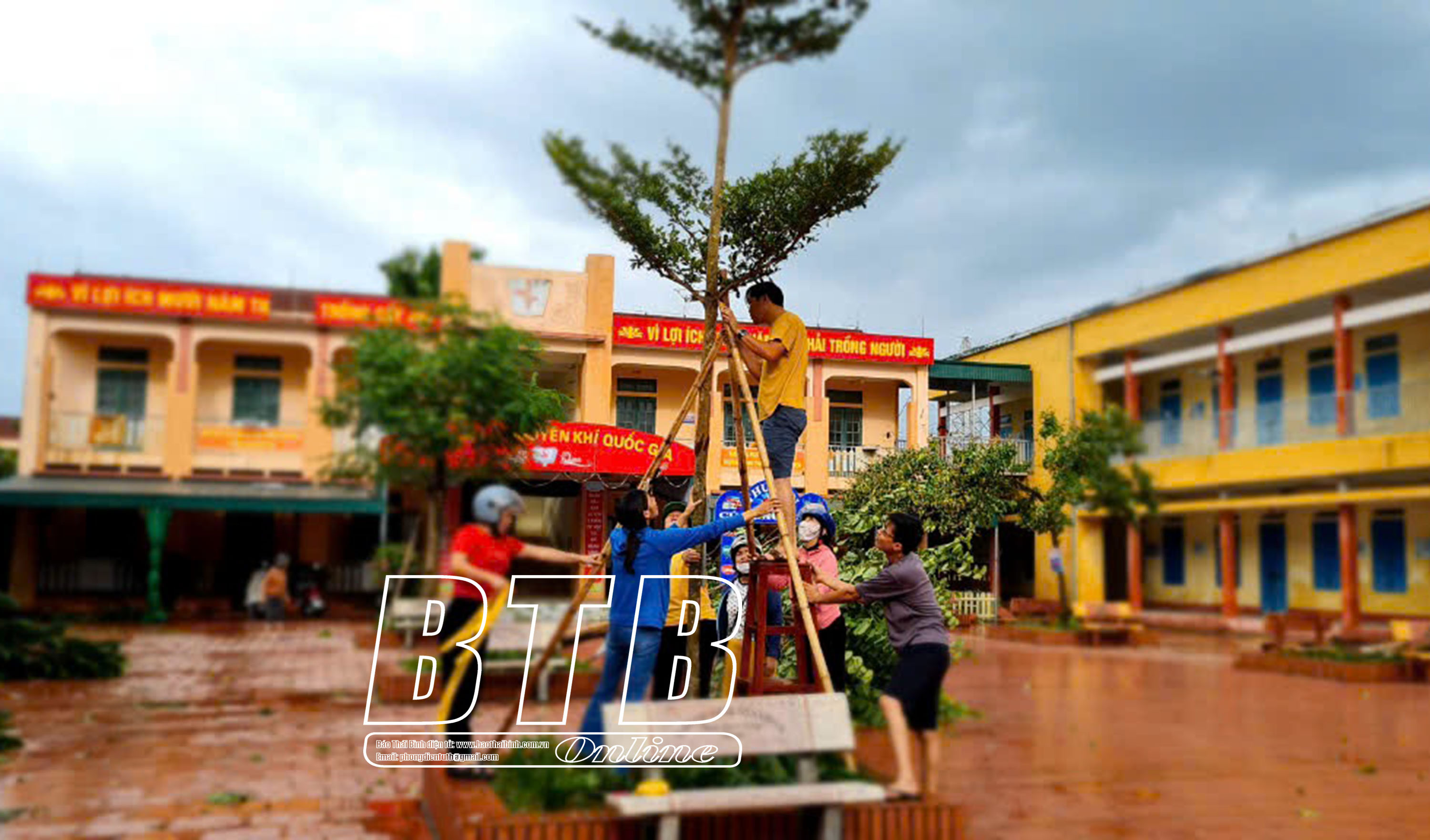 Đoàn viên, thanh niên dọn cành cây gãy tại Trường Mầm non An Ninh (Quỳnh Phụ). Ảnh: Phương Chi