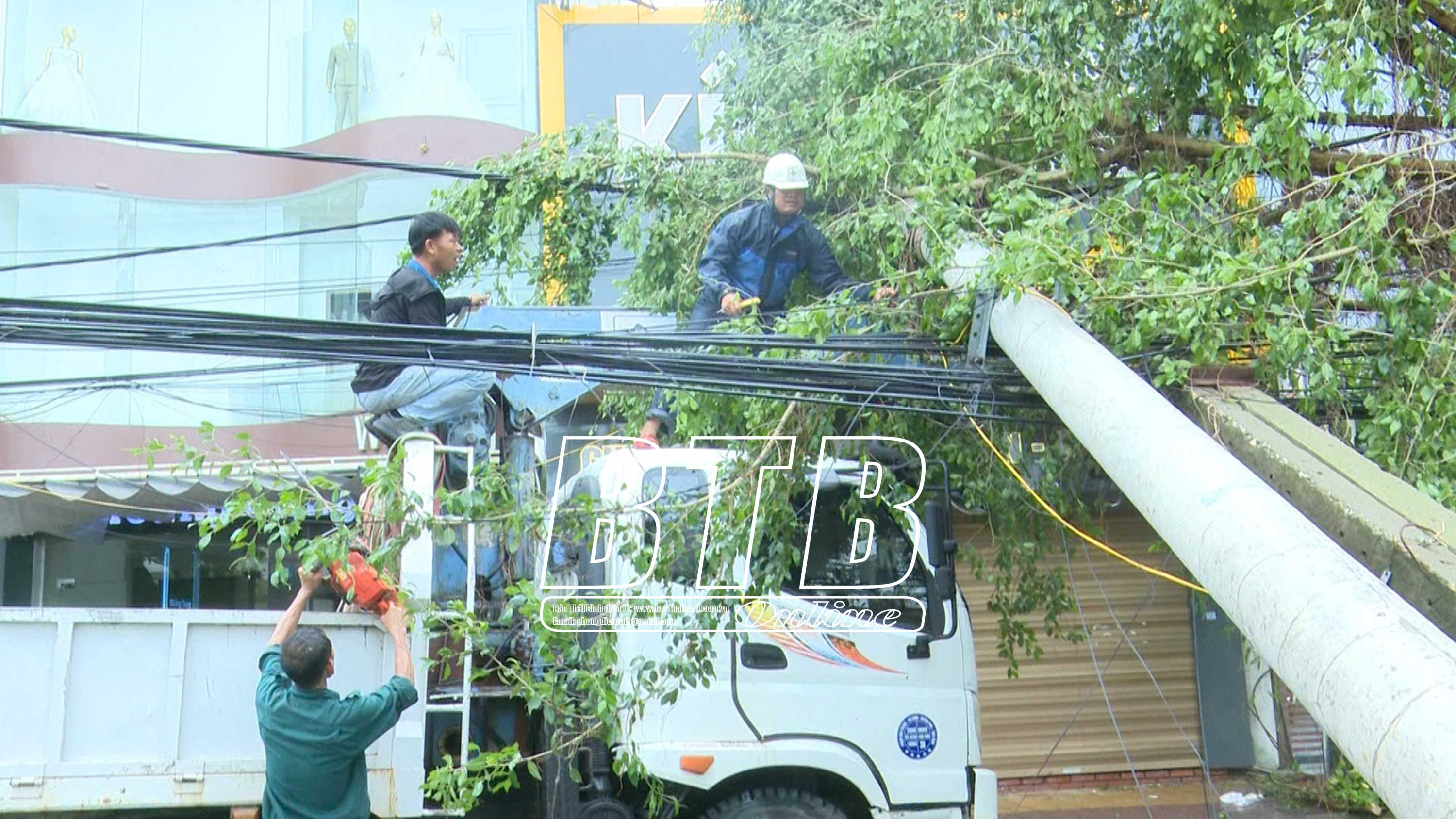 Điện lực Quỳnh Phụ phối hợp với lực lượng chức năng khẩn trương khắc phục sự cố của cơn bão số 3. Ảnh: Nguyễn Cường
