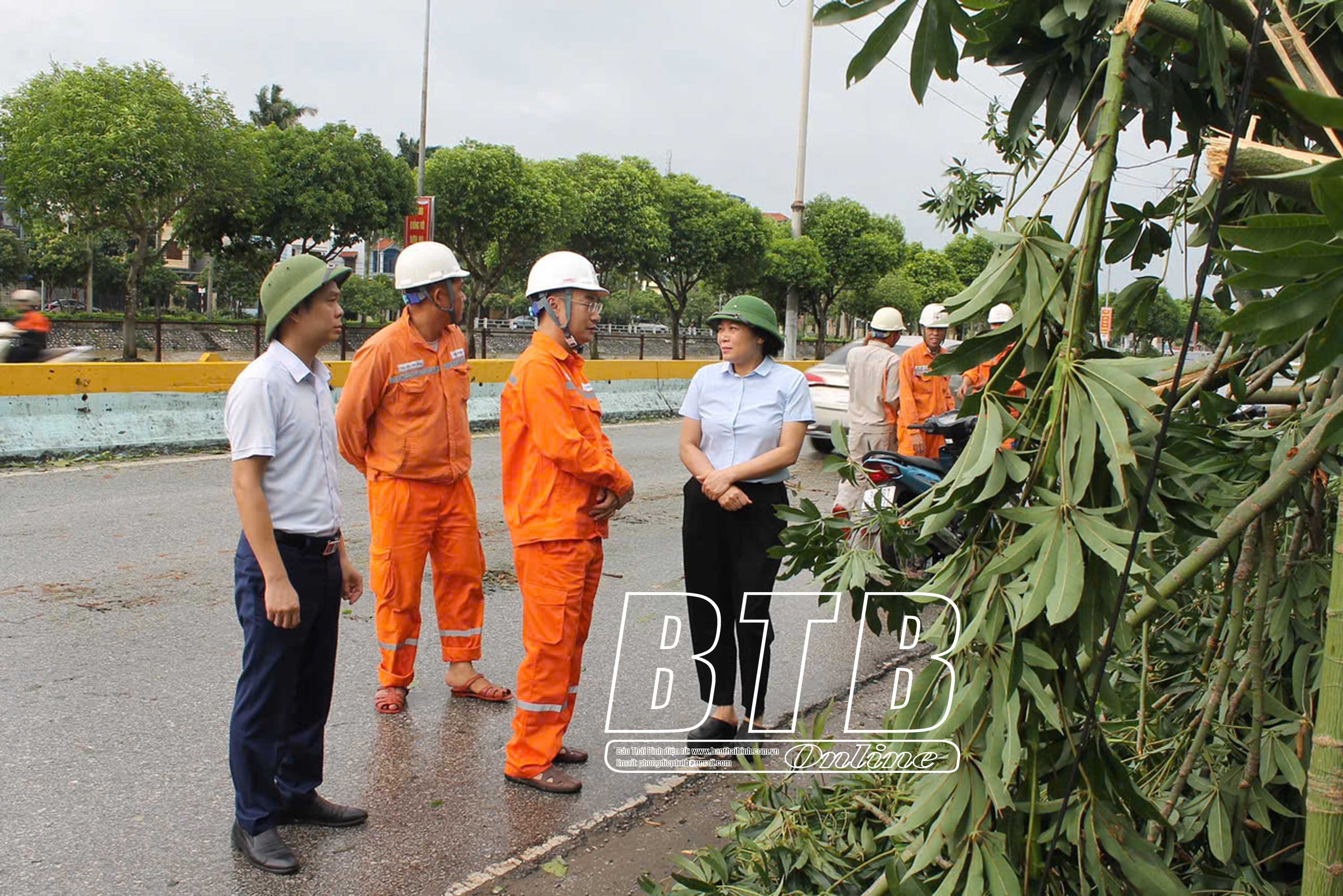 Lãnh đạo huyện Quỳnh Phụ kiểm tra, chỉ đạo các đơn vị, địa phương tập trung nhân lực thu dọn cây đổ để không cản trở việc lưu thông. Ảnh: Nguyễn Cường