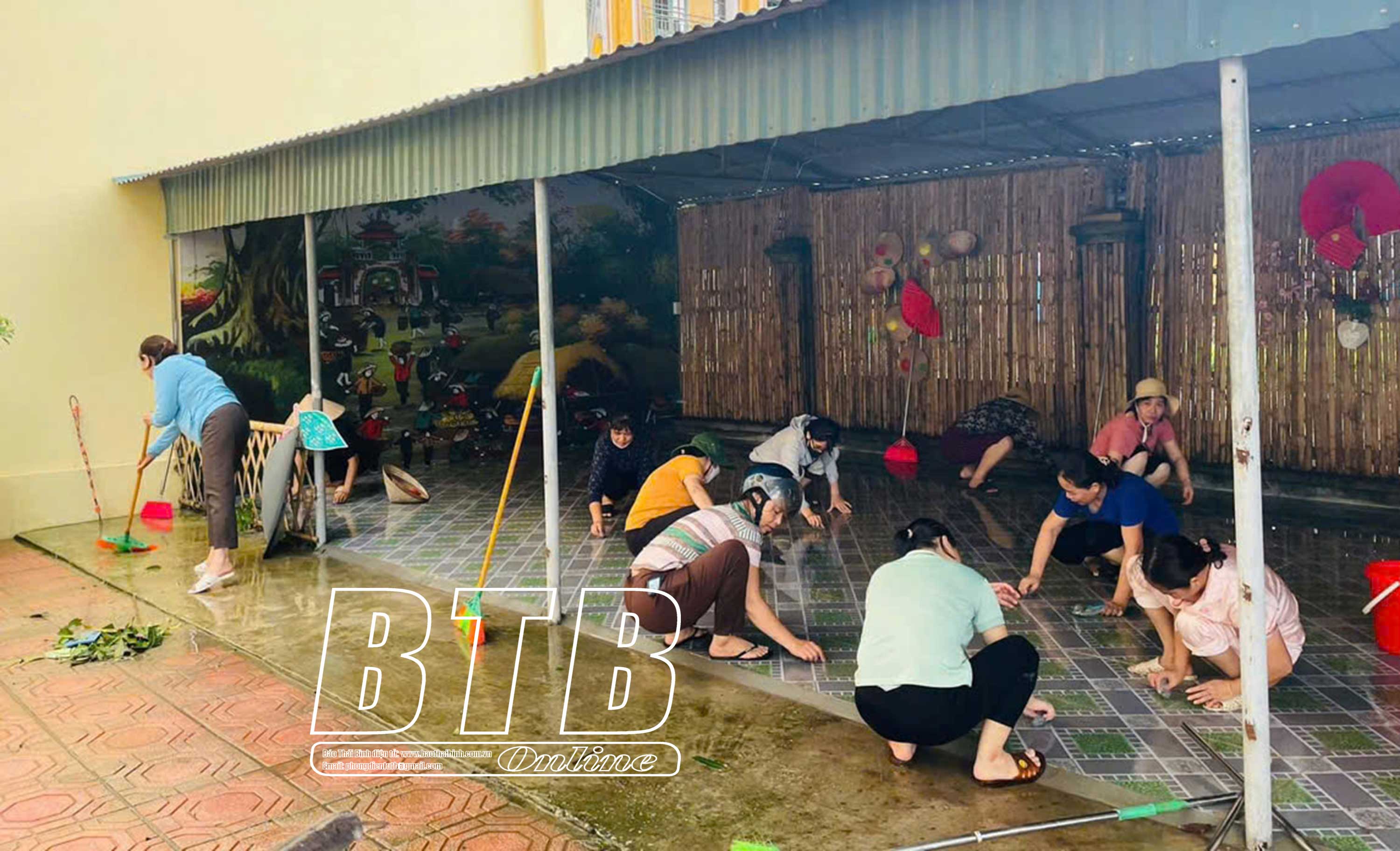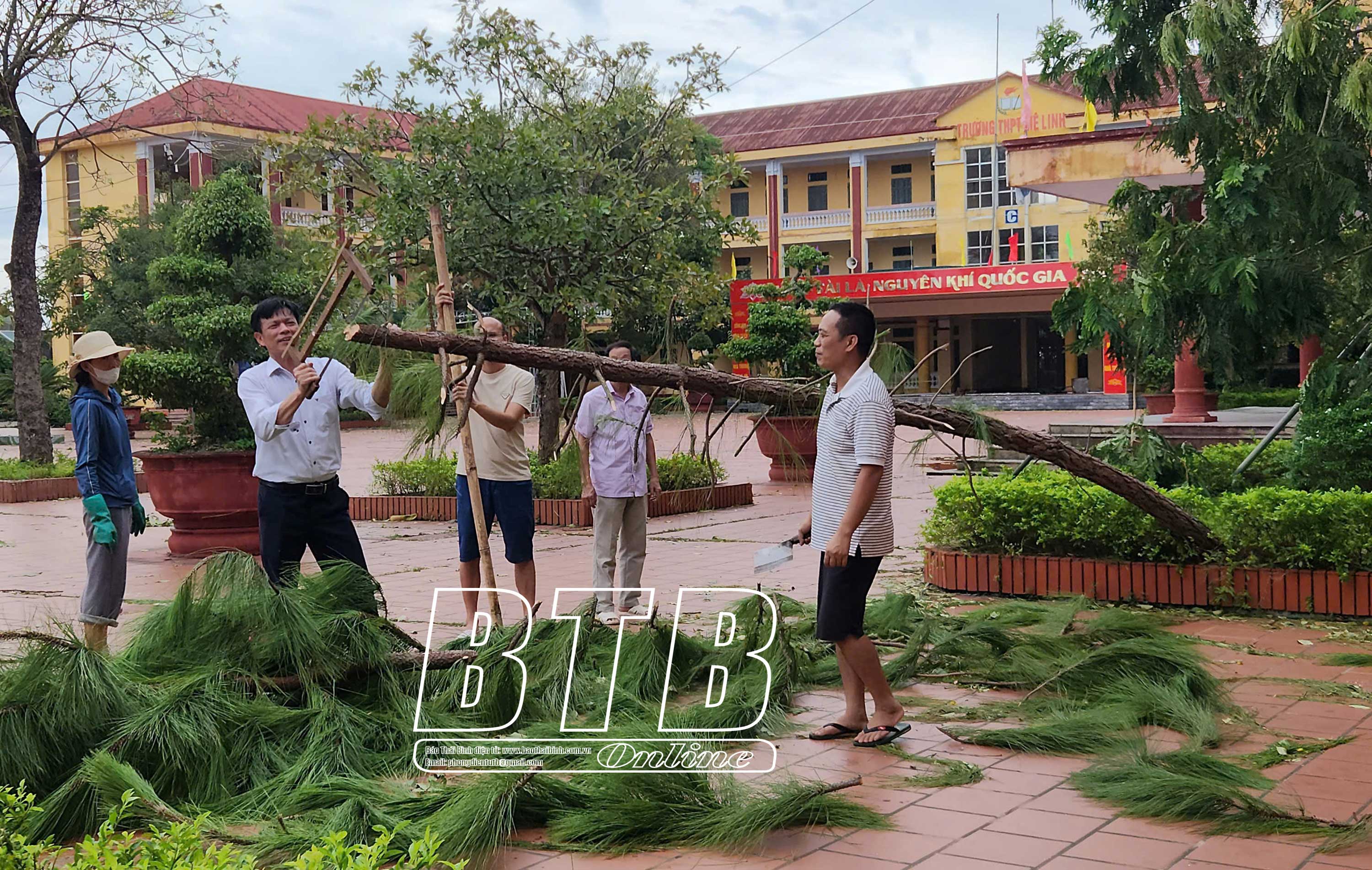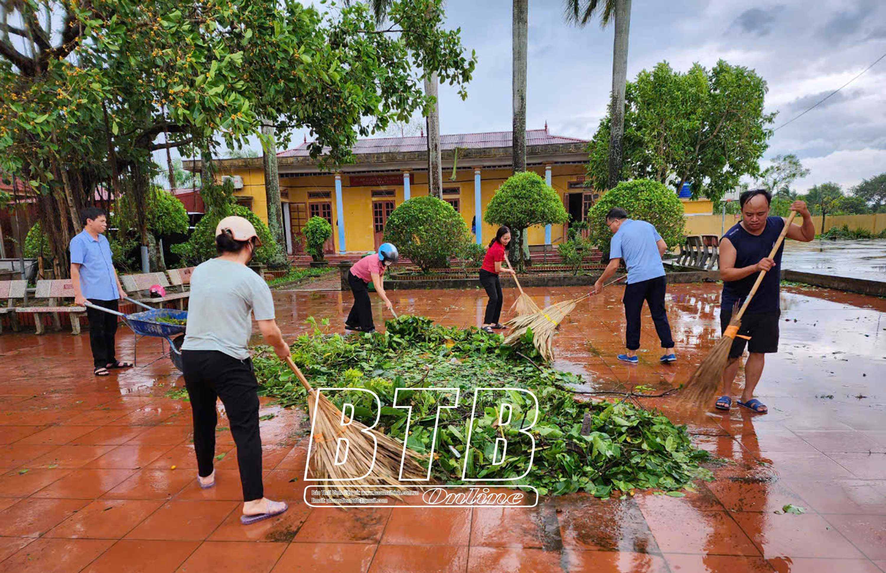Cán bộ, giáo viên Trường Mầm non Song An (Vũ Thư) tiến hành thu dọn cây cối đổ gãy, tổng vệ sinh sau bão số 3. Ảnh: Quỳnh Lưu