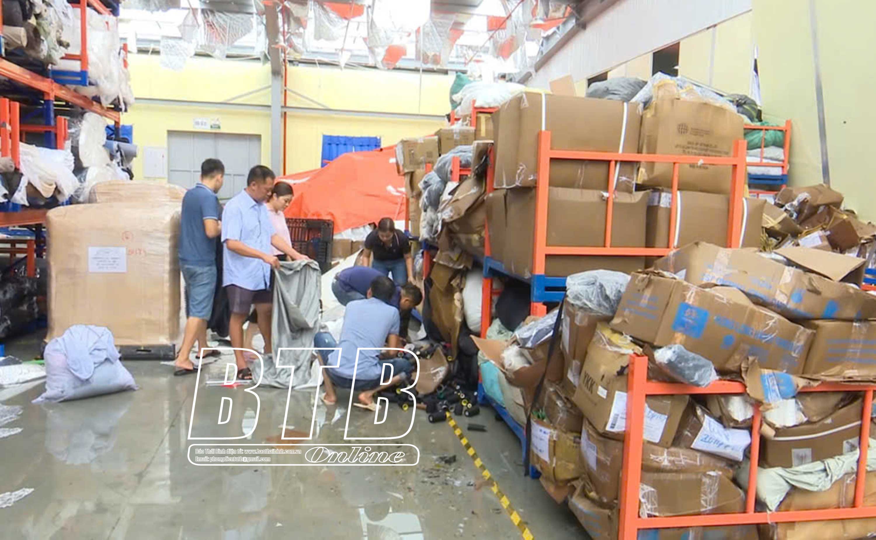Cán bộ, công nhân, người lao động Công ty Cổ phần May Đô Lương xử lý hàng hóa bị ảnh hưởng sau bão. Ảnh: Thu Hiền