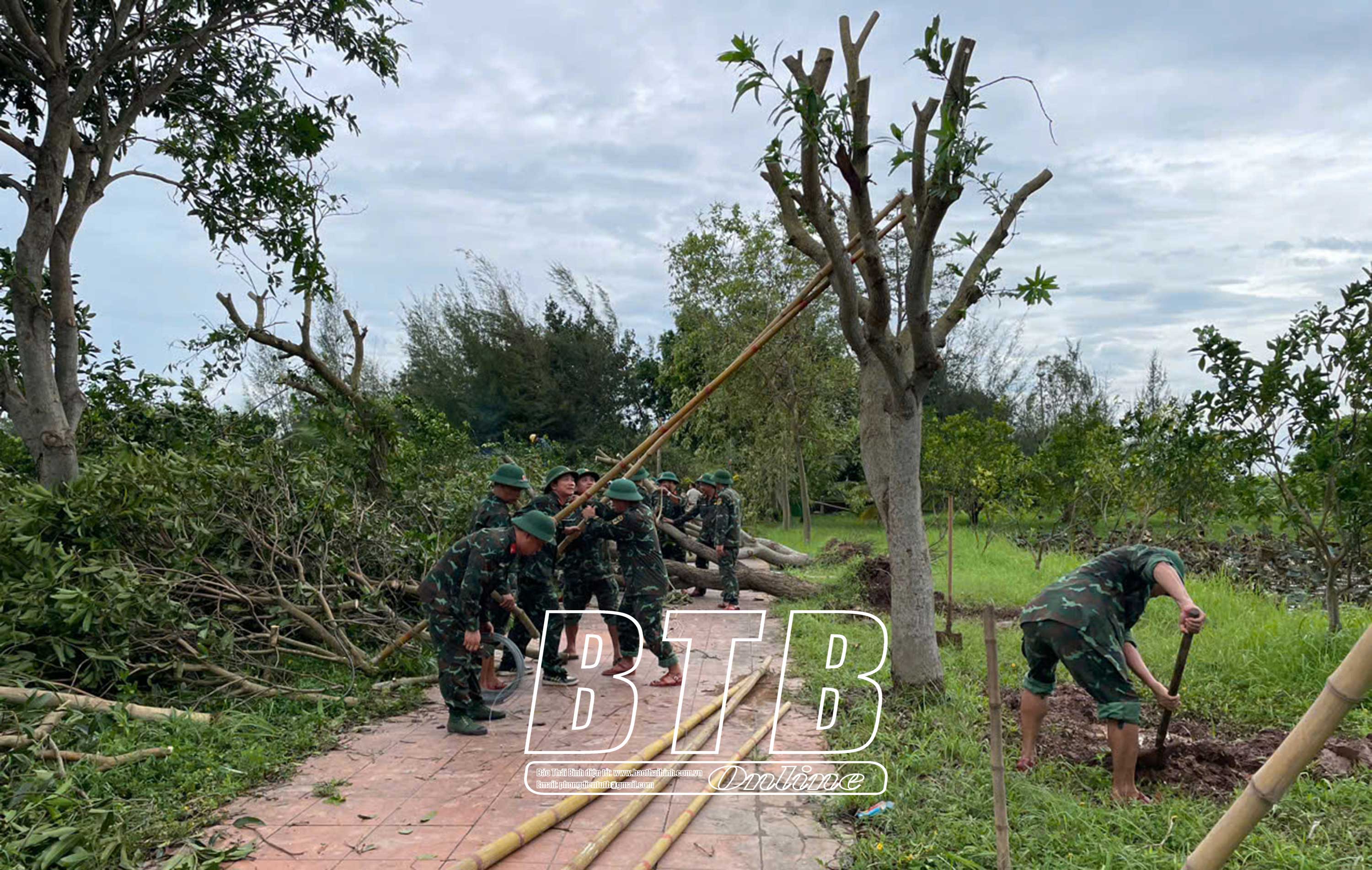 Bộ CHQS tỉnh huy động gần 1.000 lượt cán bộ, chiến sĩ của Trung đoàn Bộ binh 568, Đại đội Trinh sát cơ sở, lực lượng thường trực của ban CHQS các huyện, thành phố tham gia dựng cây đổ, thu gom rác thải, cắt tỉa cây đổ, giúp đỡ người dân tiêu úng cho hoa màu. Ở một số địa phương, lực lượng quân đội giúp đỡ người dân dựng lại các cây ăn quả bị ngã đổ sau bão; hỗ trợ nhu yếu phẩm, thuốc men để người dân yên tâm sinh sống.