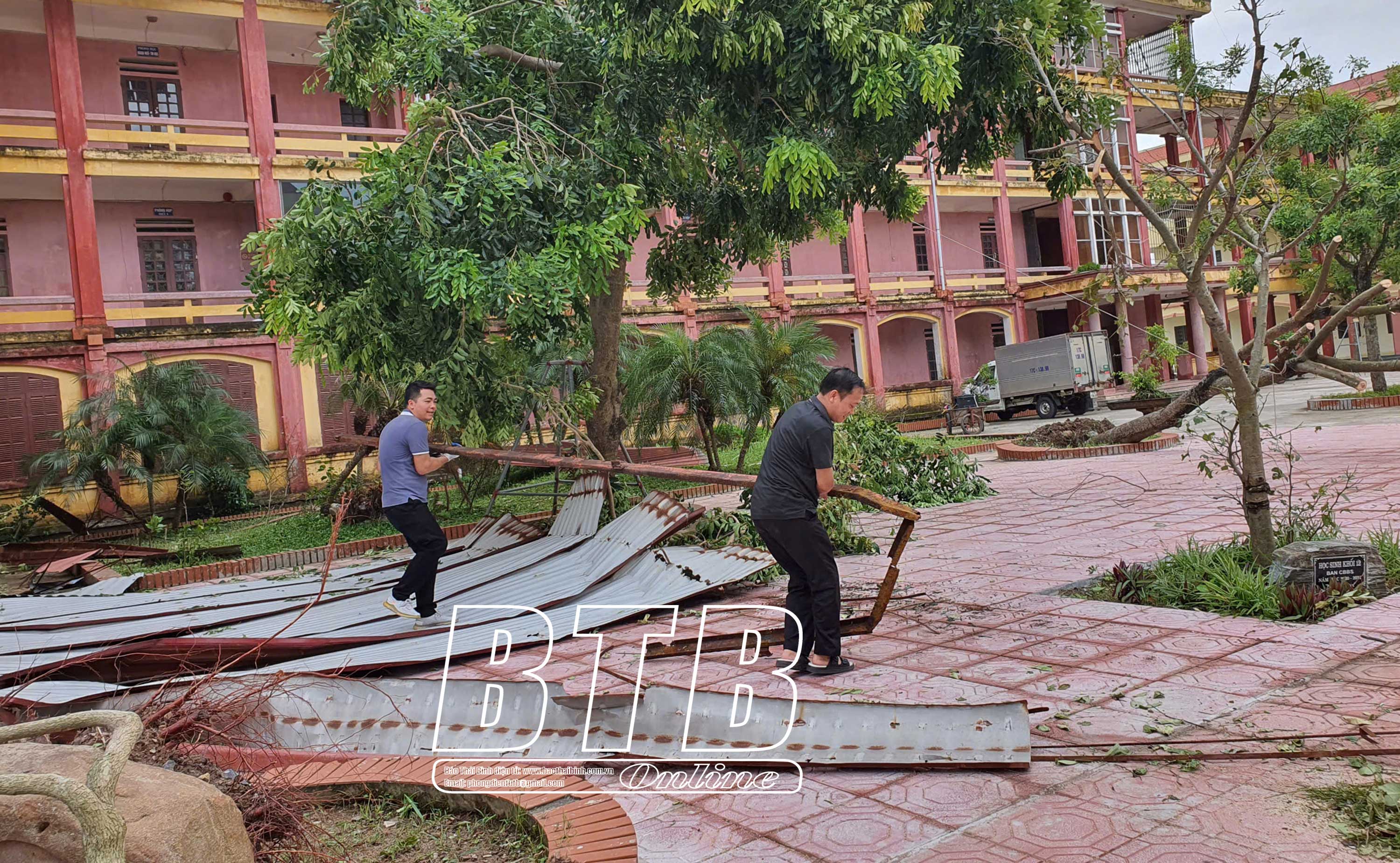 Theo báo cáo nhanh của Sở Giáo dục và Đào tạo, do ảnh hưởng của bão số 3, Trường THPT Bắc Kiến Xương bị tốc 600m2 mái tôn nhà hiệu bộ (xây năm 2008); Trường THPT Trần Hưng Đạo bị tốc mái tôn phòng học, sân thể dục (ước tính thiệt hại khoảng 150 triệu đồng); Trường THPT Nguyễn Trãi bị tốc 100m2 mái tôn lán xe học sinh; Trường THPT Mê Linh bị tốc mái tôn phòng bảo vệ; Trường TH, THCS và THPT Quách Đình Bảo bị lật một tấm tôn mái nhà A1; Trường THPT Hưng Nhân bị đổ 50m tường bao; Trường THPT Nguyễn Đức Cảnh một lán xe học sinh bị sập; Trung tâm GDNN-GDTX Hưng Hà bị sập một trụ cổng trung tâm... Thiệt hại nặng nhất là Trường THPT Nam Đông Quan đổ 15 cây xanh, trong đó có 4 cây cổ thụ; đổ sập 15m tường bao sau trường; tốc mái tôn 2 ô nhà xe; gãy hỏng 2 bảng tin ngoài sân trường.