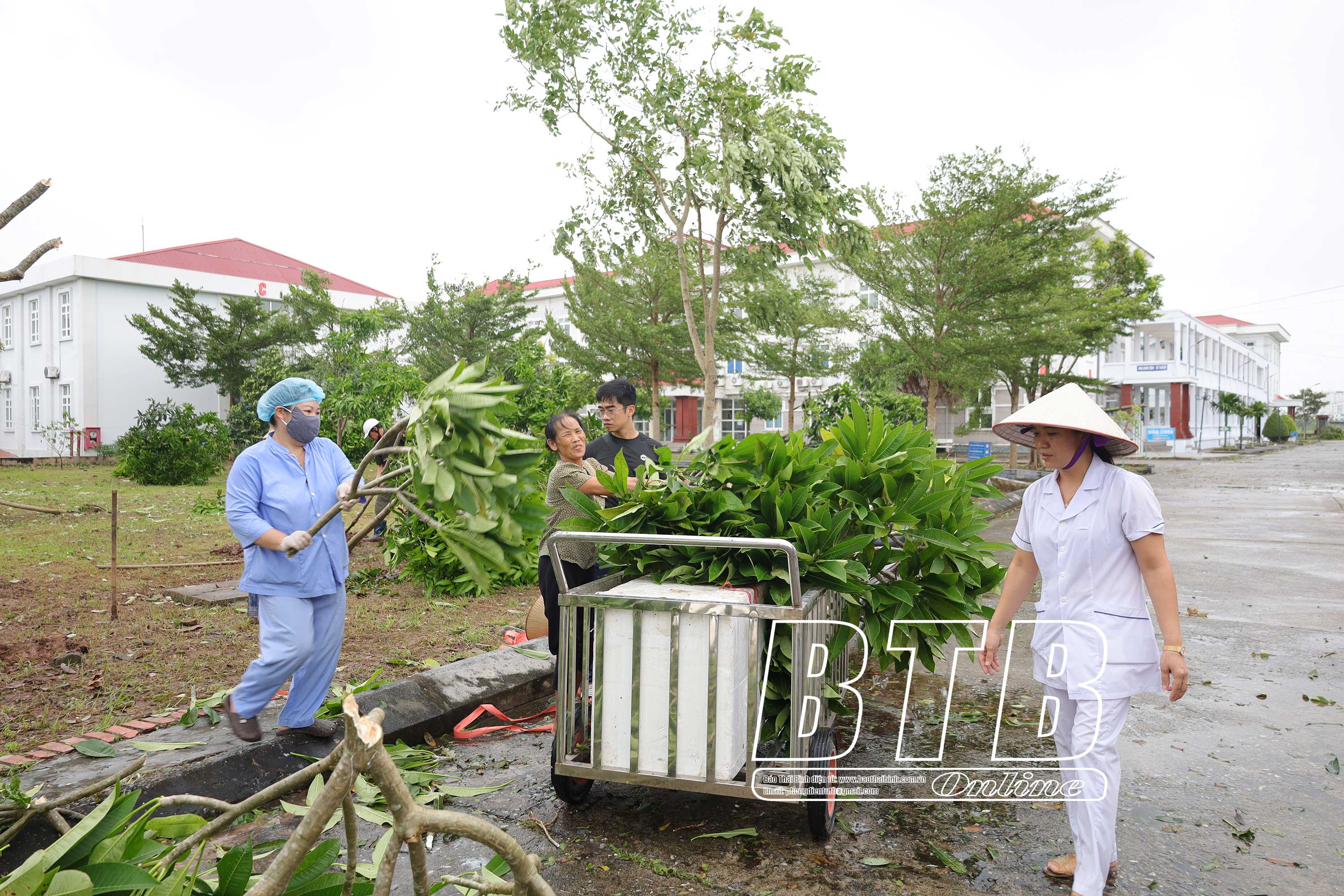Cán bộ, nhân viên Bệnh viện Phổi Thái Bình vệ sinh khuôn viên sau bão. Ảnh: Hoàng Lanh