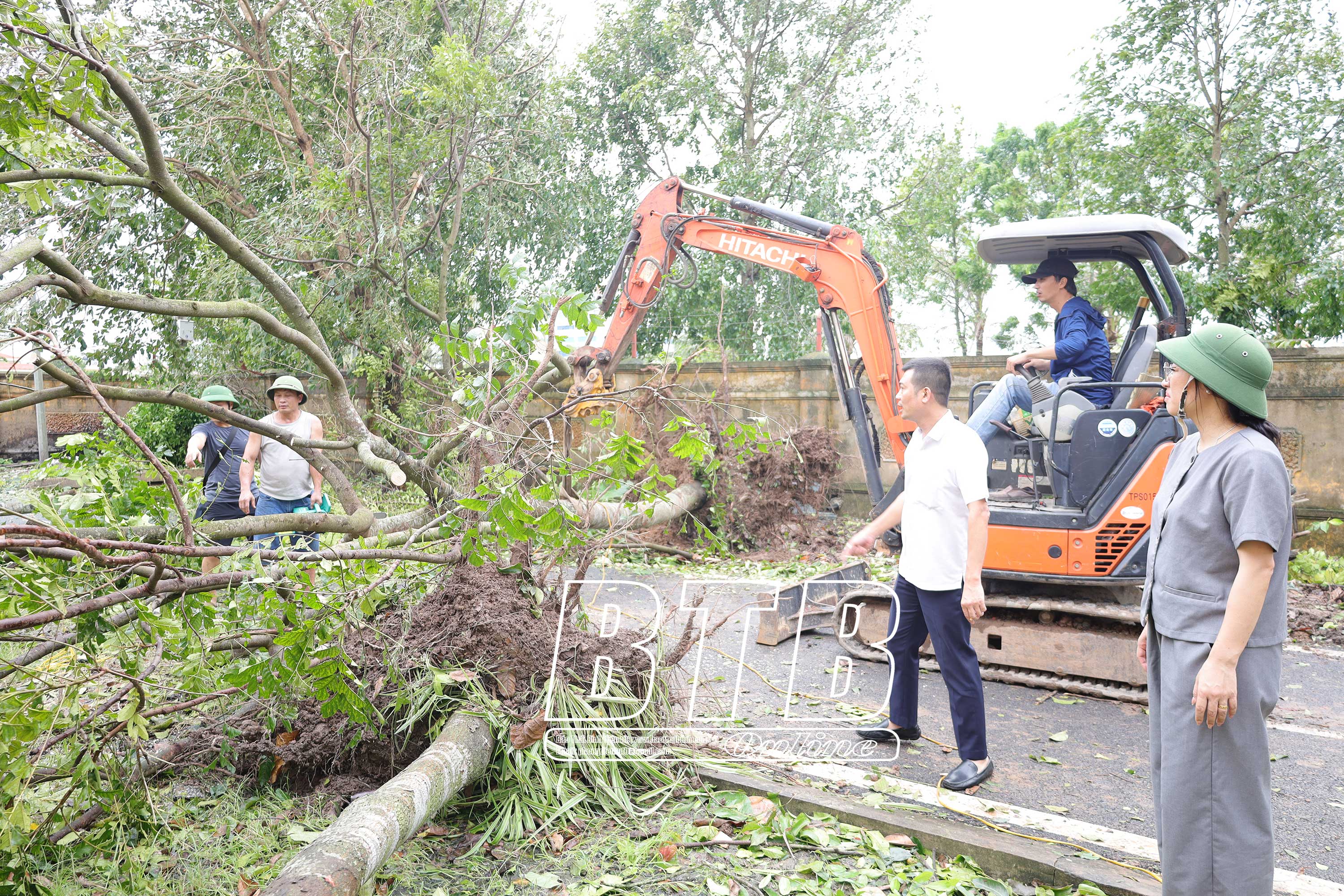 Các lực lượng chức năng xã Đông Phương xử lý cây xanh bị đổ sau bão. Ảnh Thu Hiền