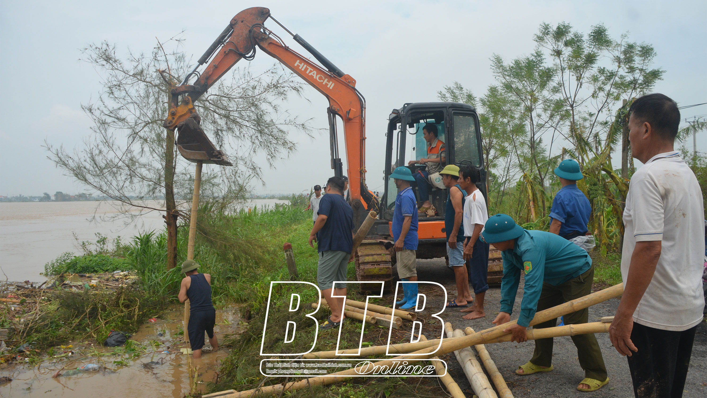 Quyết tâm bảo vệ đê không bị sạt lở, Ban Chỉ huy Quân sự huyện Quỳnh Phụ cùng lực lượng dân quân tự vệ của xã đã tập kết tại các điểm xung yếu kịp thời xử lý sự cố.