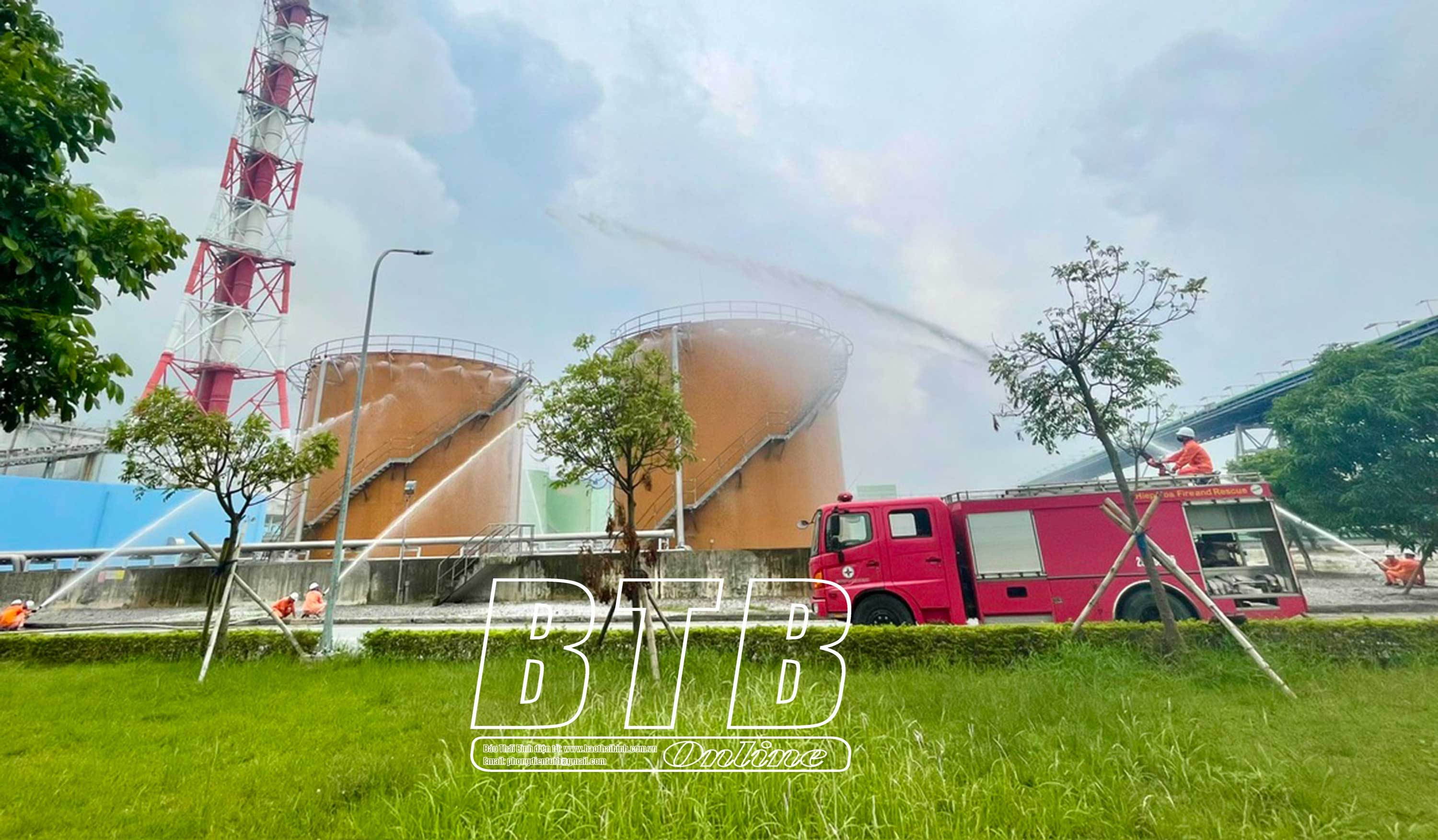 Lực lượng PCCC cơ sở Công ty Nhiệt điện Thái Bình diễn tập chữa cháy tại khu vực bể chứa dầu.