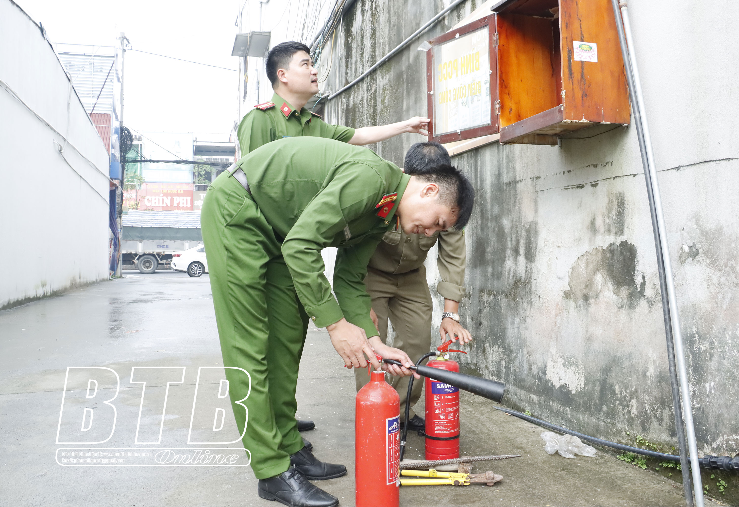 Công an thị trấn Đông Hưng kiểm tra tại điểm chữa cháy công cộng.