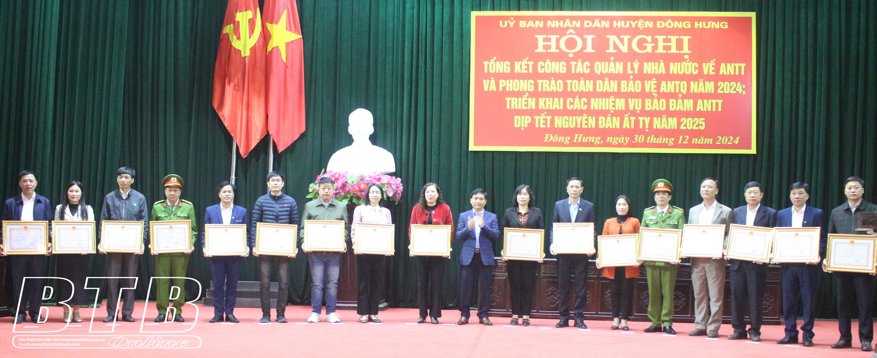 Lãnh đạo huyện Đông Hưng trao giấy khen của UBND huyện cho các tập thể có thành tích xuất sắc trong phong trào toàn dân bảo vệ ANTQ và thực hiện các chuyên đề bảo vệ ANTT năm 2024.