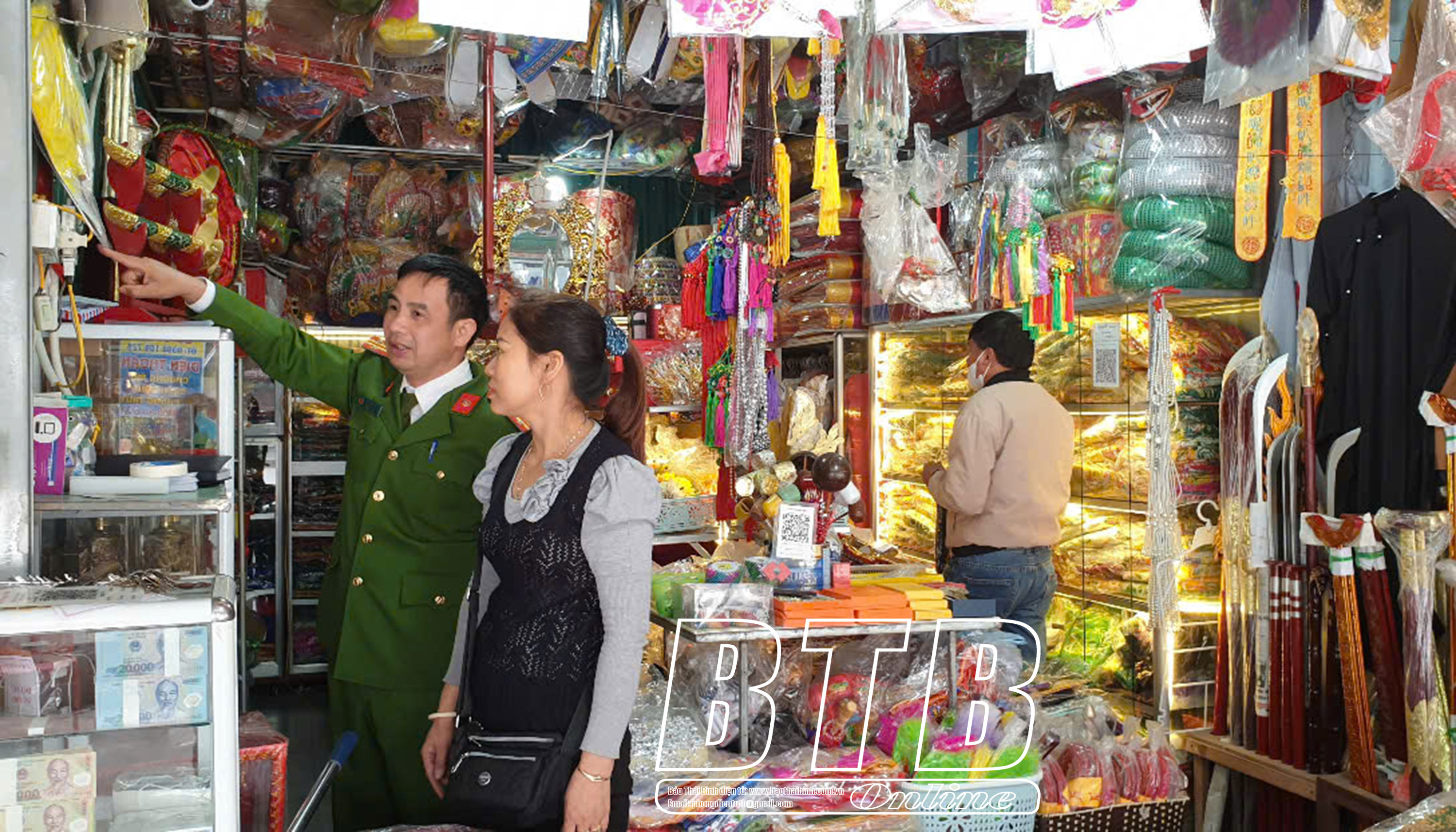 Đội Cảnh sát PCCC và CNCH, Công an huyện Quỳnh Phụ kiểm tra, nhắc nhở các hộ kinh doanh tại đền Đồng Bằng chấp hành nghiêm các quy định về phòng, chống cháy nổ.
