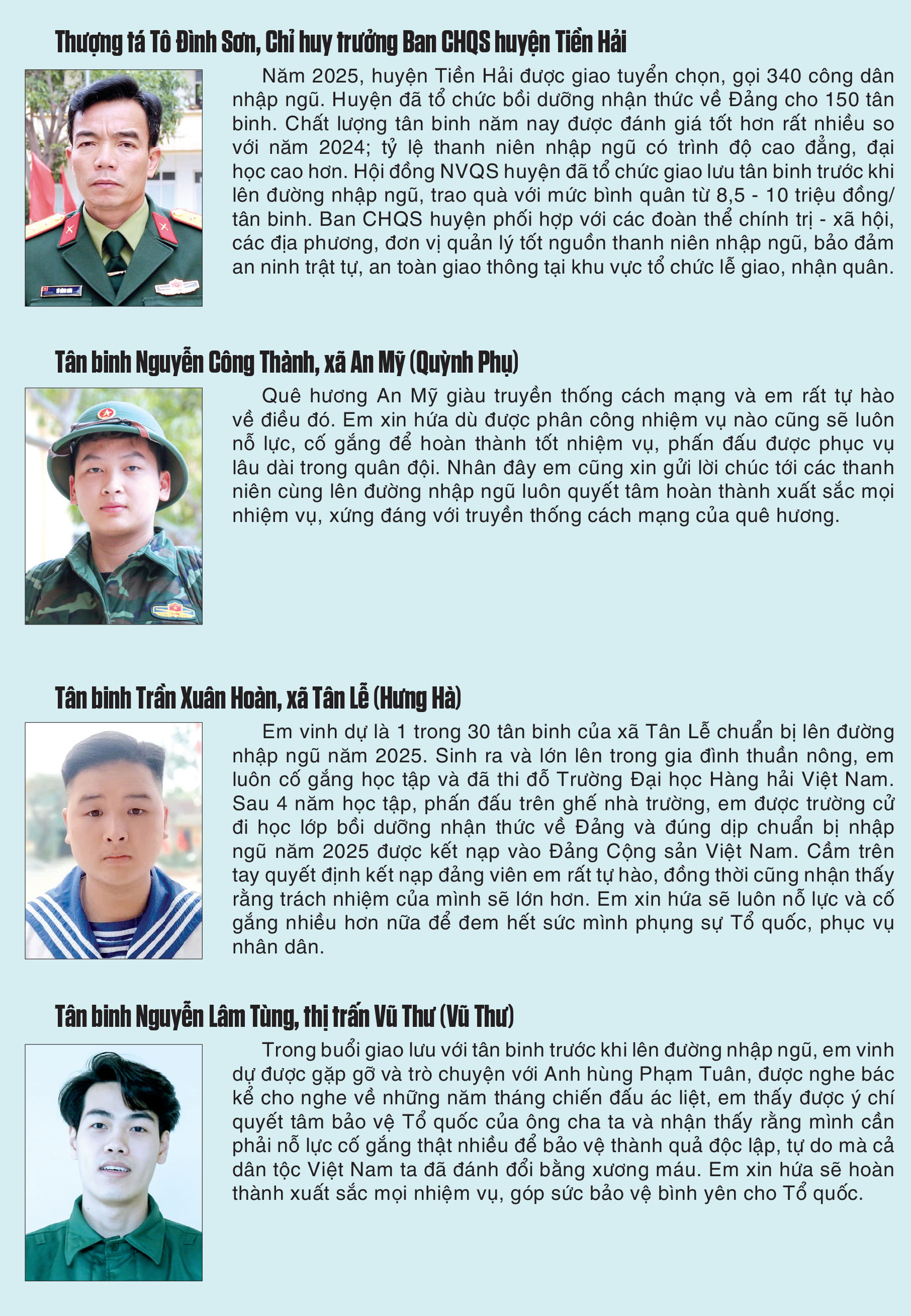 Tiếp nối truyền thống của các thế hệ cha anh, mang theo nhiệt huyết, khát vọng cống hiến của tuổi trẻ, những thanh niên ưu tú của Thái Bình đã sẵn sàng lên đường về đơn vị mới, sẵn sàng nhận và hoàn thành mọi nhiệm vụ được giao, đóng góp công sức, trí tuệ xây dựng và bảo vệ vững chắc Tổ quốc Việt Nam xã hội chủ nghĩa.