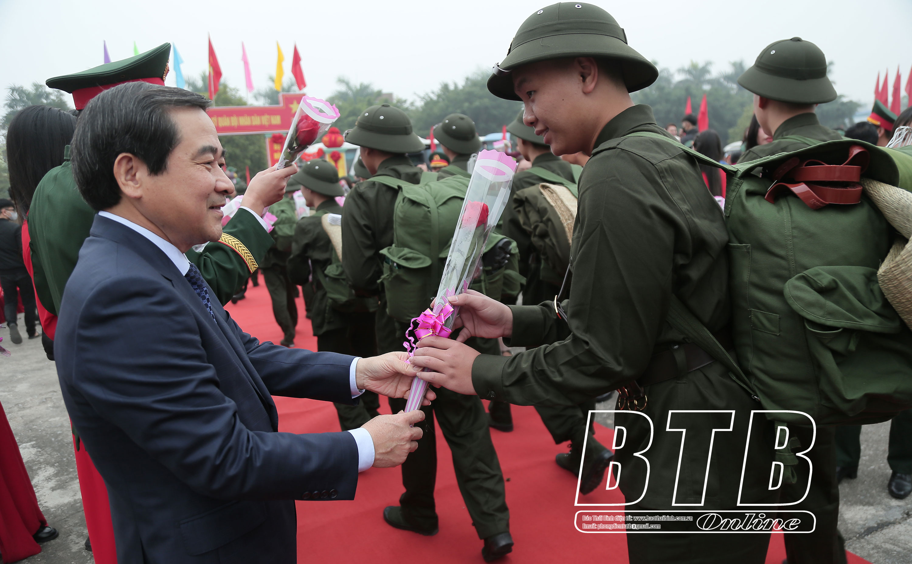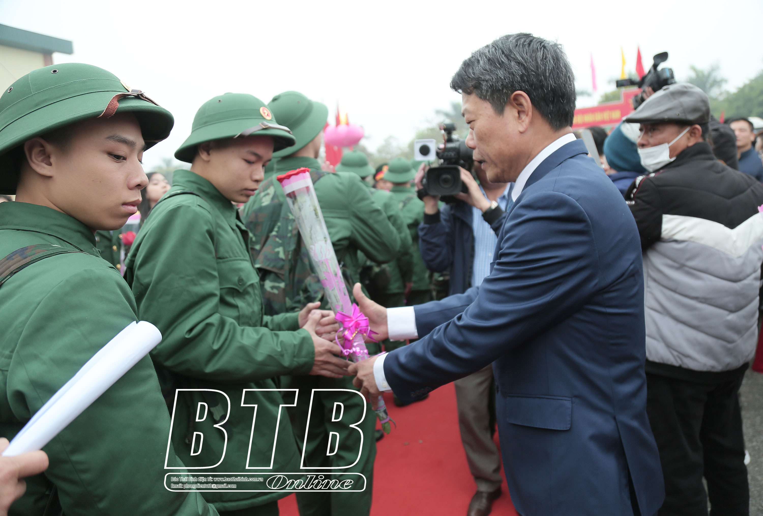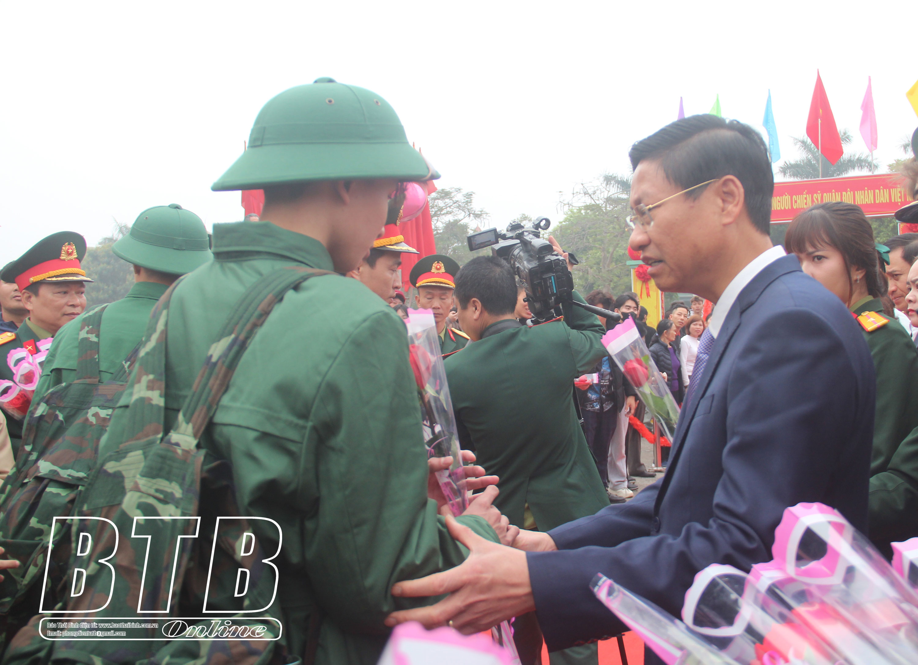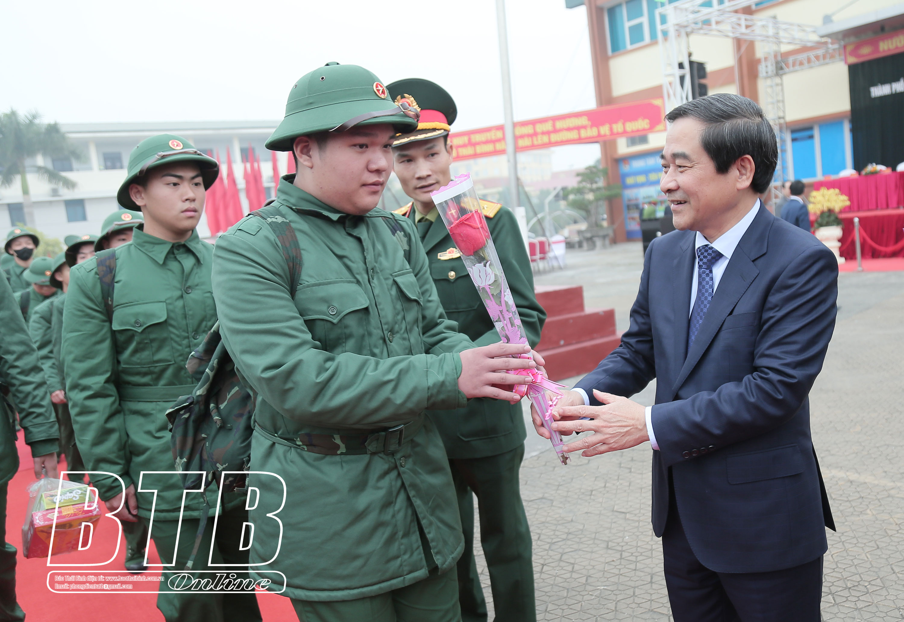 Lãnh đạo thành phố Thái Bình tặng hoa động viên các tân binh.