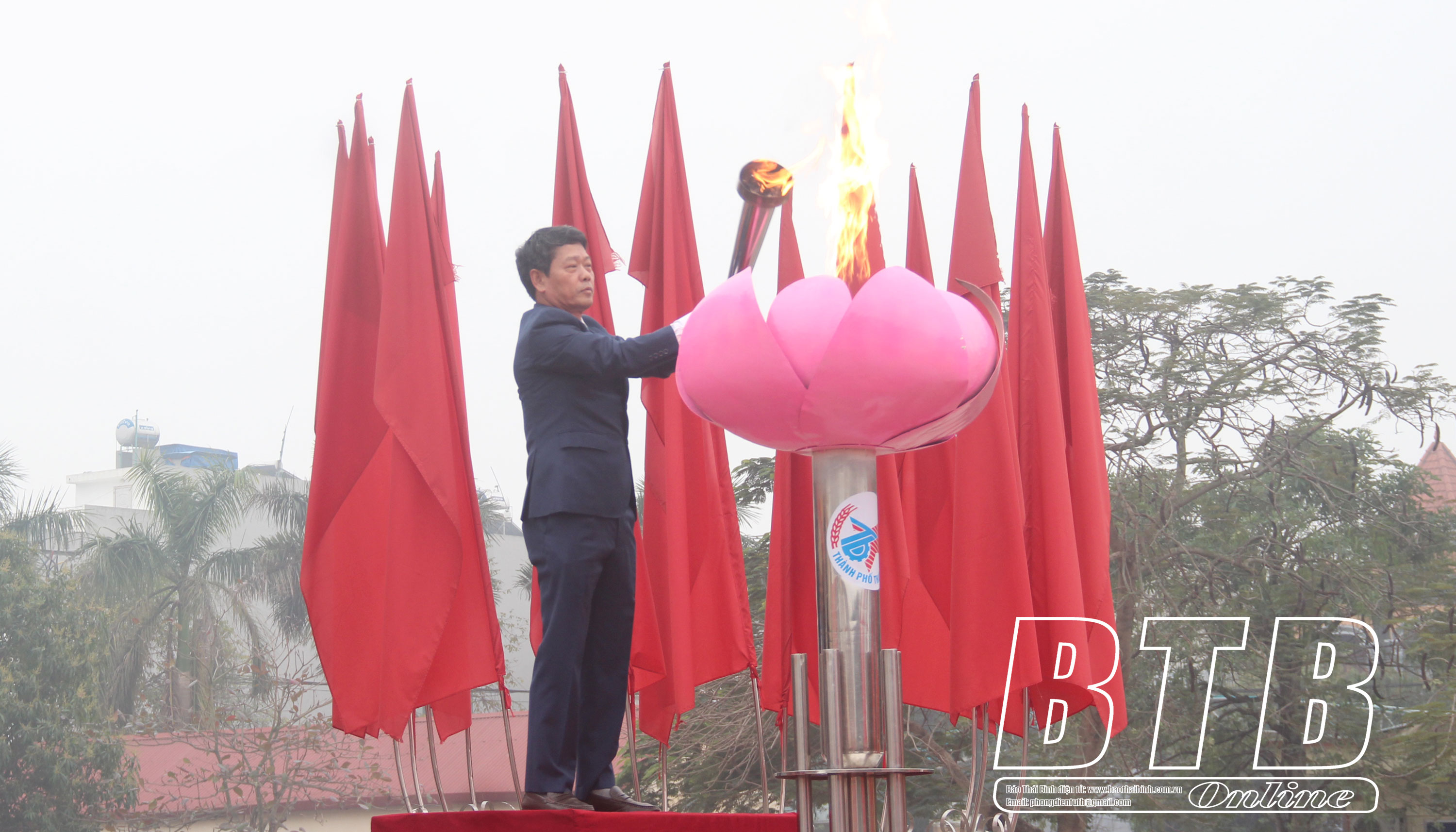 Đồng chí Hoàng Văn Thành, Ủy viên Ban Thường vụ Tỉnh ủy, Bí thư Thành ủy, Chủ tịch HĐND thành phố thực hiện nghi thức thắp lửa truyền thống.