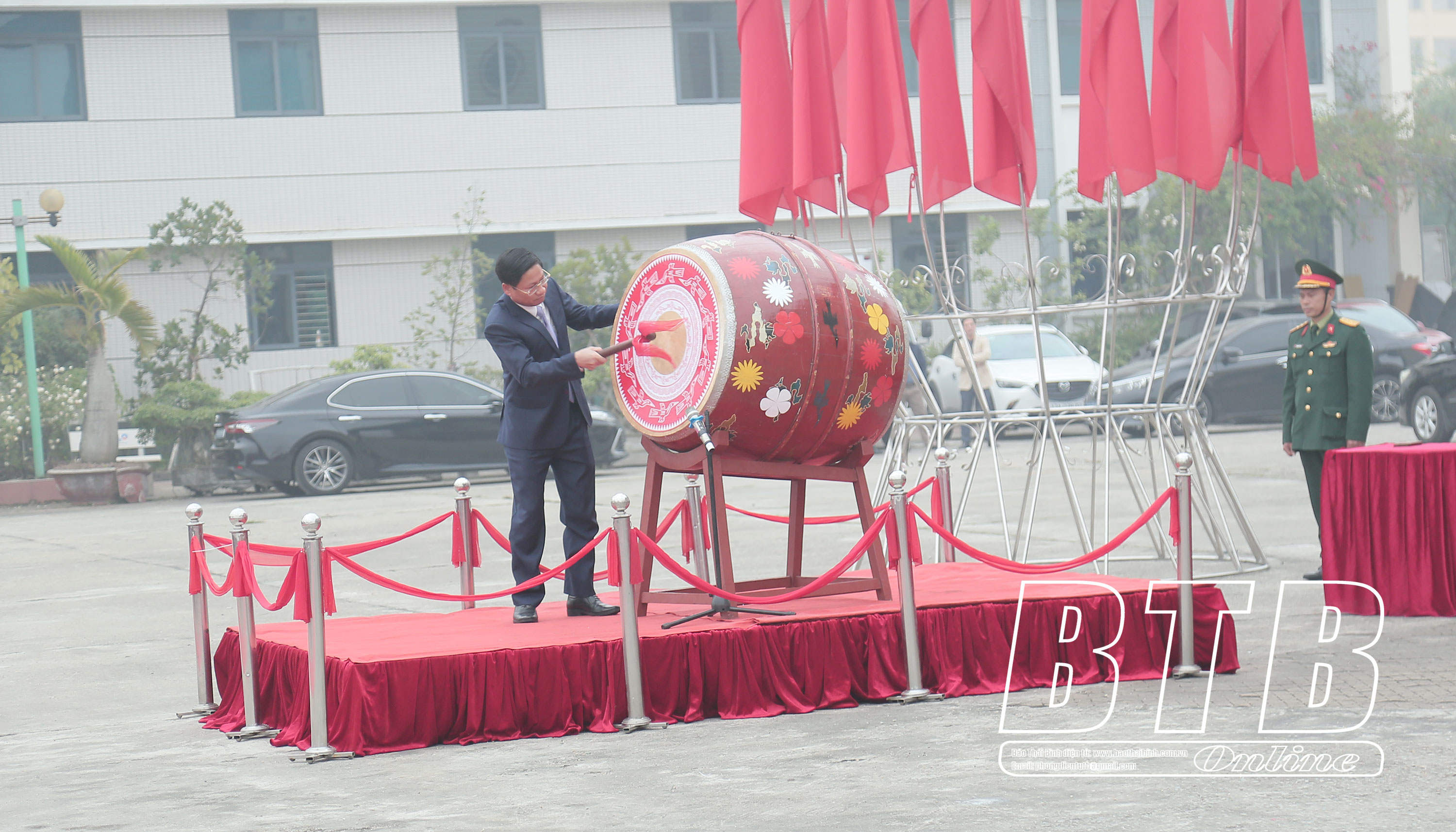 Lãnh đạo UBND thành phố Thái Bình thực hiện nghi thức đánh trống tại lễ giao, nhận quân năm 2025.