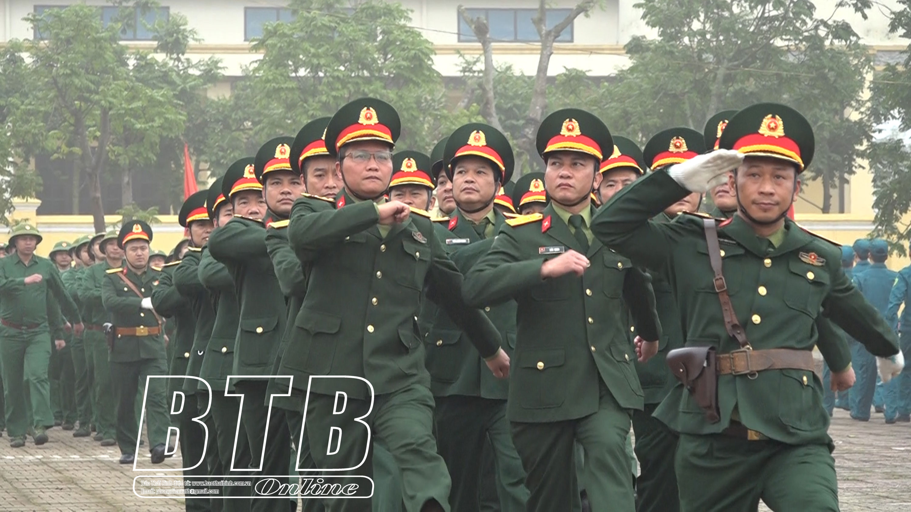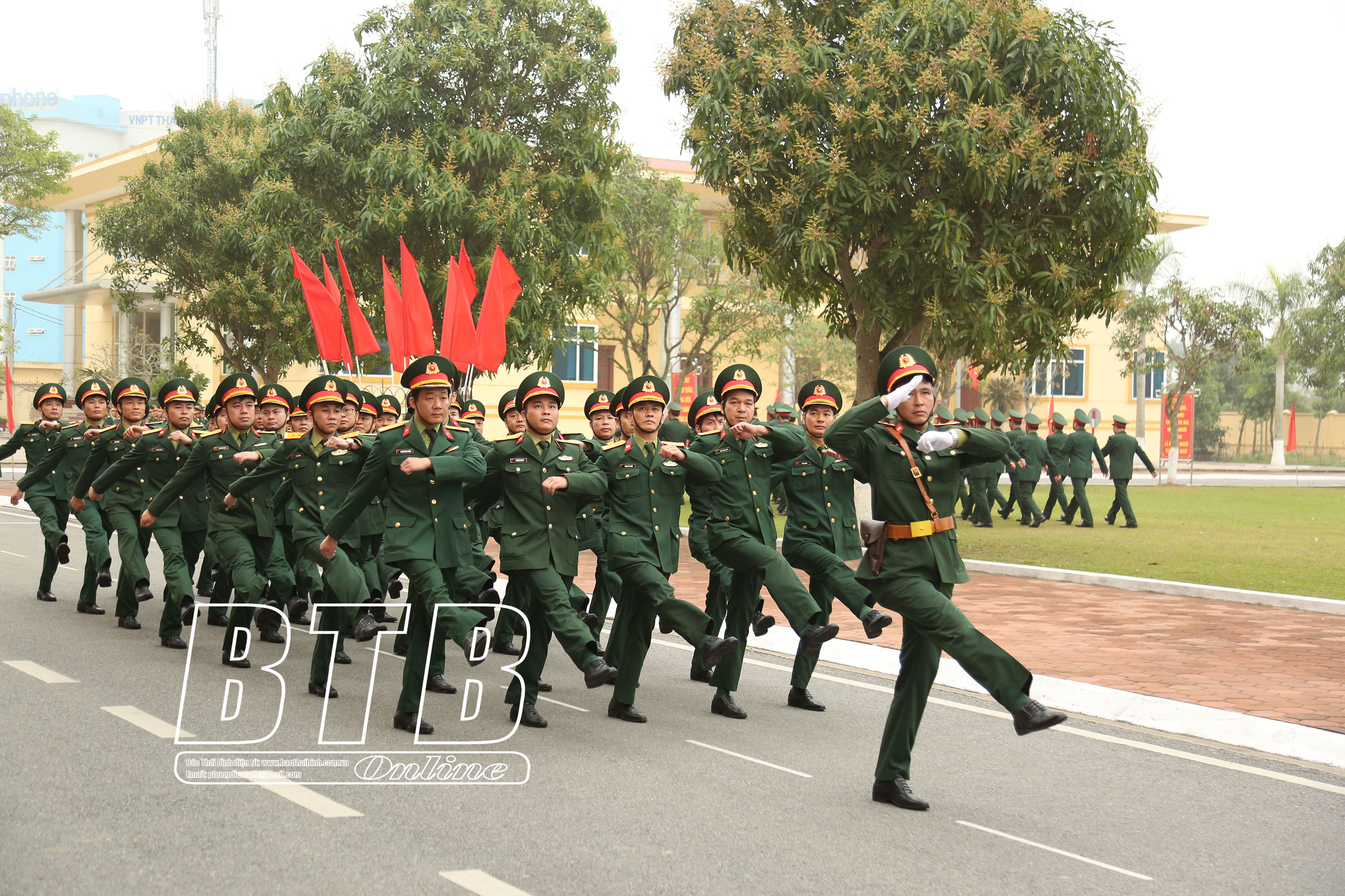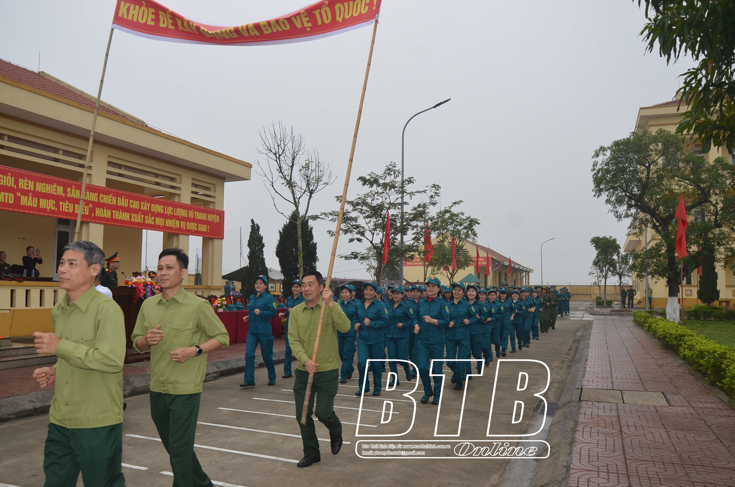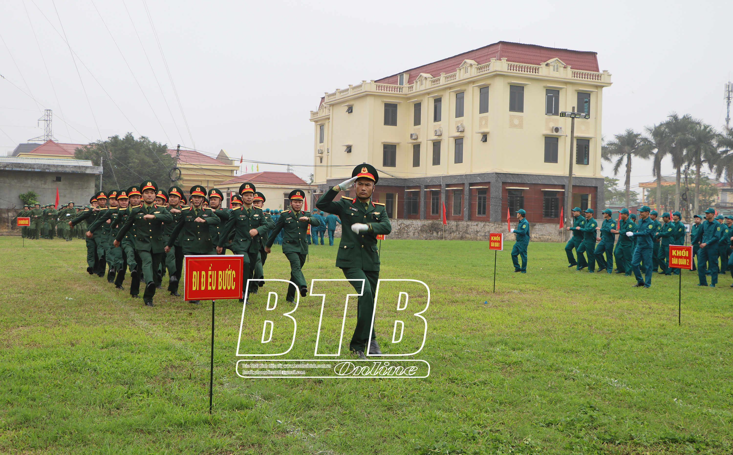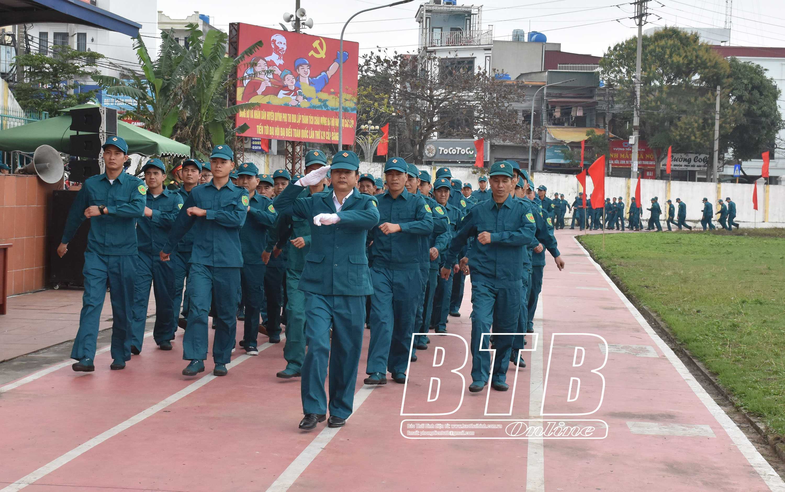 Lãnh đạo huyện Kiến Xương tham quan khu trưng bày mô hình học cụ, giáo án, vật chất huấn luyện tại lễ ra quân. Ảnh: Thu Thủy Diễu hành biểu dương lực lượng tại lễ ra quân huấn luyện. Ảnh: Thu Thủy