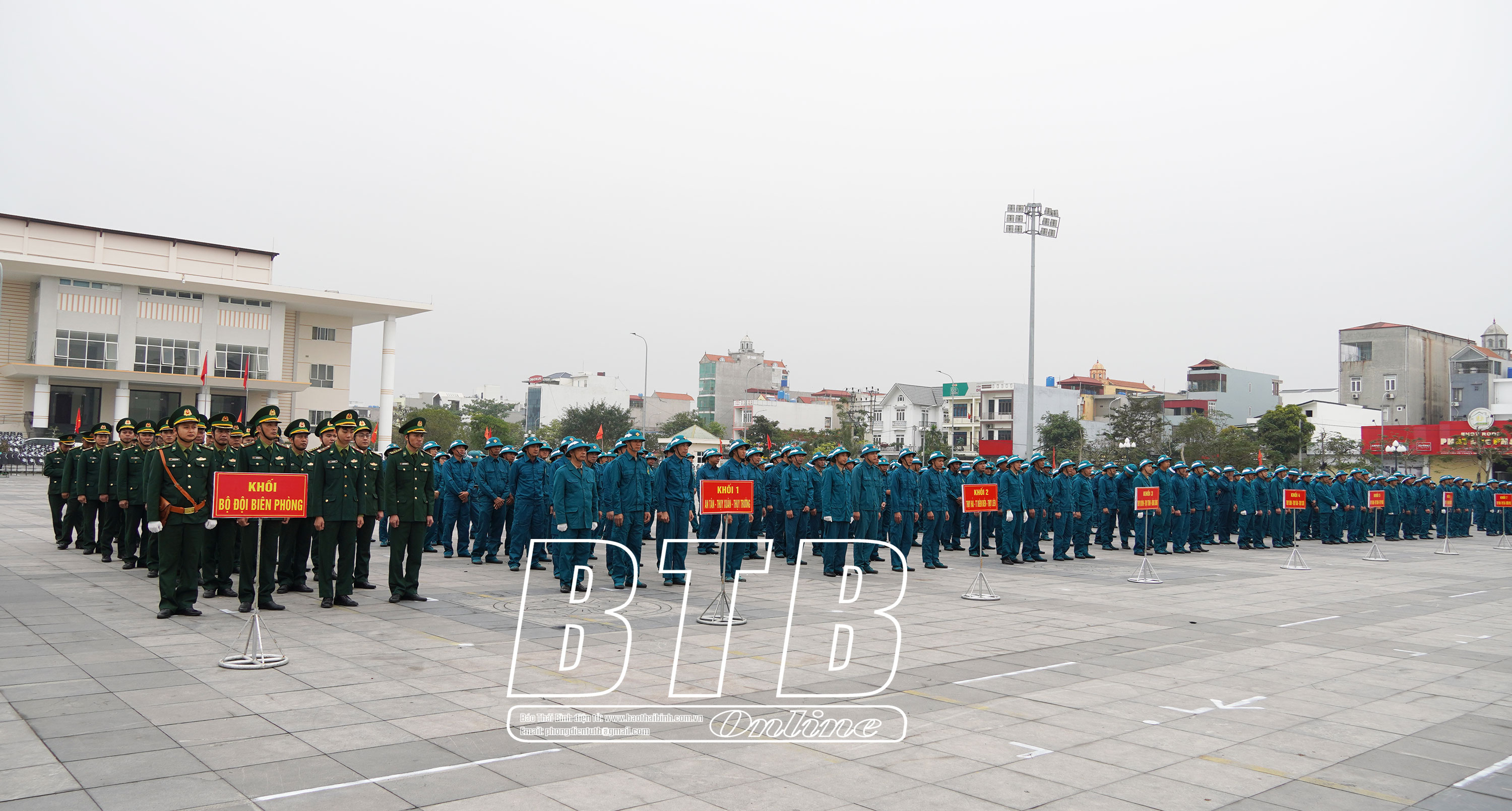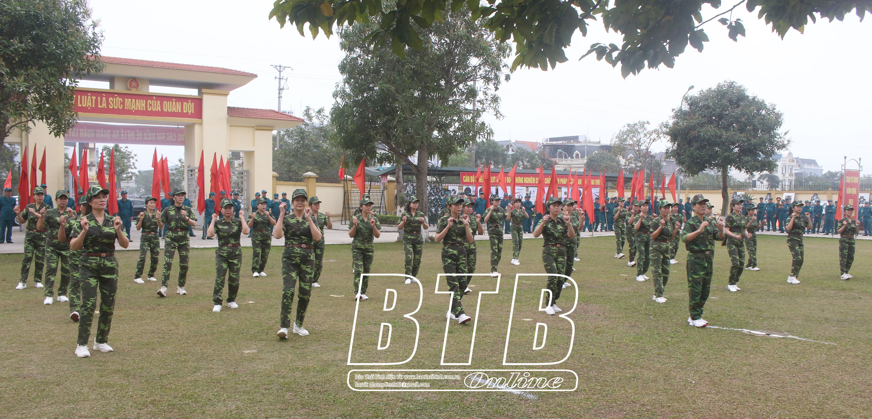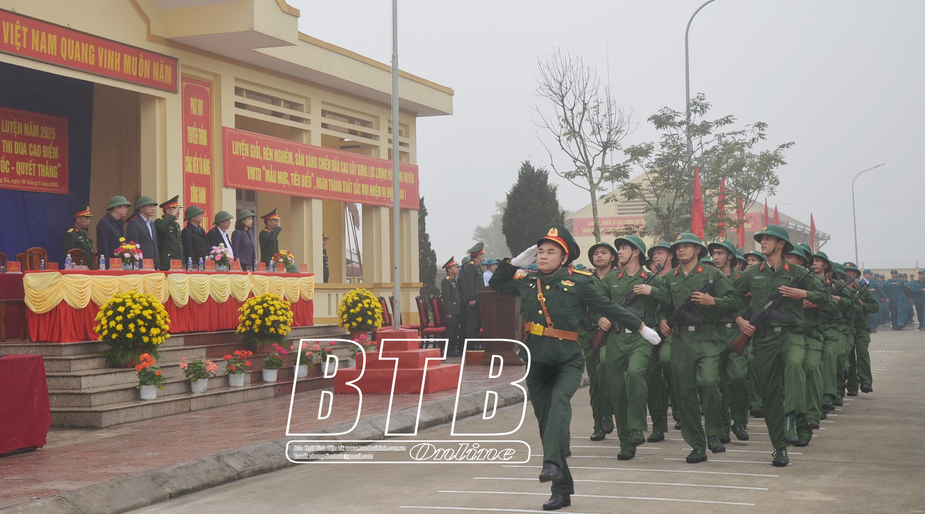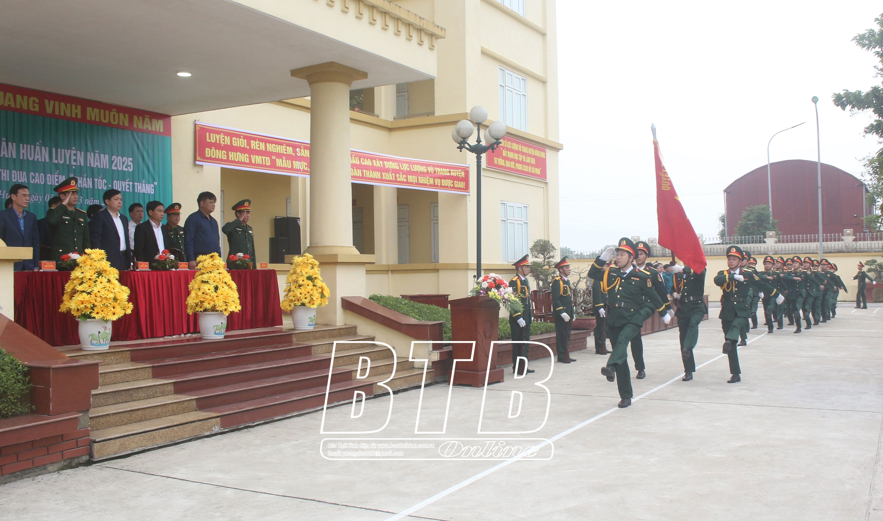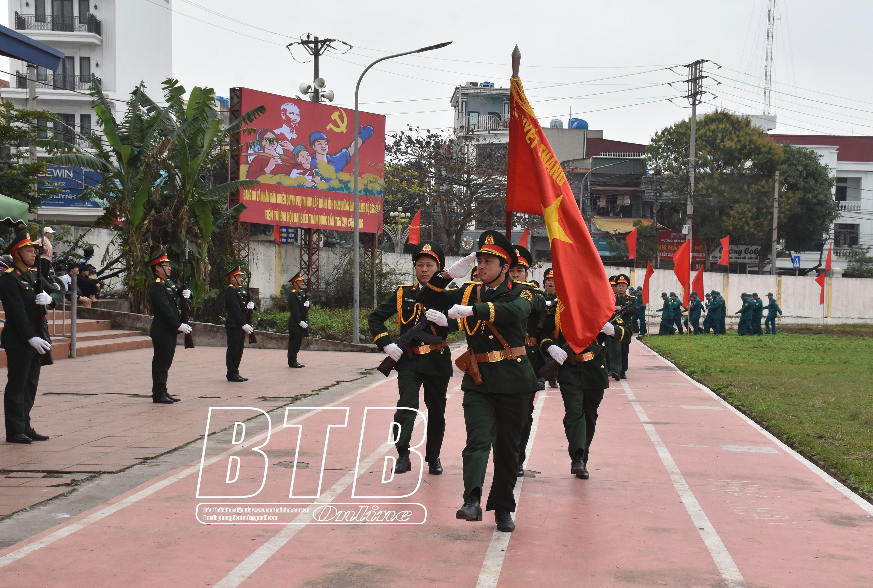 Lãnh đạo huyện Kiến Xương tham quan khu trưng bày mô hình học cụ, giáo án, vật chất huấn luyện tại lễ ra quân. Ảnh: Thu Thủy Diễu hành biểu dương lực lượng tại lễ ra quân huấn luyện. Ảnh: Thu Thủy