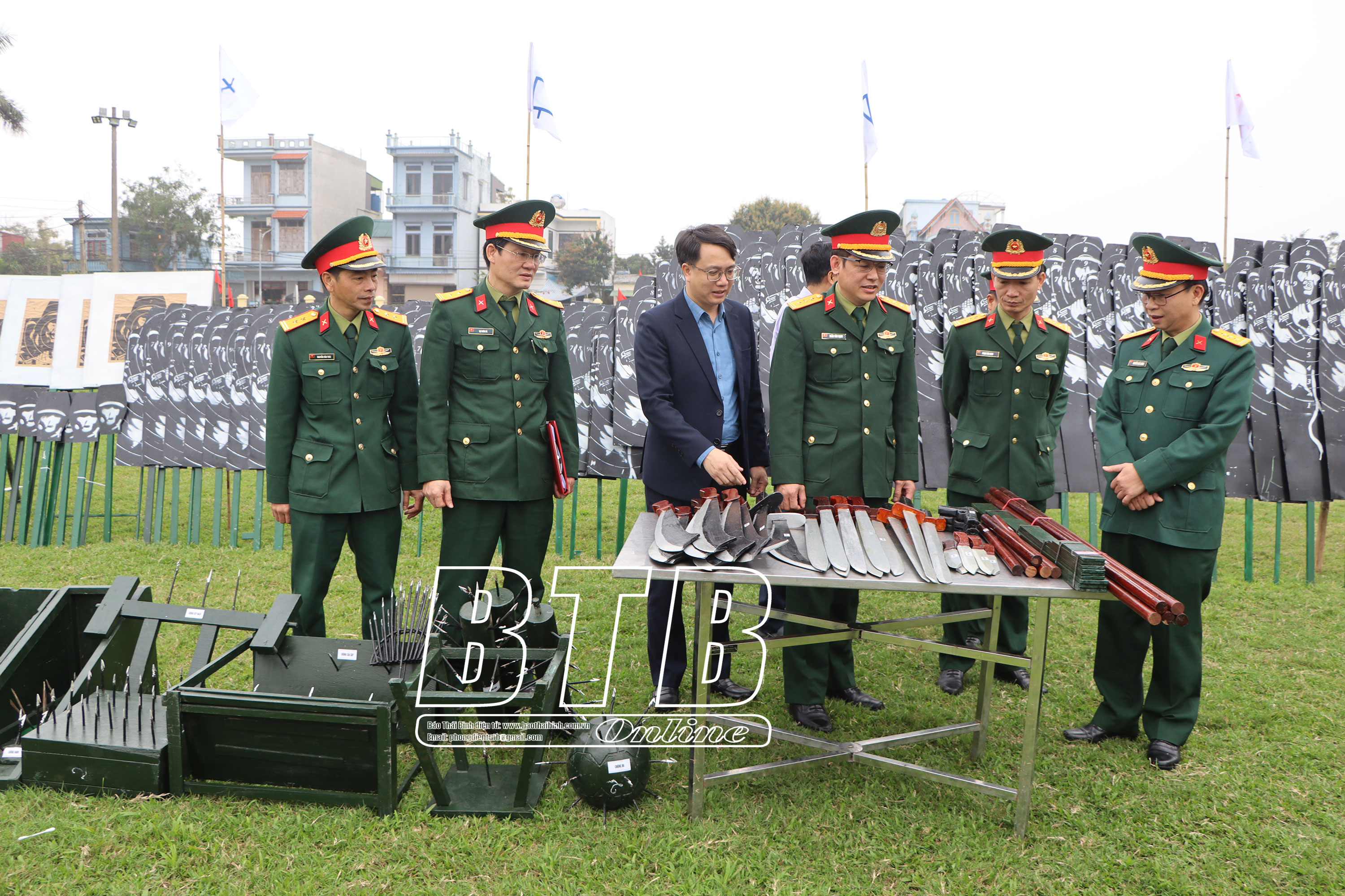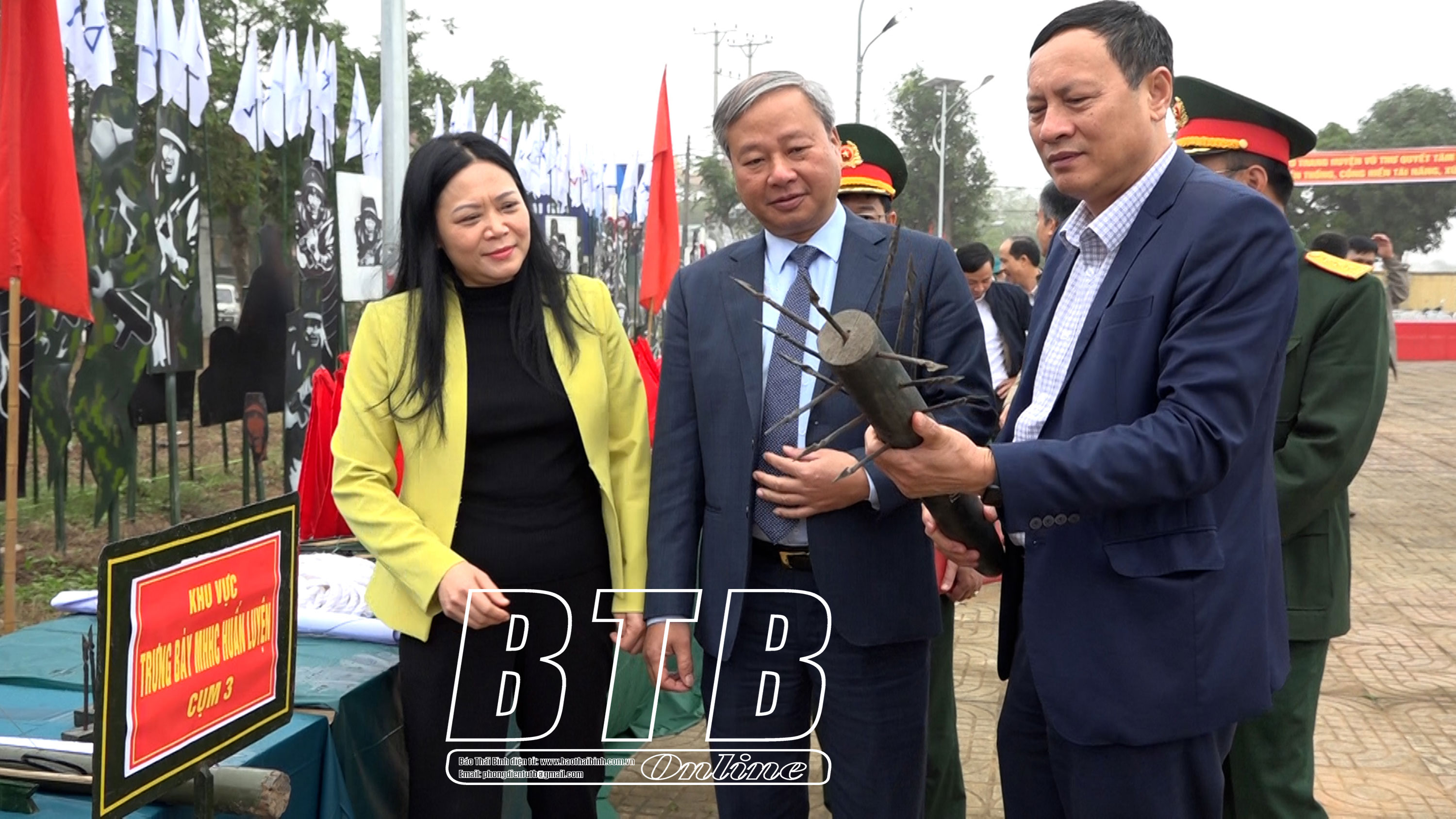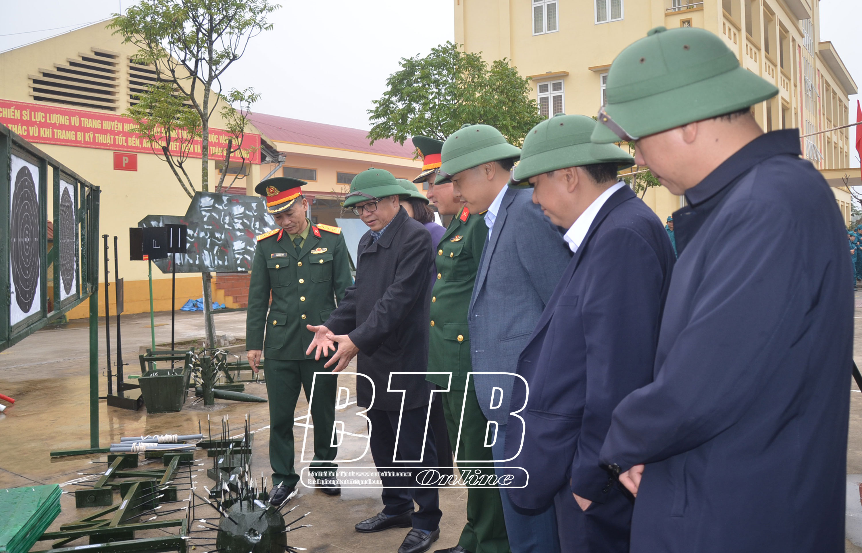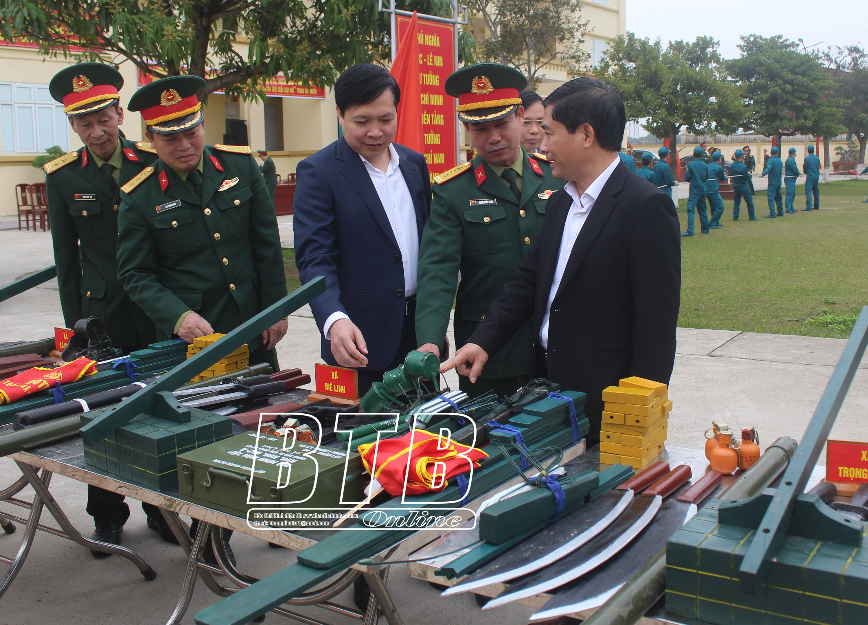 Lãnh đạo huyện Thái Thụy và đại biểu dự lễ ra quân huấn luyện năm 2025. Ảnh: Nguyễn Thắm Lãnh đạo huyện Thái Thụy và đại biểu tham quan mô hình học cụ phục vụ cho nhiệm vụ huấn luyện. Ảnh: Nguyễn Thắm
