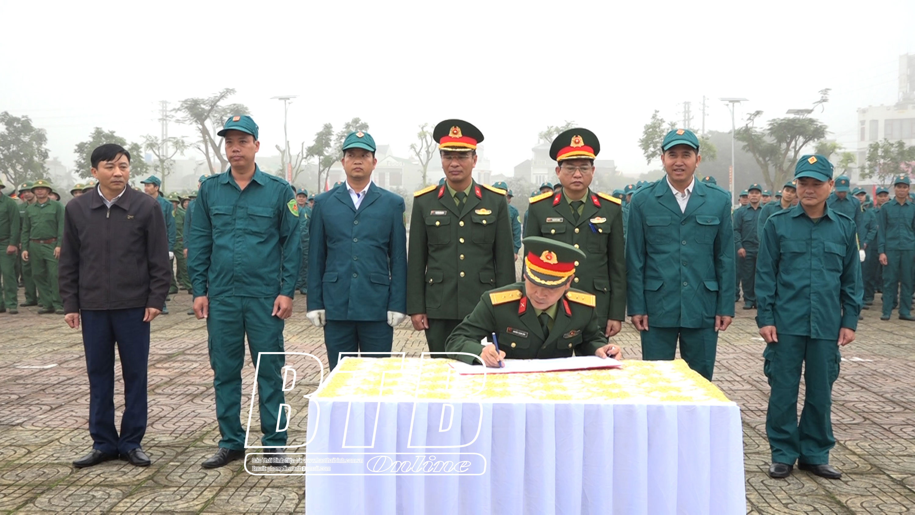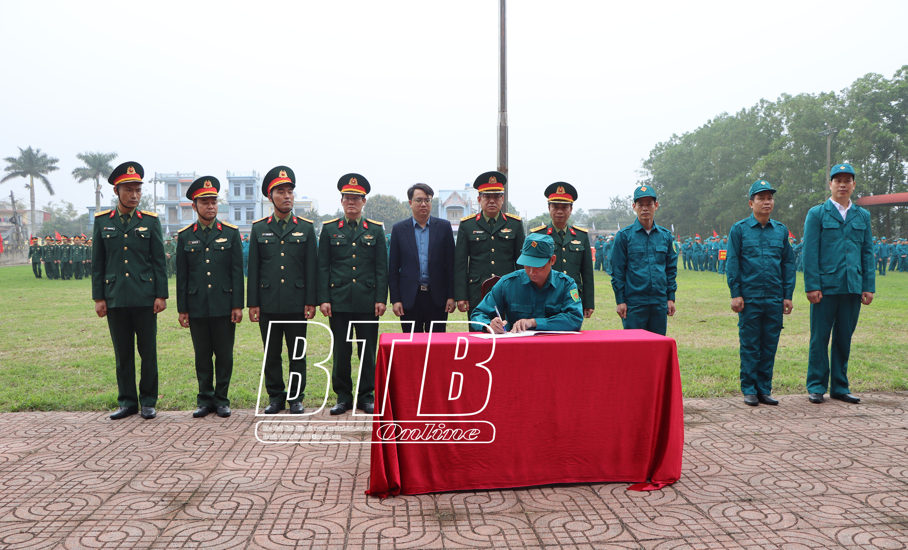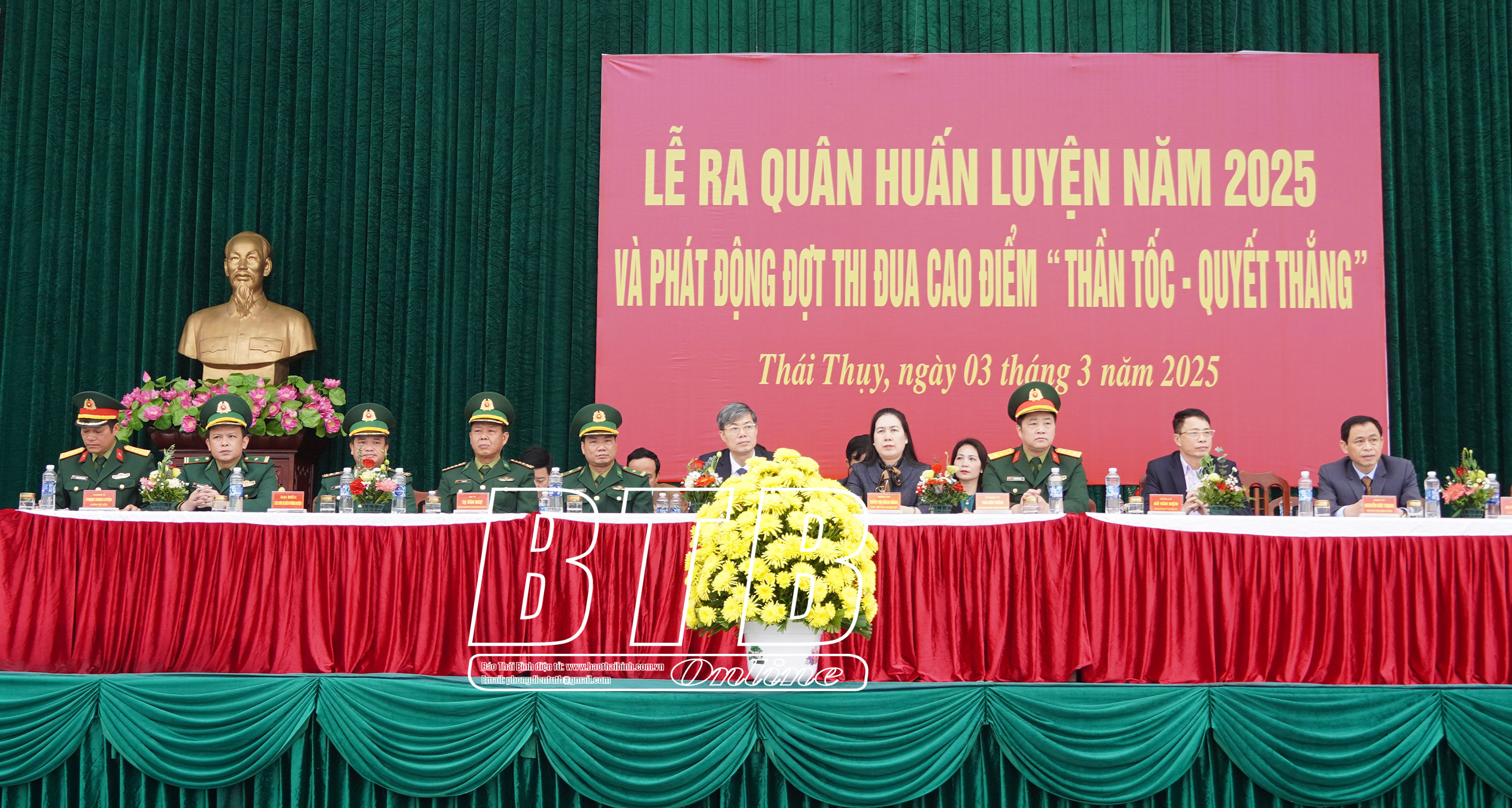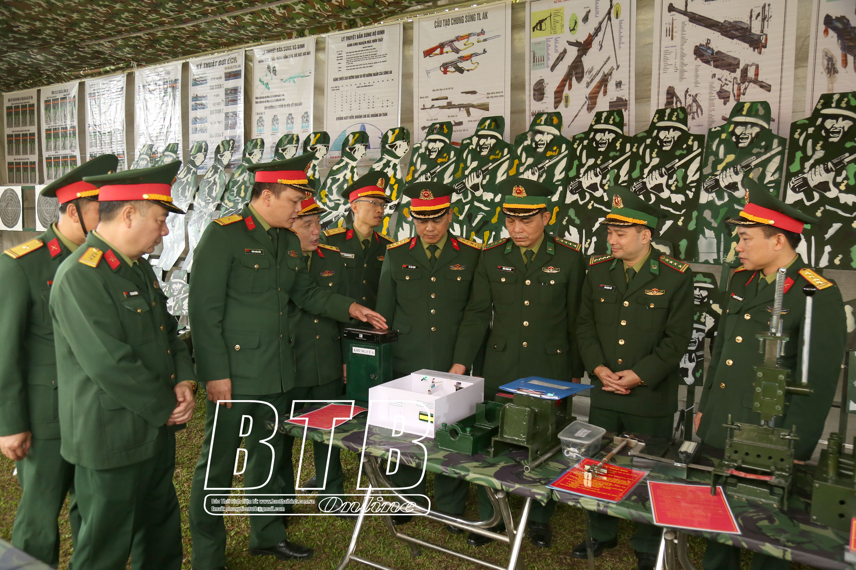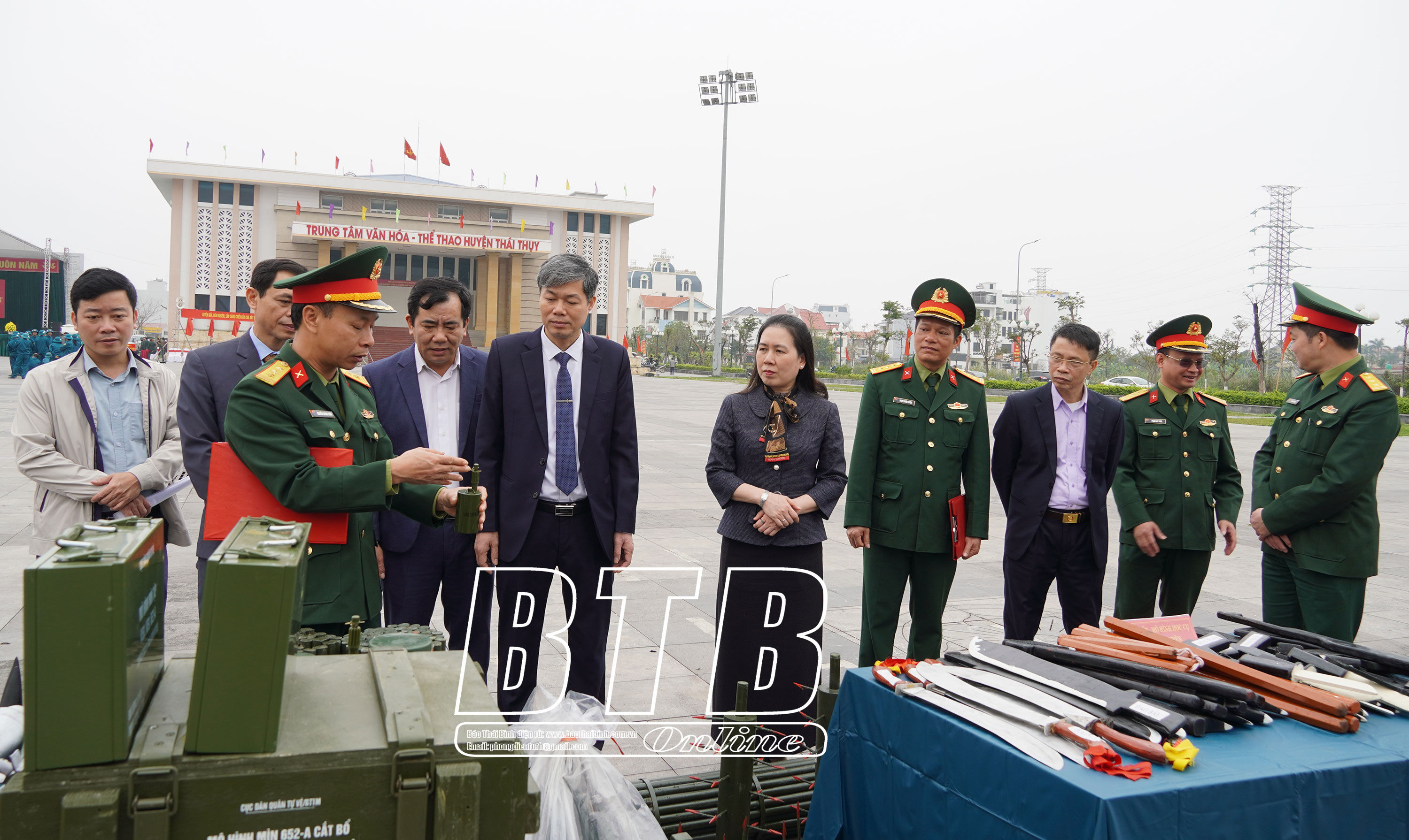 Lãnh đạo huyện Thái Thụy và đại biểu dự lễ ra quân huấn luyện năm 2025. Ảnh: Nguyễn Thắm Lãnh đạo huyện Thái Thụy và đại biểu tham quan mô hình học cụ phục vụ cho nhiệm vụ huấn luyện. Ảnh: Nguyễn Thắm